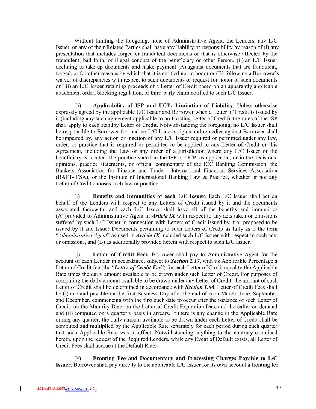4910-4316-88574908-9985-1611 v.27 40 Without limiting the foregoing, none of Administrative Agent, the Lenders, any L/C Issuer, or any of their Related Parties shall have any liability or responsibility by reason of (i) any presentation that includes forged or fraudulent documents or that is otherwise affected by the fraudulent, bad faith, or illegal conduct of the beneficiary or other Person, (ii) an L/C Issuer declining to take-up documents and make payment (A) against documents that are fraudulent, forged, or for other reasons by which that it is entitled not to honor or (B) following a Borrower’s waiver of discrepancies with respect to such documents or request for honor of such documents or (iii) an L/C Issuer retaining proceeds of a Letter of Credit based on an apparently applicable attachment order, blocking regulation, or third-party claim notified to such L/C Issuer. (h) Applicability of ISP and UCP; Limitation of Liability. Unless otherwise expressly agreed by the applicable L/C Issuer and Borrower when a Letter of Credit is issued by it (including any such agreement applicable to an Existing Letter of Credit), the rules of the ISP shall apply to each standby Letter of Credit. Notwithstanding the foregoing, no L/C Issuer shall be responsible to Borrower for, and no L/C Issuer’s rights and remedies against Borrower shall be impaired by, any action or inaction of any L/C Issuer required or permitted under any law, order, or practice that is required or permitted to be applied to any Letter of Credit or this Agreement, including the Law or any order of a jurisdiction where any L/C Issuer or the beneficiary is located, the practice stated in the ISP or UCP, as applicable, or in the decisions, opinions, practice statements, or official commentary of the ICC Banking Commission, the Bankers Association for Finance and Trade - International Financial Services Association (BAFT-IFSA), or the Institute of International Banking Law & Practice, whether or not any Letter of Credit chooses such law or practice. (i) Benefits and Immunities of each L/C Issuer. Each L/C Issuer shall act on behalf of the Lenders with respect to any Letters of Credit issued by it and the documents associated therewith, and each L/C Issuer shall have all of the benefits and immunities (A) provided to Administrative Agent in Article IX with respect to any acts taken or omissions suffered by such L/C Issuer in connection with Letters of Credit issued by it or proposed to be issued by it and Issuer Documents pertaining to such Letters of Credit as fully as if the term “Administrative Agent” as used in Article IX included such L/C Issuer with respect to such acts or omissions, and (B) as additionally provided herein with respect to such L/C Issuer. (j) Letter of Credit Fees. Borrower shall pay to Administrative Agent for the account of each Lender in accordance, subject to Section 2.17, with its Applicable Percentage a Letter of Credit fee (the “Letter of Credit Fee”) for each Letter of Credit equal to the Applicable Rate times the daily amount available to be drawn under such Letter of Credit. For purposes of computing the daily amount available to be drawn under any Letter of Credit, the amount of such Letter of Credit shall be determined in accordance with Section 1.06. Letter of Credit Fees shall be (i) due and payable on the first Business Day after the end of each March, June, September and December, commencing with the first such date to occur after the issuance of such Letter of Credit, on the Maturity Date, on the Letter of Credit Expiration Date and thereafter on demand and (ii) computed on a quarterly basis in arrears. If there is any change in the Applicable Rate during any quarter, the daily amount available to be drawn under each Letter of Credit shall be computed and multiplied by the Applicable Rate separately for each period during such quarter that such Applicable Rate was in effect. Notwithstanding anything to the contrary contained herein, upon the request of the Required Lenders, while any Event of Default exists, all Letter of Credit Fees shall accrue at the Default Rate. (k) Fronting Fee and Documentary and Processing Charges Payable to L/C Issuer. Borrower shall pay directly to the applicable L/C Issuer for its own account a fronting fee