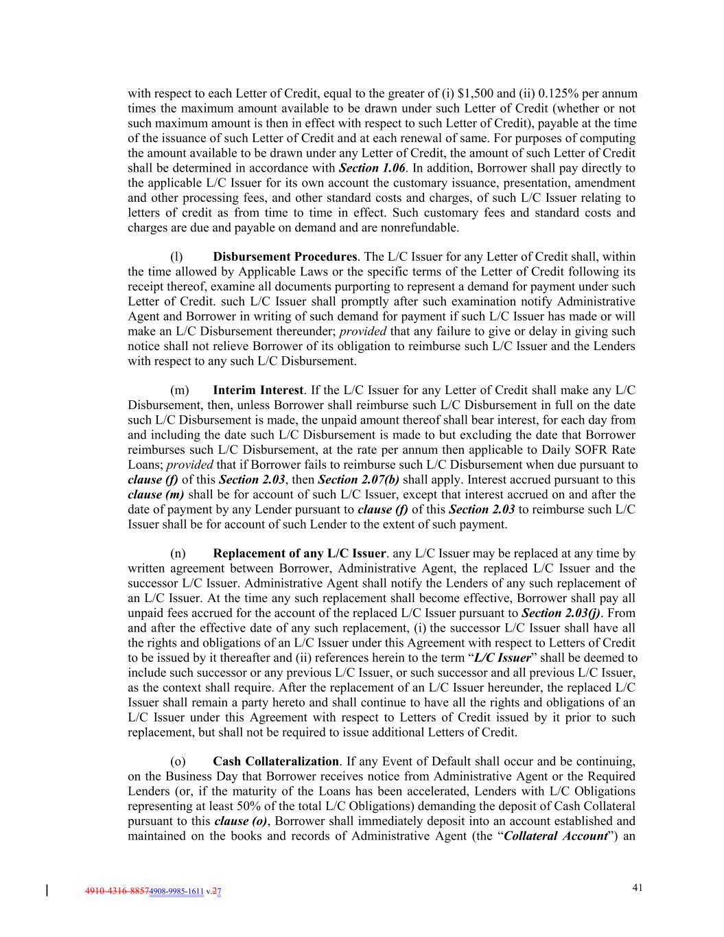 4910-4316-88574908-9985-1611 v.27 41 with respect to each Letter of Credit, equal to the greater of (i) $1,500 and (ii) 0.125% per annum times the maximum amount available to be drawn under such Letter of Credit (whether or not such maximum amount is then in effect with respect to such Letter of Credit), payable at the time of the issuance of such Letter of Credit and at each renewal of same. For purposes of computing the amount available to be drawn under any Letter of Credit, the amount of such Letter of Credit shall be determined in accordance with Section 1.06. In addition, Borrower shall pay directly to the applicable L/C Issuer for its own account the customary issuance, presentation, amendment and other processing fees, and other standard costs and charges, of such L/C Issuer relating to letters of credit as from time to time in effect. Such customary fees and standard costs and charges are due and payable on demand and are nonrefundable. (l) Disbursement Procedures. The L/C Issuer for any Letter of Credit shall, within the time allowed by Applicable Laws or the specific terms of the Letter of Credit following its receipt thereof, examine all documents purporting to represent a demand for payment under such Letter of Credit. such L/C Issuer shall promptly after such examination notify Administrative Agent and Borrower in writing of such demand for payment if such L/C Issuer has made or will make an L/C Disbursement thereunder; provided that any failure to give or delay in giving such notice shall not relieve Borrower of its obligation to reimburse such L/C Issuer and the Lenders with respect to any such L/C Disbursement. (m) Interim Interest. If the L/C Issuer for any Letter of Credit shall make any L/C Disbursement, then, unless Borrower shall reimburse such L/C Disbursement in full on the date such L/C Disbursement is made, the unpaid amount thereof shall bear interest, for each day from and including the date such L/C Disbursement is made to but excluding the date that Borrower reimburses such L/C Disbursement, at the rate per annum then applicable to Daily SOFR Rate Loans; provided that if Borrower fails to reimburse such L/C Disbursement when due pursuant to clause (f) of this Section 2.03, then Section 2.07(b) shall apply. Interest accrued pursuant to this clause (m) shall be for account of such L/C Issuer, except that interest accrued on and after the date of payment by any Lender pursuant to clause (f) of this Section 2.03 to reimburse such L/C Issuer shall be for account of such Lender to the extent of such payment. (n) Replacement of any L/C Issuer. any L/C Issuer may be replaced at any time by written agreement between Borrower, Administrative Agent, the replaced L/C Issuer and the successor L/C Issuer. Administrative Agent shall notify the Lenders of any such replacement of an L/C Issuer. At the time any such replacement shall become effective, Borrower shall pay all unpaid fees accrued for the account of the replaced L/C Issuer pursuant to Section 2.03(j). From and after the effective date of any such replacement, (i) the successor L/C Issuer shall have all the rights and obligations of an L/C Issuer under this Agreement with respect to Letters of Credit to be issued by it thereafter and (ii) references herein to the term “L/C Issuer” shall be deemed to include such successor or any previous L/C Issuer, or such successor and all previous L/C Issuer, as the context shall require. After the replacement of an L/C Issuer hereunder, the replaced L/C Issuer shall remain a party hereto and shall continue to have all the rights and obligations of an L/C Issuer under this Agreement with respect to Letters of Credit issued by it prior to such replacement, but shall not be required to issue additional Letters of Credit. (o) Cash Collateralization. If any Event of Default shall occur and be continuing, on the Business Day that Borrower receives notice from Administrative Agent or the Required Lenders (or, if the maturity of the Loans has been accelerated, Lenders with L/C Obligations representing at least 50% of the total L/C Obligations) demanding the deposit of Cash Collateral pursuant to this clause (o), Borrower shall immediately deposit into an account established and maintained on the books and records of Administrative Agent (the “Collateral Account”) an