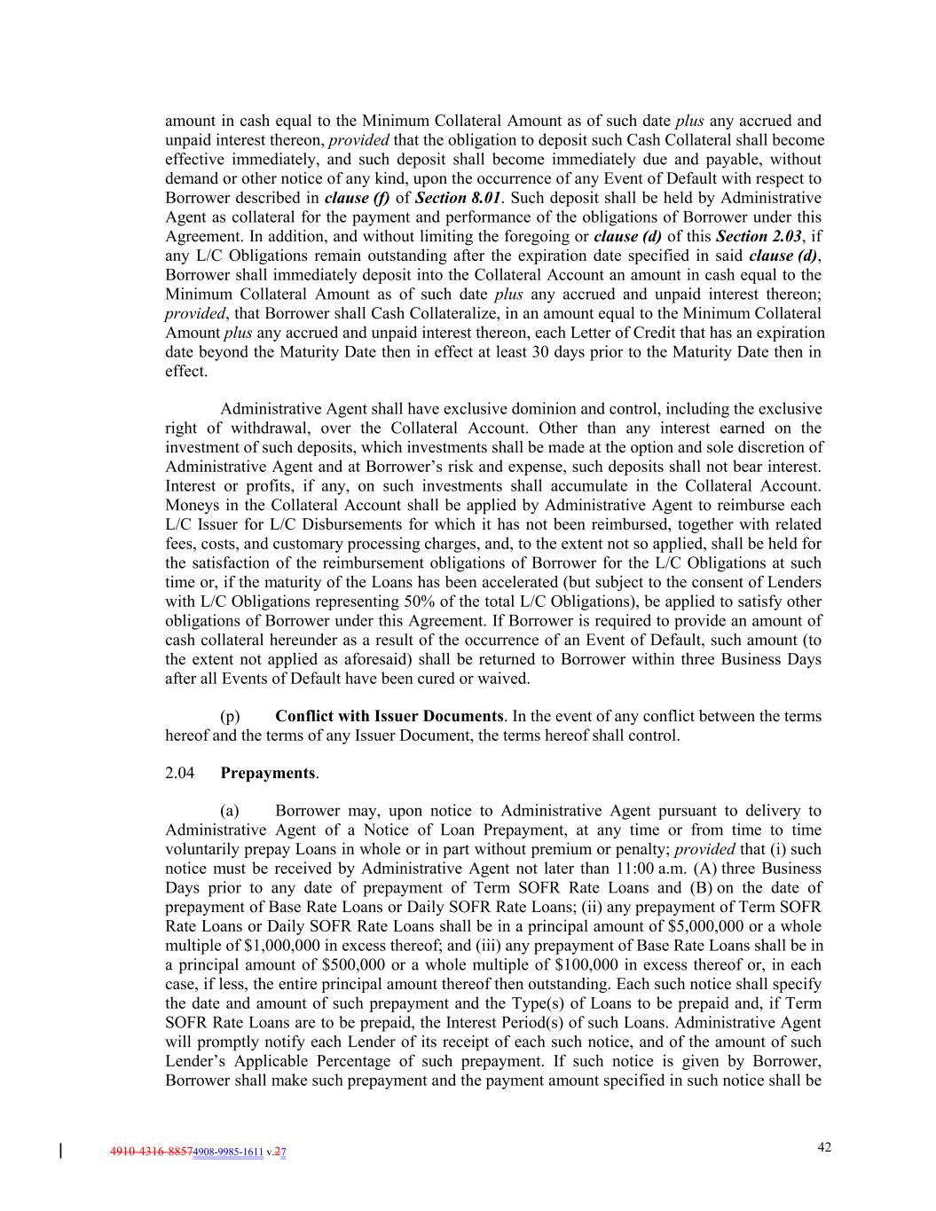 4910-4316-88574908-9985-1611 v.27 42 amount in cash equal to the Minimum Collateral Amount as of such date plus any accrued and unpaid interest thereon, provided that the obligation to deposit such Cash Collateral shall become effective immediately, and such deposit shall become immediately due and payable, without demand or other notice of any kind, upon the occurrence of any Event of Default with respect to Borrower described in clause (f) of Section 8.01. Such deposit shall be held by Administrative Agent as collateral for the payment and performance of the obligations of Borrower under this Agreement. In addition, and without limiting the foregoing or clause (d) of this Section 2.03, if any L/C Obligations remain outstanding after the expiration date specified in said clause (d), Borrower shall immediately deposit into the Collateral Account an amount in cash equal to the Minimum Collateral Amount as of such date plus any accrued and unpaid interest thereon; provided, that Borrower shall Cash Collateralize, in an amount equal to the Minimum Collateral Amount plus any accrued and unpaid interest thereon, each Letter of Credit that has an expiration date beyond the Maturity Date then in effect at least 30 days prior to the Maturity Date then in effect. Administrative Agent shall have exclusive dominion and control, including the exclusive right of withdrawal, over the Collateral Account. Other than any interest earned on the investment of such deposits, which investments shall be made at the option and sole discretion of Administrative Agent and at Borrower’s risk and expense, such deposits shall not bear interest. Interest or profits, if any, on such investments shall accumulate in the Collateral Account. Moneys in the Collateral Account shall be applied by Administrative Agent to reimburse each L/C Issuer for L/C Disbursements for which it has not been reimbursed, together with related fees, costs, and customary processing charges, and, to the extent not so applied, shall be held for the satisfaction of the reimbursement obligations of Borrower for the L/C Obligations at such time or, if the maturity of the Loans has been accelerated (but subject to the consent of Lenders with L/C Obligations representing 50% of the total L/C Obligations), be applied to satisfy other obligations of Borrower under this Agreement. If Borrower is required to provide an amount of cash collateral hereunder as a result of the occurrence of an Event of Default, such amount (to the extent not applied as aforesaid) shall be returned to Borrower within three Business Days after all Events of Default have been cured or waived. (p) Conflict with Issuer Documents. In the event of any conflict between the terms hereof and the terms of any Issuer Document, the terms hereof shall control. 2.04 Prepayments. (a) Borrower may, upon notice to Administrative Agent pursuant to delivery to Administrative Agent of a Notice of Loan Prepayment, at any time or from time to time voluntarily prepay Loans in whole or in part without premium or penalty; provided that (i) such notice must be received by Administrative Agent not later than 11:00 a.m. (A) three Business Days prior to any date of prepayment of Term SOFR Rate Loans and (B) on the date of prepayment of Base Rate Loans or Daily SOFR Rate Loans; (ii) any prepayment of Term SOFR Rate Loans or Daily SOFR Rate Loans shall be in a principal amount of $5,000,000 or a whole multiple of $1,000,000 in excess thereof; and (iii) any prepayment of Base Rate Loans shall be in a principal amount of $500,000 or a whole multiple of $100,000 in excess thereof or, in each case, if less, the entire principal amount thereof then outstanding. Each such notice shall specify the date and amount of such prepayment and the Type(s) of Loans to be prepaid and, if Term SOFR Rate Loans are to be prepaid, the Interest Period(s) of such Loans. Administrative Agent will promptly notify each Lender of its receipt of each such notice, and of the amount of such Lender’s Applicable Percentage of such prepayment. If such notice is given by Borrower, Borrower shall make such prepayment and the payment amount specified in such notice shall be