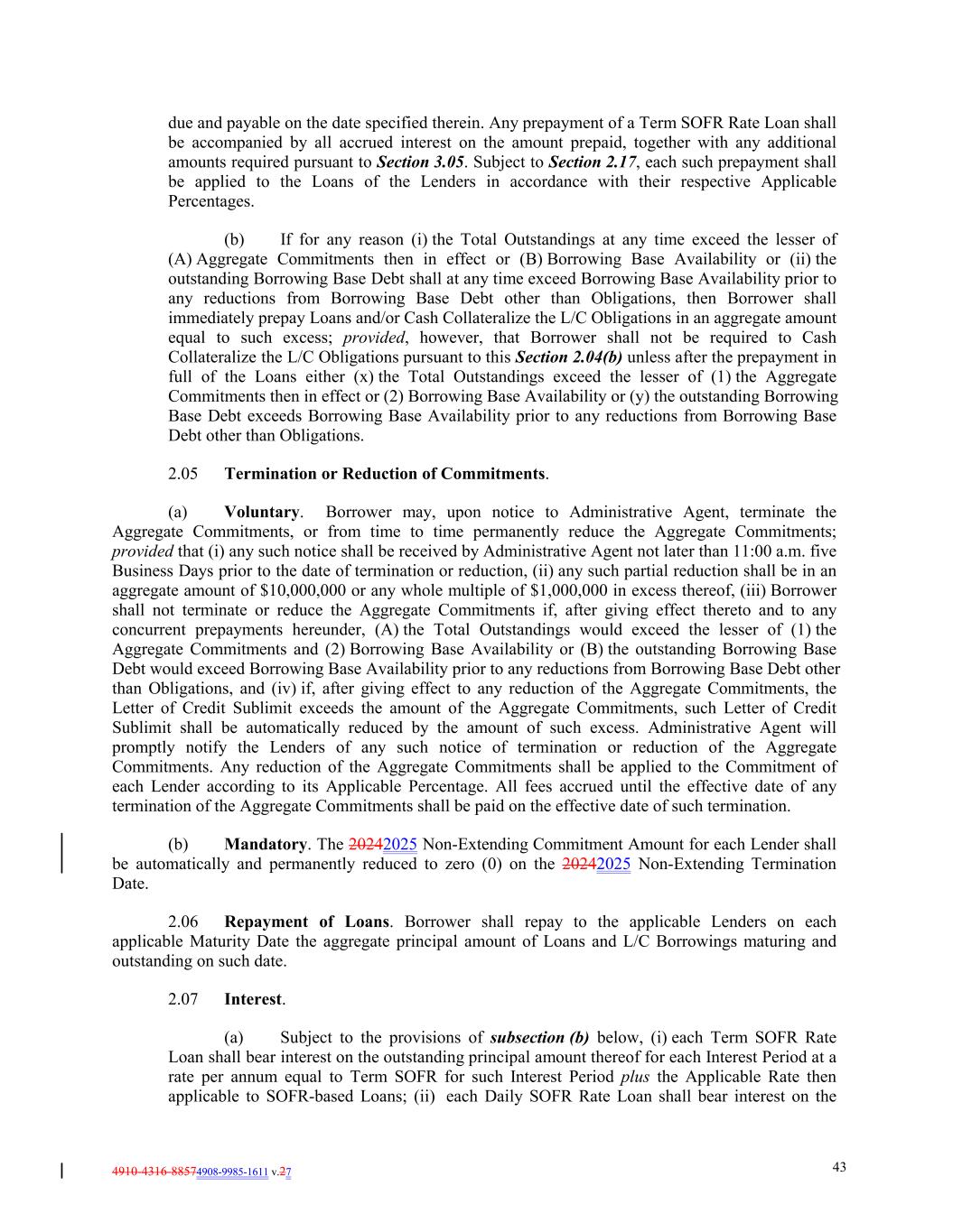 4910-4316-88574908-9985-1611 v.27 43 due and payable on the date specified therein. Any prepayment of a Term SOFR Rate Loan shall be accompanied by all accrued interest on the amount prepaid, together with any additional amounts required pursuant to Section 3.05. Subject to Section 2.17, each such prepayment shall be applied to the Loans of the Lenders in accordance with their respective Applicable Percentages. (b) If for any reason (i) the Total Outstandings at any time exceed the lesser of (A) Aggregate Commitments then in effect or (B) Borrowing Base Availability or (ii) the outstanding Borrowing Base Debt shall at any time exceed Borrowing Base Availability prior to any reductions from Borrowing Base Debt other than Obligations, then Borrower shall immediately prepay Loans and/or Cash Collateralize the L/C Obligations in an aggregate amount equal to such excess; provided, however, that Borrower shall not be required to Cash Collateralize the L/C Obligations pursuant to this Section 2.04(b) unless after the prepayment in full of the Loans either (x) the Total Outstandings exceed the lesser of (1) the Aggregate Commitments then in effect or (2) Borrowing Base Availability or (y) the outstanding Borrowing Base Debt exceeds Borrowing Base Availability prior to any reductions from Borrowing Base Debt other than Obligations. 2.05 Termination or Reduction of Commitments. (a) Voluntary. Borrower may, upon notice to Administrative Agent, terminate the Aggregate Commitments, or from time to time permanently reduce the Aggregate Commitments; provided that (i) any such notice shall be received by Administrative Agent not later than 11:00 a.m. five Business Days prior to the date of termination or reduction, (ii) any such partial reduction shall be in an aggregate amount of $10,000,000 or any whole multiple of $1,000,000 in excess thereof, (iii) Borrower shall not terminate or reduce the Aggregate Commitments if, after giving effect thereto and to any concurrent prepayments hereunder, (A) the Total Outstandings would exceed the lesser of (1) the Aggregate Commitments and (2) Borrowing Base Availability or (B) the outstanding Borrowing Base Debt would exceed Borrowing Base Availability prior to any reductions from Borrowing Base Debt other than Obligations, and (iv) if, after giving effect to any reduction of the Aggregate Commitments, the Letter of Credit Sublimit exceeds the amount of the Aggregate Commitments, such Letter of Credit Sublimit shall be automatically reduced by the amount of such excess. Administrative Agent will promptly notify the Lenders of any such notice of termination or reduction of the Aggregate Commitments. Any reduction of the Aggregate Commitments shall be applied to the Commitment of each Lender according to its Applicable Percentage. All fees accrued until the effective date of any termination of the Aggregate Commitments shall be paid on the effective date of such termination. (b) Mandatory. The 20242025 Non-Extending Commitment Amount for each Lender shall be automatically and permanently reduced to zero (0) on the 20242025 Non-Extending Termination Date. 2.06 Repayment of Loans. Borrower shall repay to the applicable Lenders on each applicable Maturity Date the aggregate principal amount of Loans and L/C Borrowings maturing and outstanding on such date. 2.07 Interest. (a) Subject to the provisions of subsection (b) below, (i) each Term SOFR Rate Loan shall bear interest on the outstanding principal amount thereof for each Interest Period at a rate per annum equal to Term SOFR for such Interest Period plus the Applicable Rate then applicable to SOFR-based Loans; (ii) each Daily SOFR Rate Loan shall bear interest on the