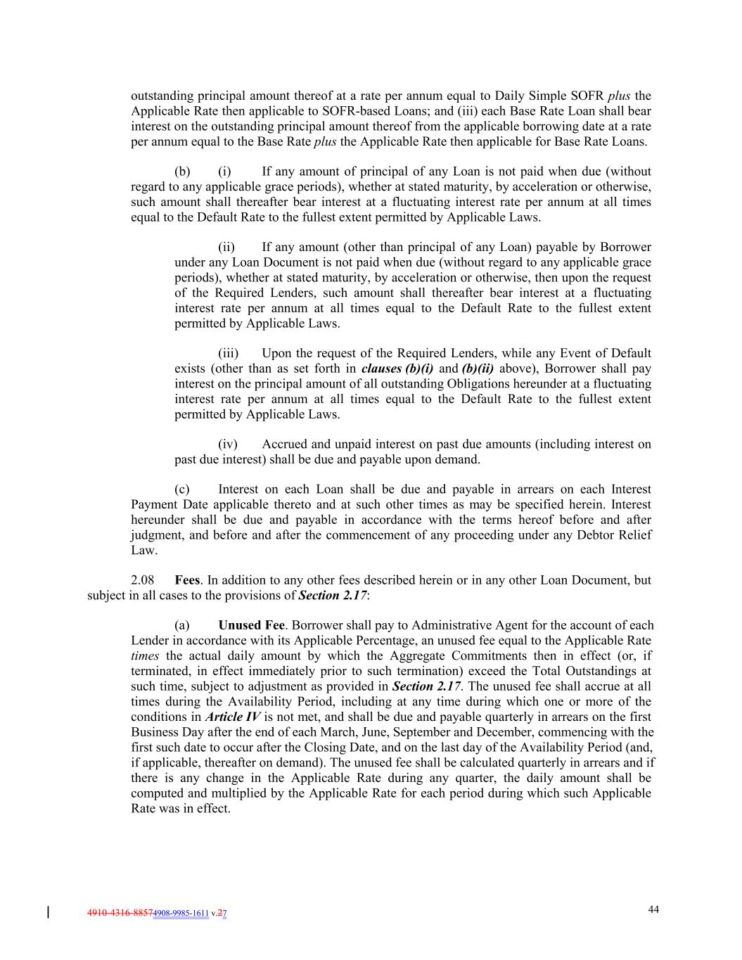 4910-4316-88574908-9985-1611 v.27 44 outstanding principal amount thereof at a rate per annum equal to Daily Simple SOFR plus the Applicable Rate then applicable to SOFR-based Loans; and (iii) each Base Rate Loan shall bear interest on the outstanding principal amount thereof from the applicable borrowing date at a rate per annum equal to the Base Rate plus the Applicable Rate then applicable for Base Rate Loans. (b) (i) If any amount of principal of any Loan is not paid when due (without regard to any applicable grace periods), whether at stated maturity, by acceleration or otherwise, such amount shall thereafter bear interest at a fluctuating interest rate per annum at all times equal to the Default Rate to the fullest extent permitted by Applicable Laws. (ii) If any amount (other than principal of any Loan) payable by Borrower under any Loan Document is not paid when due (without regard to any applicable grace periods), whether at stated maturity, by acceleration or otherwise, then upon the request of the Required Lenders, such amount shall thereafter bear interest at a fluctuating interest rate per annum at all times equal to the Default Rate to the fullest extent permitted by Applicable Laws. (iii) Upon the request of the Required Lenders, while any Event of Default exists (other than as set forth in clauses (b)(i) and (b)(ii) above), Borrower shall pay interest on the principal amount of all outstanding Obligations hereunder at a fluctuating interest rate per annum at all times equal to the Default Rate to the fullest extent permitted by Applicable Laws. (iv) Accrued and unpaid interest on past due amounts (including interest on past due interest) shall be due and payable upon demand. (c) Interest on each Loan shall be due and payable in arrears on each Interest Payment Date applicable thereto and at such other times as may be specified herein. Interest hereunder shall be due and payable in accordance with the terms hereof before and after judgment, and before and after the commencement of any proceeding under any Debtor Relief Law. 2.08 Fees. In addition to any other fees described herein or in any other Loan Document, but subject in all cases to the provisions of Section 2.17: (a) Unused Fee. Borrower shall pay to Administrative Agent for the account of each Lender in accordance with its Applicable Percentage, an unused fee equal to the Applicable Rate times the actual daily amount by which the Aggregate Commitments then in effect (or, if terminated, in effect immediately prior to such termination) exceed the Total Outstandings at such time, subject to adjustment as provided in Section 2.17. The unused fee shall accrue at all times during the Availability Period, including at any time during which one or more of the conditions in Article IV is not met, and shall be due and payable quarterly in arrears on the first Business Day after the end of each March, June, September and December, commencing with the first such date to occur after the Closing Date, and on the last day of the Availability Period (and, if applicable, thereafter on demand). The unused fee shall be calculated quarterly in arrears and if there is any change in the Applicable Rate during any quarter, the daily amount shall be computed and multiplied by the Applicable Rate for each period during which such Applicable Rate was in effect.