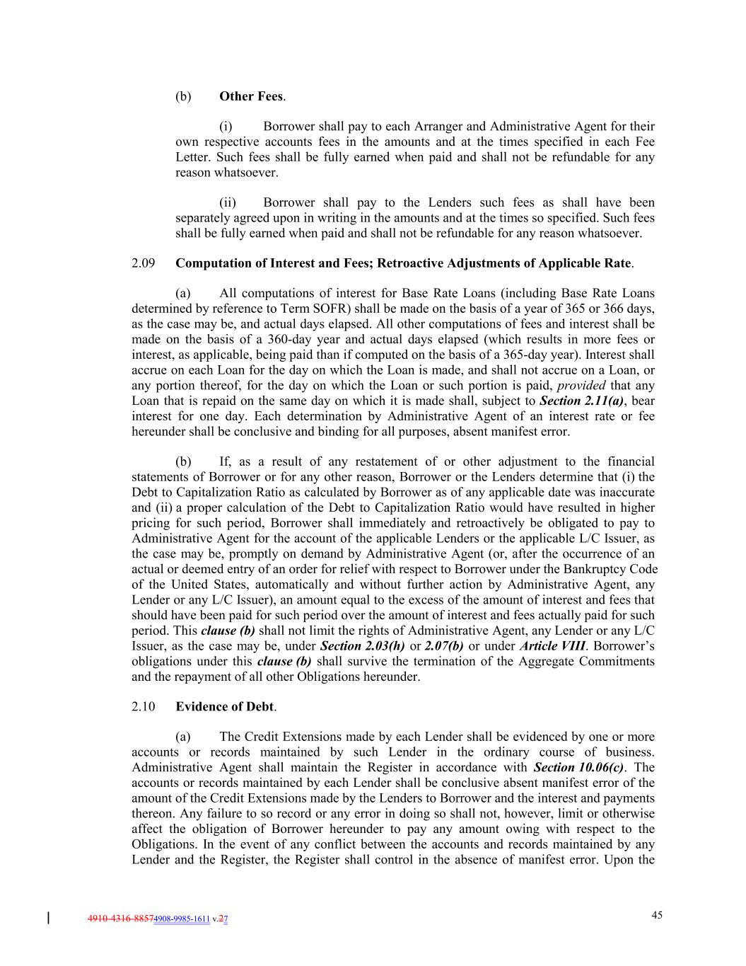 4910-4316-88574908-9985-1611 v.27 45 (b) Other Fees. (i) Borrower shall pay to each Arranger and Administrative Agent for their own respective accounts fees in the amounts and at the times specified in each Fee Letter. Such fees shall be fully earned when paid and shall not be refundable for any reason whatsoever. (ii) Borrower shall pay to the Lenders such fees as shall have been separately agreed upon in writing in the amounts and at the times so specified. Such fees shall be fully earned when paid and shall not be refundable for any reason whatsoever. 2.09 Computation of Interest and Fees; Retroactive Adjustments of Applicable Rate. (a) All computations of interest for Base Rate Loans (including Base Rate Loans determined by reference to Term SOFR) shall be made on the basis of a year of 365 or 366 days, as the case may be, and actual days elapsed. All other computations of fees and interest shall be made on the basis of a 360-day year and actual days elapsed (which results in more fees or interest, as applicable, being paid than if computed on the basis of a 365-day year). Interest shall accrue on each Loan for the day on which the Loan is made, and shall not accrue on a Loan, or any portion thereof, for the day on which the Loan or such portion is paid, provided that any Loan that is repaid on the same day on which it is made shall, subject to Section 2.11(a), bear interest for one day. Each determination by Administrative Agent of an interest rate or fee hereunder shall be conclusive and binding for all purposes, absent manifest error. (b) If, as a result of any restatement of or other adjustment to the financial statements of Borrower or for any other reason, Borrower or the Lenders determine that (i) the Debt to Capitalization Ratio as calculated by Borrower as of any applicable date was inaccurate and (ii) a proper calculation of the Debt to Capitalization Ratio would have resulted in higher pricing for such period, Borrower shall immediately and retroactively be obligated to pay to Administrative Agent for the account of the applicable Lenders or the applicable L/C Issuer, as the case may be, promptly on demand by Administrative Agent (or, after the occurrence of an actual or deemed entry of an order for relief with respect to Borrower under the Bankruptcy Code of the United States, automatically and without further action by Administrative Agent, any Lender or any L/C Issuer), an amount equal to the excess of the amount of interest and fees that should have been paid for such period over the amount of interest and fees actually paid for such period. This clause (b) shall not limit the rights of Administrative Agent, any Lender or any L/C Issuer, as the case may be, under Section 2.03(h) or 2.07(b) or under Article VIII. Borrower’s obligations under this clause (b) shall survive the termination of the Aggregate Commitments and the repayment of all other Obligations hereunder. 2.10 Evidence of Debt. (a) The Credit Extensions made by each Lender shall be evidenced by one or more accounts or records maintained by such Lender in the ordinary course of business. Administrative Agent shall maintain the Register in accordance with Section 10.06(c). The accounts or records maintained by each Lender shall be conclusive absent manifest error of the amount of the Credit Extensions made by the Lenders to Borrower and the interest and payments thereon. Any failure to so record or any error in doing so shall not, however, limit or otherwise affect the obligation of Borrower hereunder to pay any amount owing with respect to the Obligations. In the event of any conflict between the accounts and records maintained by any Lender and the Register, the Register shall control in the absence of manifest error. Upon the