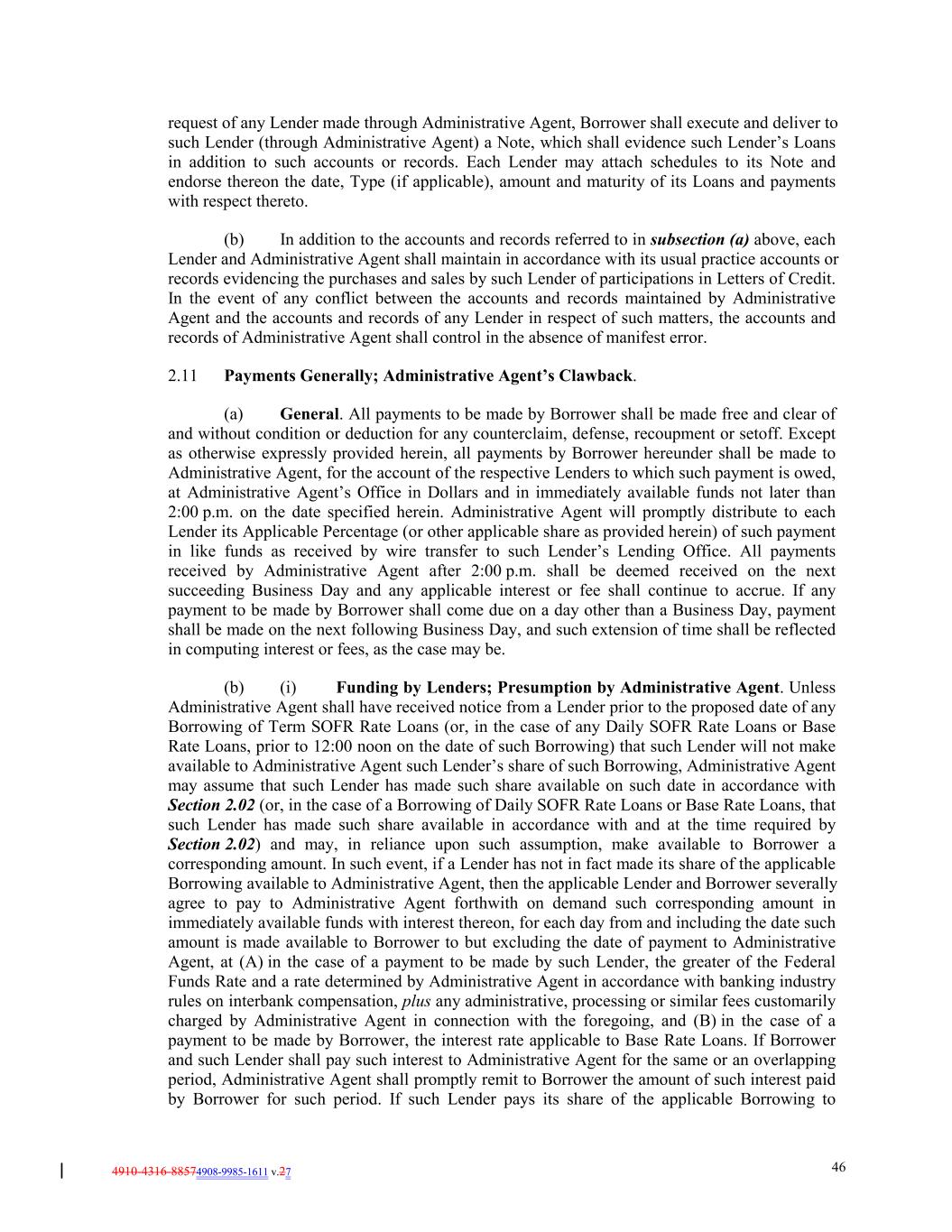 4910-4316-88574908-9985-1611 v.27 46 request of any Lender made through Administrative Agent, Borrower shall execute and deliver to such Lender (through Administrative Agent) a Note, which shall evidence such Lender’s Loans in addition to such accounts or records. Each Lender may attach schedules to its Note and endorse thereon the date, Type (if applicable), amount and maturity of its Loans and payments with respect thereto. (b) In addition to the accounts and records referred to in subsection (a) above, each Lender and Administrative Agent shall maintain in accordance with its usual practice accounts or records evidencing the purchases and sales by such Lender of participations in Letters of Credit. In the event of any conflict between the accounts and records maintained by Administrative Agent and the accounts and records of any Lender in respect of such matters, the accounts and records of Administrative Agent shall control in the absence of manifest error. 2.11 Payments Generally; Administrative Agent’s Clawback. (a) General. All payments to be made by Borrower shall be made free and clear of and without condition or deduction for any counterclaim, defense, recoupment or setoff. Except as otherwise expressly provided herein, all payments by Borrower hereunder shall be made to Administrative Agent, for the account of the respective Lenders to which such payment is owed, at Administrative Agent’s Office in Dollars and in immediately available funds not later than 2:00 p.m. on the date specified herein. Administrative Agent will promptly distribute to each Lender its Applicable Percentage (or other applicable share as provided herein) of such payment in like funds as received by wire transfer to such Lender’s Lending Office. All payments received by Administrative Agent after 2:00 p.m. shall be deemed received on the next succeeding Business Day and any applicable interest or fee shall continue to accrue. If any payment to be made by Borrower shall come due on a day other than a Business Day, payment shall be made on the next following Business Day, and such extension of time shall be reflected in computing interest or fees, as the case may be. (b) (i) Funding by Lenders; Presumption by Administrative Agent. Unless Administrative Agent shall have received notice from a Lender prior to the proposed date of any Borrowing of Term SOFR Rate Loans (or, in the case of any Daily SOFR Rate Loans or Base Rate Loans, prior to 12:00 noon on the date of such Borrowing) that such Lender will not make available to Administrative Agent such Lender’s share of such Borrowing, Administrative Agent may assume that such Lender has made such share available on such date in accordance with Section 2.02 (or, in the case of a Borrowing of Daily SOFR Rate Loans or Base Rate Loans, that such Lender has made such share available in accordance with and at the time required by Section 2.02) and may, in reliance upon such assumption, make available to Borrower a corresponding amount. In such event, if a Lender has not in fact made its share of the applicable Borrowing available to Administrative Agent, then the applicable Lender and Borrower severally agree to pay to Administrative Agent forthwith on demand such corresponding amount in immediately available funds with interest thereon, for each day from and including the date such amount is made available to Borrower to but excluding the date of payment to Administrative Agent, at (A) in the case of a payment to be made by such Lender, the greater of the Federal Funds Rate and a rate determined by Administrative Agent in accordance with banking industry rules on interbank compensation, plus any administrative, processing or similar fees customarily charged by Administrative Agent in connection with the foregoing, and (B) in the case of a payment to be made by Borrower, the interest rate applicable to Base Rate Loans. If Borrower and such Lender shall pay such interest to Administrative Agent for the same or an overlapping period, Administrative Agent shall promptly remit to Borrower the amount of such interest paid by Borrower for such period. If such Lender pays its share of the applicable Borrowing to