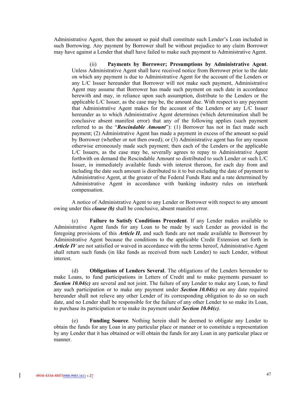 4910-4316-88574908-9985-1611 v.27 47 Administrative Agent, then the amount so paid shall constitute such Lender’s Loan included in such Borrowing. Any payment by Borrower shall be without prejudice to any claim Borrower may have against a Lender that shall have failed to make such payment to Administrative Agent. (ii) Payments by Borrower; Presumptions by Administrative Agent. Unless Administrative Agent shall have received notice from Borrower prior to the date on which any payment is due to Administrative Agent for the account of the Lenders or any L/C Issuer hereunder that Borrower will not make such payment, Administrative Agent may assume that Borrower has made such payment on such date in accordance herewith and may, in reliance upon such assumption, distribute to the Lenders or the applicable L/C Issuer, as the case may be, the amount due. With respect to any payment that Administrative Agent makes for the account of the Lenders or any L/C Issuer hereunder as to which Administrative Agent determines (which determination shall be conclusive absent manifest error) that any of the following applies (such payment referred to as the “Rescindable Amount”): (1) Borrower has not in fact made such payment; (2) Administrative Agent has made a payment in excess of the amount so paid by Borrower (whether or not then owed); or (3) Administrative agent has for any reason otherwise erroneously made such payment; then each of the Lenders or the applicable L/C Issuers, as the case may be, severally agrees to repay to Administrative Agent forthwith on demand the Rescindable Amount so distributed to such Lender or such L/C Issuer, in immediately available funds with interest thereon, for each day from and including the date such amount is distributed to it to but excluding the date of payment to Administrative Agent, at the greater of the Federal Funds Rate and a rate determined by Administrative Agent in accordance with banking industry rules on interbank compensation. A notice of Administrative Agent to any Lender or Borrower with respect to any amount owing under this clause (b) shall be conclusive, absent manifest error. (c) Failure to Satisfy Conditions Precedent. If any Lender makes available to Administrative Agent funds for any Loan to be made by such Lender as provided in the foregoing provisions of this Article II, and such funds are not made available to Borrower by Administrative Agent because the conditions to the applicable Credit Extension set forth in Article IV are not satisfied or waived in accordance with the terms hereof, Administrative Agent shall return such funds (in like funds as received from such Lender) to such Lender, without interest. (d) Obligations of Lenders Several. The obligations of the Lenders hereunder to make Loans, to fund participations in Letters of Credit and to make payments pursuant to Section 10.04(c) are several and not joint. The failure of any Lender to make any Loan, to fund any such participation or to make any payment under Section 10.04(c) on any date required hereunder shall not relieve any other Lender of its corresponding obligation to do so on such date, and no Lender shall be responsible for the failure of any other Lender to so make its Loan, to purchase its participation or to make its payment under Section 10.04(c). (e) Funding Source. Nothing herein shall be deemed to obligate any Lender to obtain the funds for any Loan in any particular place or manner or to constitute a representation by any Lender that it has obtained or will obtain the funds for any Loan in any particular place or manner.