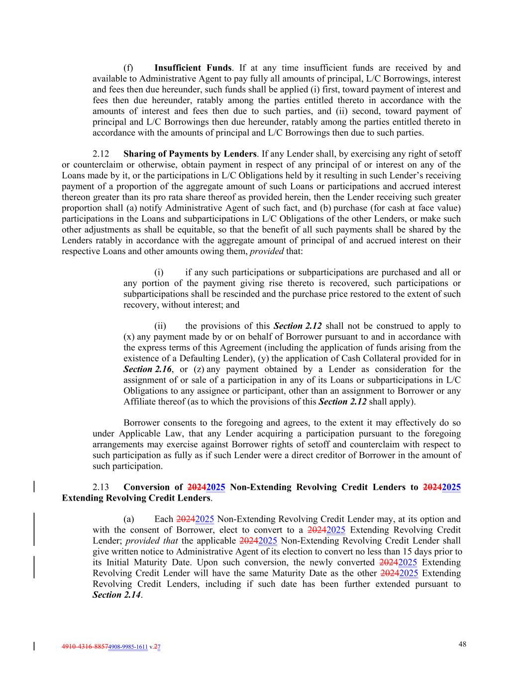 4910-4316-88574908-9985-1611 v.27 48 (f) Insufficient Funds. If at any time insufficient funds are received by and available to Administrative Agent to pay fully all amounts of principal, L/C Borrowings, interest and fees then due hereunder, such funds shall be applied (i) first, toward payment of interest and fees then due hereunder, ratably among the parties entitled thereto in accordance with the amounts of interest and fees then due to such parties, and (ii) second, toward payment of principal and L/C Borrowings then due hereunder, ratably among the parties entitled thereto in accordance with the amounts of principal and L/C Borrowings then due to such parties. 2.12 Sharing of Payments by Lenders. If any Lender shall, by exercising any right of setoff or counterclaim or otherwise, obtain payment in respect of any principal of or interest on any of the Loans made by it, or the participations in L/C Obligations held by it resulting in such Lender’s receiving payment of a proportion of the aggregate amount of such Loans or participations and accrued interest thereon greater than its pro rata share thereof as provided herein, then the Lender receiving such greater proportion shall (a) notify Administrative Agent of such fact, and (b) purchase (for cash at face value) participations in the Loans and subparticipations in L/C Obligations of the other Lenders, or make such other adjustments as shall be equitable, so that the benefit of all such payments shall be shared by the Lenders ratably in accordance with the aggregate amount of principal of and accrued interest on their respective Loans and other amounts owing them, provided that: (i) if any such participations or subparticipations are purchased and all or any portion of the payment giving rise thereto is recovered, such participations or subparticipations shall be rescinded and the purchase price restored to the extent of such recovery, without interest; and (ii) the provisions of this Section 2.12 shall not be construed to apply to (x) any payment made by or on behalf of Borrower pursuant to and in accordance with the express terms of this Agreement (including the application of funds arising from the existence of a Defaulting Lender), (y) the application of Cash Collateral provided for in Section 2.16, or (z) any payment obtained by a Lender as consideration for the assignment of or sale of a participation in any of its Loans or subparticipations in L/C Obligations to any assignee or participant, other than an assignment to Borrower or any Affiliate thereof (as to which the provisions of this Section 2.12 shall apply). Borrower consents to the foregoing and agrees, to the extent it may effectively do so under Applicable Law, that any Lender acquiring a participation pursuant to the foregoing arrangements may exercise against Borrower rights of setoff and counterclaim with respect to such participation as fully as if such Lender were a direct creditor of Borrower in the amount of such participation. 2.13 Conversion of 20242025 Non-Extending Revolving Credit Lenders to 20242025 Extending Revolving Credit Lenders. (a) Each 20242025 Non-Extending Revolving Credit Lender may, at its option and with the consent of Borrower, elect to convert to a 20242025 Extending Revolving Credit Lender; provided that the applicable 20242025 Non-Extending Revolving Credit Lender shall give written notice to Administrative Agent of its election to convert no less than 15 days prior to its Initial Maturity Date. Upon such conversion, the newly converted 20242025 Extending Revolving Credit Lender will have the same Maturity Date as the other 20242025 Extending Revolving Credit Lenders, including if such date has been further extended pursuant to Section 2.14.