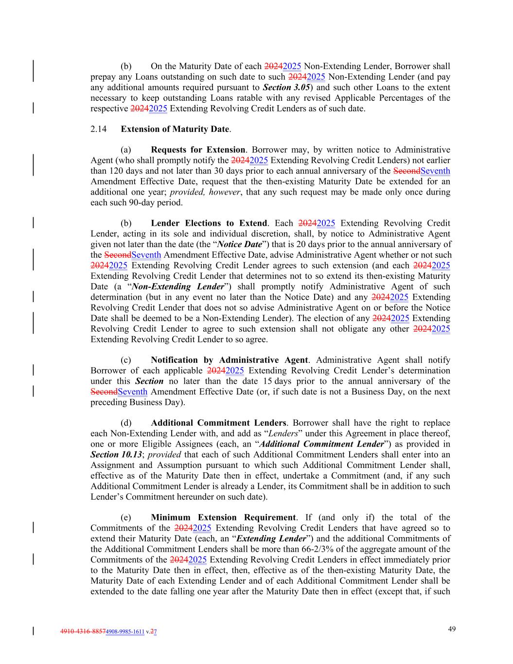 4910-4316-88574908-9985-1611 v.27 49 (b) On the Maturity Date of each 20242025 Non-Extending Lender, Borrower shall prepay any Loans outstanding on such date to such 20242025 Non-Extending Lender (and pay any additional amounts required pursuant to Section 3.05) and such other Loans to the extent necessary to keep outstanding Loans ratable with any revised Applicable Percentages of the respective 20242025 Extending Revolving Credit Lenders as of such date. 2.14 Extension of Maturity Date. (a) Requests for Extension. Borrower may, by written notice to Administrative Agent (who shall promptly notify the 20242025 Extending Revolving Credit Lenders) not earlier than 120 days and not later than 30 days prior to each annual anniversary of the SecondSeventh Amendment Effective Date, request that the then-existing Maturity Date be extended for an additional one year; provided, however, that any such request may be made only once during each such 90-day period. (b) Lender Elections to Extend. Each 20242025 Extending Revolving Credit Lender, acting in its sole and individual discretion, shall, by notice to Administrative Agent given not later than the date (the “Notice Date”) that is 20 days prior to the annual anniversary of the SecondSeventh Amendment Effective Date, advise Administrative Agent whether or not such 20242025 Extending Revolving Credit Lender agrees to such extension (and each 20242025 Extending Revolving Credit Lender that determines not to so extend its then-existing Maturity Date (a “Non-Extending Lender”) shall promptly notify Administrative Agent of such determination (but in any event no later than the Notice Date) and any 20242025 Extending Revolving Credit Lender that does not so advise Administrative Agent on or before the Notice Date shall be deemed to be a Non-Extending Lender). The election of any 20242025 Extending Revolving Credit Lender to agree to such extension shall not obligate any other 20242025 Extending Revolving Credit Lender to so agree. (c) Notification by Administrative Agent. Administrative Agent shall notify Borrower of each applicable 20242025 Extending Revolving Credit Lender’s determination under this Section no later than the date 15 days prior to the annual anniversary of the SecondSeventh Amendment Effective Date (or, if such date is not a Business Day, on the next preceding Business Day). (d) Additional Commitment Lenders. Borrower shall have the right to replace each Non-Extending Lender with, and add as “Lenders” under this Agreement in place thereof, one or more Eligible Assignees (each, an “Additional Commitment Lender”) as provided in Section 10.13; provided that each of such Additional Commitment Lenders shall enter into an Assignment and Assumption pursuant to which such Additional Commitment Lender shall, effective as of the Maturity Date then in effect, undertake a Commitment (and, if any such Additional Commitment Lender is already a Lender, its Commitment shall be in addition to such Lender’s Commitment hereunder on such date). (e) Minimum Extension Requirement. If (and only if) the total of the Commitments of the 20242025 Extending Revolving Credit Lenders that have agreed so to extend their Maturity Date (each, an “Extending Lender”) and the additional Commitments of the Additional Commitment Lenders shall be more than 66-2/3% of the aggregate amount of the Commitments of the 20242025 Extending Revolving Credit Lenders in effect immediately prior to the Maturity Date then in effect, then, effective as of the then-existing Maturity Date, the Maturity Date of each Extending Lender and of each Additional Commitment Lender shall be extended to the date falling one year after the Maturity Date then in effect (except that, if such