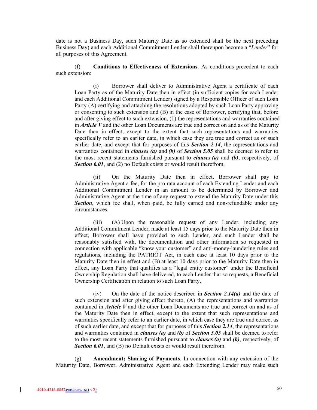 4910-4316-88574908-9985-1611 v.27 50 date is not a Business Day, such Maturity Date as so extended shall be the next preceding Business Day) and each Additional Commitment Lender shall thereupon become a “Lender” for all purposes of this Agreement. (f) Conditions to Effectiveness of Extensions. As conditions precedent to each such extension: (i) Borrower shall deliver to Administrative Agent a certificate of each Loan Party as of the Maturity Date then in effect (in sufficient copies for each Lender and each Additional Commitment Lender) signed by a Responsible Officer of such Loan Party (A) certifying and attaching the resolutions adopted by such Loan Party approving or consenting to such extension and (B) in the case of Borrower, certifying that, before and after giving effect to such extension, (1) the representations and warranties contained in Article V and the other Loan Documents are true and correct on and as of the Maturity Date then in effect, except to the extent that such representations and warranties specifically refer to an earlier date, in which case they are true and correct as of such earlier date, and except that for purposes of this Section 2.14, the representations and warranties contained in clauses (a) and (b) of Section 5.05 shall be deemed to refer to the most recent statements furnished pursuant to clauses (a) and (b), respectively, of Section 6.01, and (2) no Default exists or would result therefrom. (ii) On the Maturity Date then in effect, Borrower shall pay to Administrative Agent a fee, for the pro rata account of each Extending Lender and each Additional Commitment Lender in an amount to be determined by Borrower and Administrative Agent at the time of any request to extend the Maturity Date under this Section, which fee shall, when paid, be fully earned and non-refundable under any circumstances. (iii) (A) Upon the reasonable request of any Lender, including any Additional Commitment Lender, made at least 15 days prior to the Maturity Date then in effect, Borrower shall have provided to such Lender, and such Lender shall be reasonably satisfied with, the documentation and other information so requested in connection with applicable “know your customer” and anti-money-laundering rules and regulations, including the PATRIOT Act, in each case at least 10 days prior to the Maturity Date then in effect and (B) at least 10 days prior to the Maturity Date then in effect, any Loan Party that qualifies as a “legal entity customer” under the Beneficial Ownership Regulation shall have delivered, to each Lender that so requests, a Beneficial Ownership Certification in relation to such Loan Party. (iv) On the date of the notice described in Section 2.14(a) and the date of such extension and after giving effect thereto, (A) the representations and warranties contained in Article V and the other Loan Documents are true and correct on and as of the Maturity Date then in effect, except to the extent that such representations and warranties specifically refer to an earlier date, in which case they are true and correct as of such earlier date, and except that for purposes of this Section 2.14, the representations and warranties contained in clauses (a) and (b) of Section 5.05 shall be deemed to refer to the most recent statements furnished pursuant to clauses (a) and (b), respectively, of Section 6.01, and (B) no Default exists or would result therefrom. (g) Amendment; Sharing of Payments. In connection with any extension of the Maturity Date, Borrower, Administrative Agent and each Extending Lender may make such