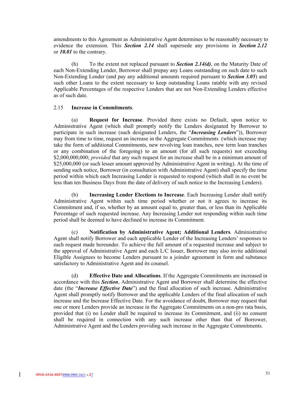 4910-4316-88574908-9985-1611 v.27 51 amendments to this Agreement as Administrative Agent determines to be reasonably necessary to evidence the extension. This Section 2.14 shall supersede any provisions in Section 2.12 or 10.01 to the contrary. (h) To the extent not replaced pursuant to Section 2.14(d), on the Maturity Date of each Non-Extending Lender, Borrower shall prepay any Loans outstanding on such date to such Non-Extending Lender (and pay any additional amounts required pursuant to Section 3.05) and such other Loans to the extent necessary to keep outstanding Loans ratable with any revised Applicable Percentages of the respective Lenders that are not Non-Extending Lenders effective as of such date. 2.15 Increase in Commitments. (a) Request for Increase. Provided there exists no Default, upon notice to Administrative Agent (which shall promptly notify the Lenders designated by Borrower to participate in such increase (such designated Lenders, the “Increasing Lenders”)), Borrower may from time to time, request an increase in the Aggregate Commitments (which increase may take the form of additional Commitments, new revolving loan tranches, new term loan tranches or any combination of the foregoing) to an amount (for all such requests) not exceeding $2,000,000,000; provided that any such request for an increase shall be in a minimum amount of $25,000,000 (or such lesser amount approved by Administrative Agent in writing). At the time of sending such notice, Borrower (in consultation with Administrative Agent) shall specify the time period within which each Increasing Lender is requested to respond (which shall in no event be less than ten Business Days from the date of delivery of such notice to the Increasing Lenders). (b) Increasing Lender Elections to Increase. Each Increasing Lender shall notify Administrative Agent within such time period whether or not it agrees to increase its Commitment and, if so, whether by an amount equal to, greater than, or less than its Applicable Percentage of such requested increase. Any Increasing Lender not responding within such time period shall be deemed to have declined to increase its Commitment. (c) Notification by Administrative Agent; Additional Lenders. Administrative Agent shall notify Borrower and each applicable Lender of the Increasing Lenders’ responses to each request made hereunder. To achieve the full amount of a requested increase and subject to the approval of Administrative Agent and each L/C Issuer, Borrower may also invite additional Eligible Assignees to become Lenders pursuant to a joinder agreement in form and substance satisfactory to Administrative Agent and its counsel. (d) Effective Date and Allocations. If the Aggregate Commitments are increased in accordance with this Section, Administrative Agent and Borrower shall determine the effective date (the “Increase Effective Date”) and the final allocation of such increase. Administrative Agent shall promptly notify Borrower and the applicable Lenders of the final allocation of such increase and the Increase Effective Date. For the avoidance of doubt, Borrower may request that one or more Lenders provide an increase in the Aggregate Commitments on a non-pro rata basis, provided that (i) no Lender shall be required to increase its Commitment, and (ii) no consent shall be required in connection with any such increase other than that of Borrower, Administrative Agent and the Lenders providing such increase in the Aggregate Commitments.