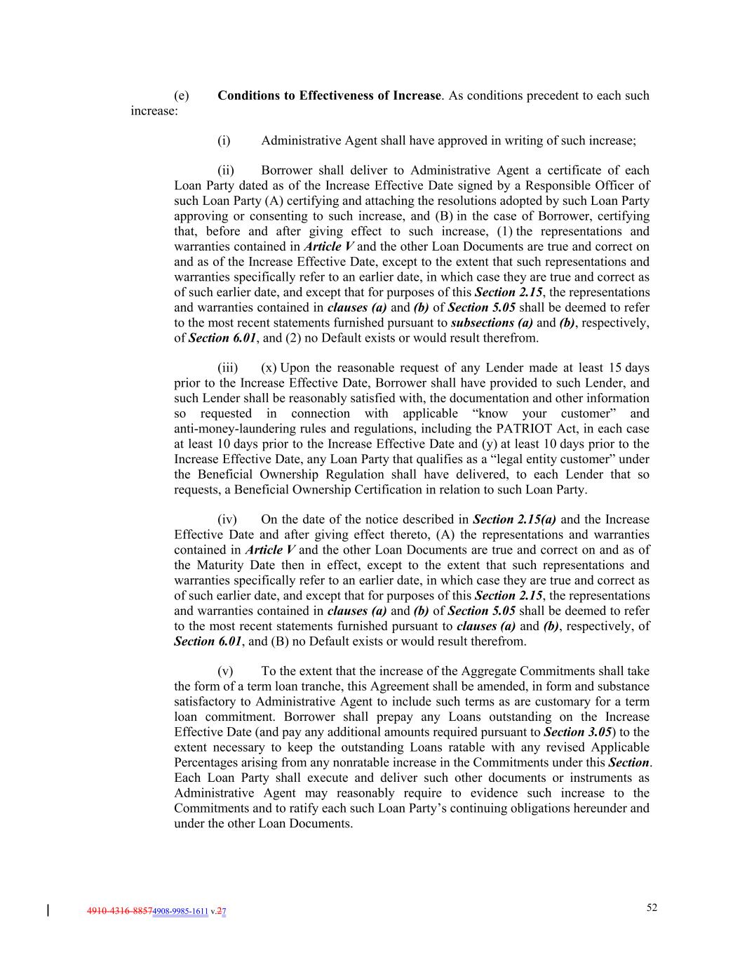 4910-4316-88574908-9985-1611 v.27 52 (e) Conditions to Effectiveness of Increase. As conditions precedent to each such increase: (i) Administrative Agent shall have approved in writing of such increase; (ii) Borrower shall deliver to Administrative Agent a certificate of each Loan Party dated as of the Increase Effective Date signed by a Responsible Officer of such Loan Party (A) certifying and attaching the resolutions adopted by such Loan Party approving or consenting to such increase, and (B) in the case of Borrower, certifying that, before and after giving effect to such increase, (1) the representations and warranties contained in Article V and the other Loan Documents are true and correct on and as of the Increase Effective Date, except to the extent that such representations and warranties specifically refer to an earlier date, in which case they are true and correct as of such earlier date, and except that for purposes of this Section 2.15, the representations and warranties contained in clauses (a) and (b) of Section 5.05 shall be deemed to refer to the most recent statements furnished pursuant to subsections (a) and (b), respectively, of Section 6.01, and (2) no Default exists or would result therefrom. (iii) (x) Upon the reasonable request of any Lender made at least 15 days prior to the Increase Effective Date, Borrower shall have provided to such Lender, and such Lender shall be reasonably satisfied with, the documentation and other information so requested in connection with applicable “know your customer” and anti-money-laundering rules and regulations, including the PATRIOT Act, in each case at least 10 days prior to the Increase Effective Date and (y) at least 10 days prior to the Increase Effective Date, any Loan Party that qualifies as a “legal entity customer” under the Beneficial Ownership Regulation shall have delivered, to each Lender that so requests, a Beneficial Ownership Certification in relation to such Loan Party. (iv) On the date of the notice described in Section 2.15(a) and the Increase Effective Date and after giving effect thereto, (A) the representations and warranties contained in Article V and the other Loan Documents are true and correct on and as of the Maturity Date then in effect, except to the extent that such representations and warranties specifically refer to an earlier date, in which case they are true and correct as of such earlier date, and except that for purposes of this Section 2.15, the representations and warranties contained in clauses (a) and (b) of Section 5.05 shall be deemed to refer to the most recent statements furnished pursuant to clauses (a) and (b), respectively, of Section 6.01, and (B) no Default exists or would result therefrom. (v) To the extent that the increase of the Aggregate Commitments shall take the form of a term loan tranche, this Agreement shall be amended, in form and substance satisfactory to Administrative Agent to include such terms as are customary for a term loan commitment. Borrower shall prepay any Loans outstanding on the Increase Effective Date (and pay any additional amounts required pursuant to Section 3.05) to the extent necessary to keep the outstanding Loans ratable with any revised Applicable Percentages arising from any nonratable increase in the Commitments under this Section. Each Loan Party shall execute and deliver such other documents or instruments as Administrative Agent may reasonably require to evidence such increase to the Commitments and to ratify each such Loan Party’s continuing obligations hereunder and under the other Loan Documents.