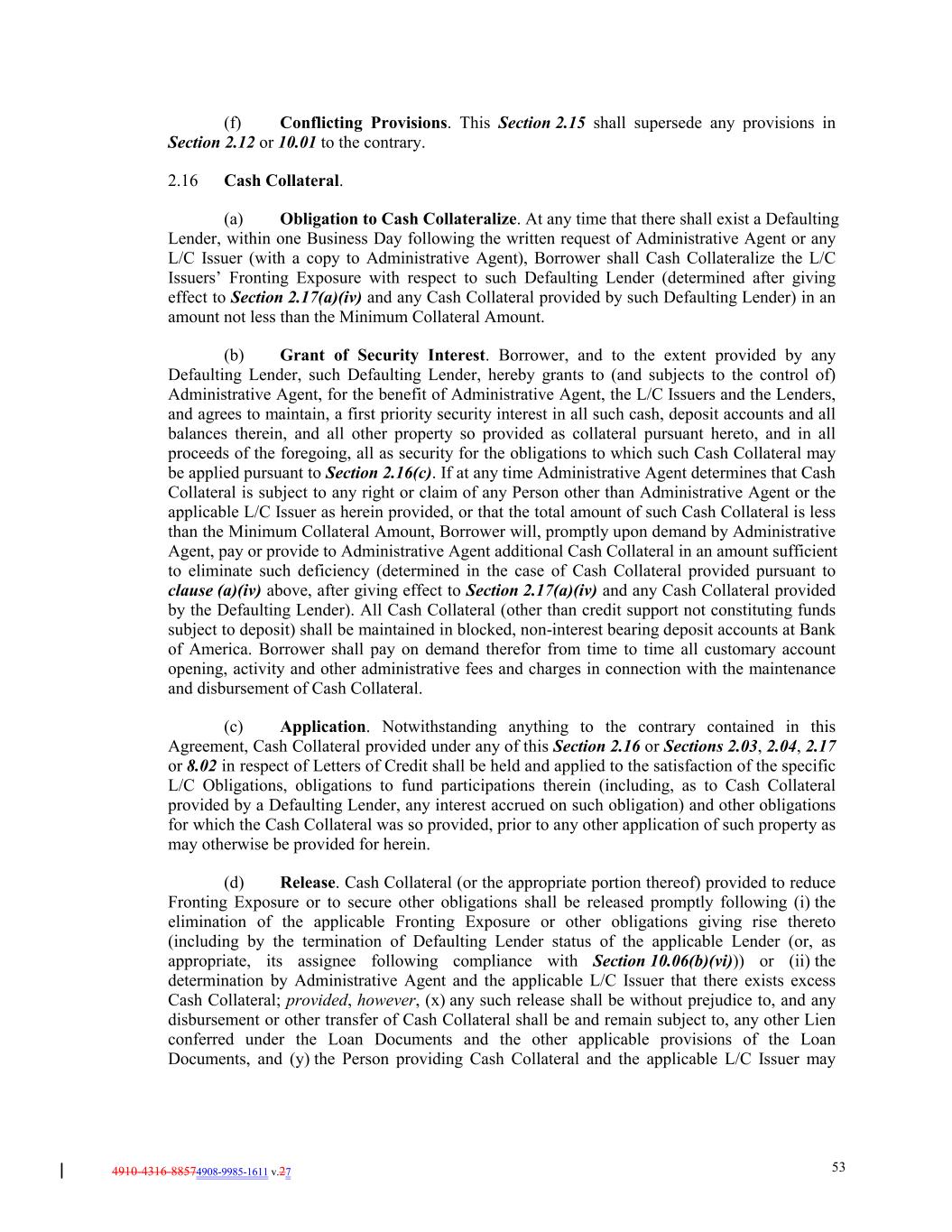 4910-4316-88574908-9985-1611 v.27 53 (f) Conflicting Provisions. This Section 2.15 shall supersede any provisions in Section 2.12 or 10.01 to the contrary. 2.16 Cash Collateral. (a) Obligation to Cash Collateralize. At any time that there shall exist a Defaulting Lender, within one Business Day following the written request of Administrative Agent or any L/C Issuer (with a copy to Administrative Agent), Borrower shall Cash Collateralize the L/C Issuers’ Fronting Exposure with respect to such Defaulting Lender (determined after giving effect to Section 2.17(a)(iv) and any Cash Collateral provided by such Defaulting Lender) in an amount not less than the Minimum Collateral Amount. (b) Grant of Security Interest. Borrower, and to the extent provided by any Defaulting Lender, such Defaulting Lender, hereby grants to (and subjects to the control of) Administrative Agent, for the benefit of Administrative Agent, the L/C Issuers and the Lenders, and agrees to maintain, a first priority security interest in all such cash, deposit accounts and all balances therein, and all other property so provided as collateral pursuant hereto, and in all proceeds of the foregoing, all as security for the obligations to which such Cash Collateral may be applied pursuant to Section 2.16(c). If at any time Administrative Agent determines that Cash Collateral is subject to any right or claim of any Person other than Administrative Agent or the applicable L/C Issuer as herein provided, or that the total amount of such Cash Collateral is less than the Minimum Collateral Amount, Borrower will, promptly upon demand by Administrative Agent, pay or provide to Administrative Agent additional Cash Collateral in an amount sufficient to eliminate such deficiency (determined in the case of Cash Collateral provided pursuant to clause (a)(iv) above, after giving effect to Section 2.17(a)(iv) and any Cash Collateral provided by the Defaulting Lender). All Cash Collateral (other than credit support not constituting funds subject to deposit) shall be maintained in blocked, non-interest bearing deposit accounts at Bank of America. Borrower shall pay on demand therefor from time to time all customary account opening, activity and other administrative fees and charges in connection with the maintenance and disbursement of Cash Collateral. (c) Application. Notwithstanding anything to the contrary contained in this Agreement, Cash Collateral provided under any of this Section 2.16 or Sections 2.03, 2.04, 2.17 or 8.02 in respect of Letters of Credit shall be held and applied to the satisfaction of the specific L/C Obligations, obligations to fund participations therein (including, as to Cash Collateral provided by a Defaulting Lender, any interest accrued on such obligation) and other obligations for which the Cash Collateral was so provided, prior to any other application of such property as may otherwise be provided for herein. (d) Release. Cash Collateral (or the appropriate portion thereof) provided to reduce Fronting Exposure or to secure other obligations shall be released promptly following (i) the elimination of the applicable Fronting Exposure or other obligations giving rise thereto (including by the termination of Defaulting Lender status of the applicable Lender (or, as appropriate, its assignee following compliance with Section 10.06(b)(vi))) or (ii) the determination by Administrative Agent and the applicable L/C Issuer that there exists excess Cash Collateral; provided, however, (x) any such release shall be without prejudice to, and any disbursement or other transfer of Cash Collateral shall be and remain subject to, any other Lien conferred under the Loan Documents and the other applicable provisions of the Loan Documents, and (y) the Person providing Cash Collateral and the applicable L/C Issuer may