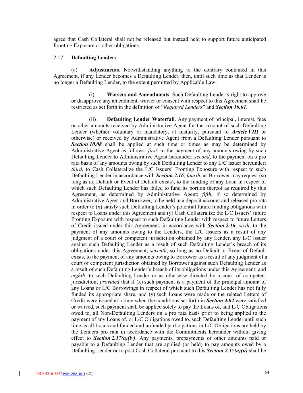 4910-4316-88574908-9985-1611 v.27 54 agree that Cash Collateral shall not be released but instead held to support future anticipated Fronting Exposure or other obligations. 2.17 Defaulting Lenders. (a) Adjustments. Notwithstanding anything to the contrary contained in this Agreement, if any Lender becomes a Defaulting Lender, then, until such time as that Lender is no longer a Defaulting Lender, to the extent permitted by Applicable Law: (i) Waivers and Amendments. Such Defaulting Lender’s right to approve or disapprove any amendment, waiver or consent with respect to this Agreement shall be restricted as set forth in the definition of “Required Lenders” and Section 10.01. (ii) Defaulting Lender Waterfall. Any payment of principal, interest, fees or other amounts received by Administrative Agent for the account of such Defaulting Lender (whether voluntary or mandatory, at maturity, pursuant to Article VIII or otherwise) or received by Administrative Agent from a Defaulting Lender pursuant to Section 10.08 shall be applied at such time or times as may be determined by Administrative Agent as follows: first, to the payment of any amounts owing by such Defaulting Lender to Administrative Agent hereunder; second, to the payment on a pro rata basis of any amounts owing by such Defaulting Lender to any L/C Issuer hereunder; third, to Cash Collateralize the L/C Issuers’ Fronting Exposure with respect to such Defaulting Lender in accordance with Section 2.16; fourth, as Borrower may request (so long as no Default or Event of Default exists), to the funding of any Loan in respect of which such Defaulting Lender has failed to fund its portion thereof as required by this Agreement, as determined by Administrative Agent; fifth, if so determined by Administrative Agent and Borrower, to be held in a deposit account and released pro rata in order to (x) satisfy such Defaulting Lender’s potential future funding obligations with respect to Loans under this Agreement and (y) Cash Collateralize the L/C Issuers’ future Fronting Exposure with respect to such Defaulting Lender with respect to future Letters of Credit issued under this Agreement, in accordance with Section 2.16; sixth, to the payment of any amounts owing to the Lenders, the L/C Issuers as a result of any judgment of a court of competent jurisdiction obtained by any Lender, any L/C Issuer against such Defaulting Lender as a result of such Defaulting Lender’s breach of its obligations under this Agreement; seventh, so long as no Default or Event of Default exists, to the payment of any amounts owing to Borrower as a result of any judgment of a court of competent jurisdiction obtained by Borrower against such Defaulting Lender as a result of such Defaulting Lender’s breach of its obligations under this Agreement; and eighth, to such Defaulting Lender or as otherwise directed by a court of competent jurisdiction; provided that if (x) such payment is a payment of the principal amount of any Loans or L/C Borrowings in respect of which such Defaulting Lender has not fully funded its appropriate share, and (y) such Loans were made or the related Letters of Credit were issued at a time when the conditions set forth in Section 4.02 were satisfied or waived, such payment shall be applied solely to pay the Loans of, and L/C Obligations owed to, all Non-Defaulting Lenders on a pro rata basis prior to being applied to the payment of any Loans of, or L/C Obligations owed to, such Defaulting Lender until such time as all Loans and funded and unfunded participations in L/C Obligations are held by the Lenders pro rata in accordance with the Commitments hereunder without giving effect to Section 2.17(a)(iv). Any payments, prepayments or other amounts paid or payable to a Defaulting Lender that are applied (or held) to pay amounts owed by a Defaulting Lender or to post Cash Collateral pursuant to this Section 2.17(a)(ii) shall be