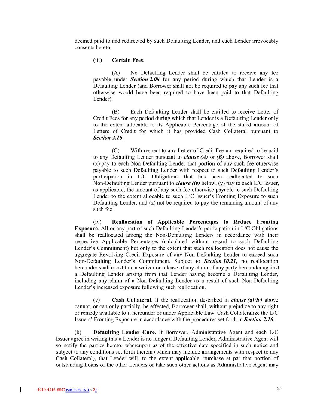 4910-4316-88574908-9985-1611 v.27 55 deemed paid to and redirected by such Defaulting Lender, and each Lender irrevocably consents hereto. (iii) Certain Fees. (A) No Defaulting Lender shall be entitled to receive any fee payable under Section 2.08 for any period during which that Lender is a Defaulting Lender (and Borrower shall not be required to pay any such fee that otherwise would have been required to have been paid to that Defaulting Lender). (B) Each Defaulting Lender shall be entitled to receive Letter of Credit Fees for any period during which that Lender is a Defaulting Lender only to the extent allocable to its Applicable Percentage of the stated amount of Letters of Credit for which it has provided Cash Collateral pursuant to Section 2.16. (C) With respect to any Letter of Credit Fee not required to be paid to any Defaulting Lender pursuant to clause (A) or (B) above, Borrower shall (x) pay to each Non-Defaulting Lender that portion of any such fee otherwise payable to such Defaulting Lender with respect to such Defaulting Lender’s participation in L/C Obligations that has been reallocated to such Non-Defaulting Lender pursuant to clause (iv) below, (y) pay to each L/C Issuer, as applicable, the amount of any such fee otherwise payable to such Defaulting Lender to the extent allocable to such L/C Issuer’s Fronting Exposure to such Defaulting Lender, and (z) not be required to pay the remaining amount of any such fee. (iv) Reallocation of Applicable Percentages to Reduce Fronting Exposure. All or any part of such Defaulting Lender’s participation in L/C Obligations shall be reallocated among the Non-Defaulting Lenders in accordance with their respective Applicable Percentages (calculated without regard to such Defaulting Lender’s Commitment) but only to the extent that such reallocation does not cause the aggregate Revolving Credit Exposure of any Non-Defaulting Lender to exceed such Non-Defaulting Lender’s Commitment. Subject to Section 10.21, no reallocation hereunder shall constitute a waiver or release of any claim of any party hereunder against a Defaulting Lender arising from that Lender having become a Defaulting Lender, including any claim of a Non-Defaulting Lender as a result of such Non-Defaulting Lender’s increased exposure following such reallocation. (v) Cash Collateral. If the reallocation described in clause (a)(iv) above cannot, or can only partially, be effected, Borrower shall, without prejudice to any right or remedy available to it hereunder or under Applicable Law, Cash Collateralize the L/C Issuers’ Fronting Exposure in accordance with the procedures set forth in Section 2.16. (b) Defaulting Lender Cure. If Borrower, Administrative Agent and each L/C Issuer agree in writing that a Lender is no longer a Defaulting Lender, Administrative Agent will so notify the parties hereto, whereupon as of the effective date specified in such notice and subject to any conditions set forth therein (which may include arrangements with respect to any Cash Collateral), that Lender will, to the extent applicable, purchase at par that portion of outstanding Loans of the other Lenders or take such other actions as Administrative Agent may