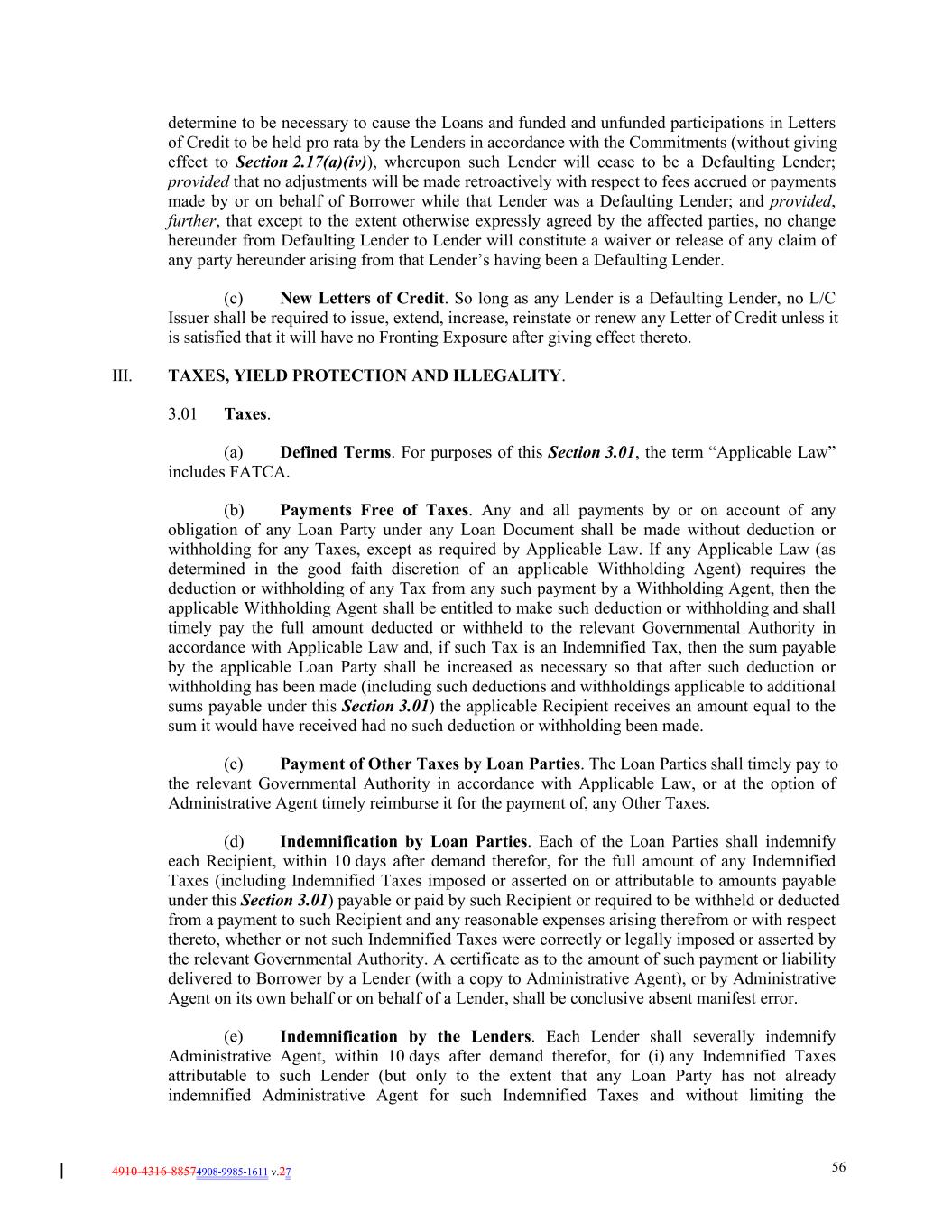 4910-4316-88574908-9985-1611 v.27 56 determine to be necessary to cause the Loans and funded and unfunded participations in Letters of Credit to be held pro rata by the Lenders in accordance with the Commitments (without giving effect to Section 2.17(a)(iv)), whereupon such Lender will cease to be a Defaulting Lender; provided that no adjustments will be made retroactively with respect to fees accrued or payments made by or on behalf of Borrower while that Lender was a Defaulting Lender; and provided, further, that except to the extent otherwise expressly agreed by the affected parties, no change hereunder from Defaulting Lender to Lender will constitute a waiver or release of any claim of any party hereunder arising from that Lender’s having been a Defaulting Lender. (c) New Letters of Credit. So long as any Lender is a Defaulting Lender, no L/C Issuer shall be required to issue, extend, increase, reinstate or renew any Letter of Credit unless it is satisfied that it will have no Fronting Exposure after giving effect thereto. III. TAXES, YIELD PROTECTION AND ILLEGALITY. 3.01 Taxes. (a) Defined Terms. For purposes of this Section 3.01, the term “Applicable Law” includes FATCA. (b) Payments Free of Taxes. Any and all payments by or on account of any obligation of any Loan Party under any Loan Document shall be made without deduction or withholding for any Taxes, except as required by Applicable Law. If any Applicable Law (as determined in the good faith discretion of an applicable Withholding Agent) requires the deduction or withholding of any Tax from any such payment by a Withholding Agent, then the applicable Withholding Agent shall be entitled to make such deduction or withholding and shall timely pay the full amount deducted or withheld to the relevant Governmental Authority in accordance with Applicable Law and, if such Tax is an Indemnified Tax, then the sum payable by the applicable Loan Party shall be increased as necessary so that after such deduction or withholding has been made (including such deductions and withholdings applicable to additional sums payable under this Section 3.01) the applicable Recipient receives an amount equal to the sum it would have received had no such deduction or withholding been made. (c) Payment of Other Taxes by Loan Parties. The Loan Parties shall timely pay to the relevant Governmental Authority in accordance with Applicable Law, or at the option of Administrative Agent timely reimburse it for the payment of, any Other Taxes. (d) Indemnification by Loan Parties. Each of the Loan Parties shall indemnify each Recipient, within 10 days after demand therefor, for the full amount of any Indemnified Taxes (including Indemnified Taxes imposed or asserted on or attributable to amounts payable under this Section 3.01) payable or paid by such Recipient or required to be withheld or deducted from a payment to such Recipient and any reasonable expenses arising therefrom or with respect thereto, whether or not such Indemnified Taxes were correctly or legally imposed or asserted by the relevant Governmental Authority. A certificate as to the amount of such payment or liability delivered to Borrower by a Lender (with a copy to Administrative Agent), or by Administrative Agent on its own behalf or on behalf of a Lender, shall be conclusive absent manifest error. (e) Indemnification by the Lenders. Each Lender shall severally indemnify Administrative Agent, within 10 days after demand therefor, for (i) any Indemnified Taxes attributable to such Lender (but only to the extent that any Loan Party has not already indemnified Administrative Agent for such Indemnified Taxes and without limiting the