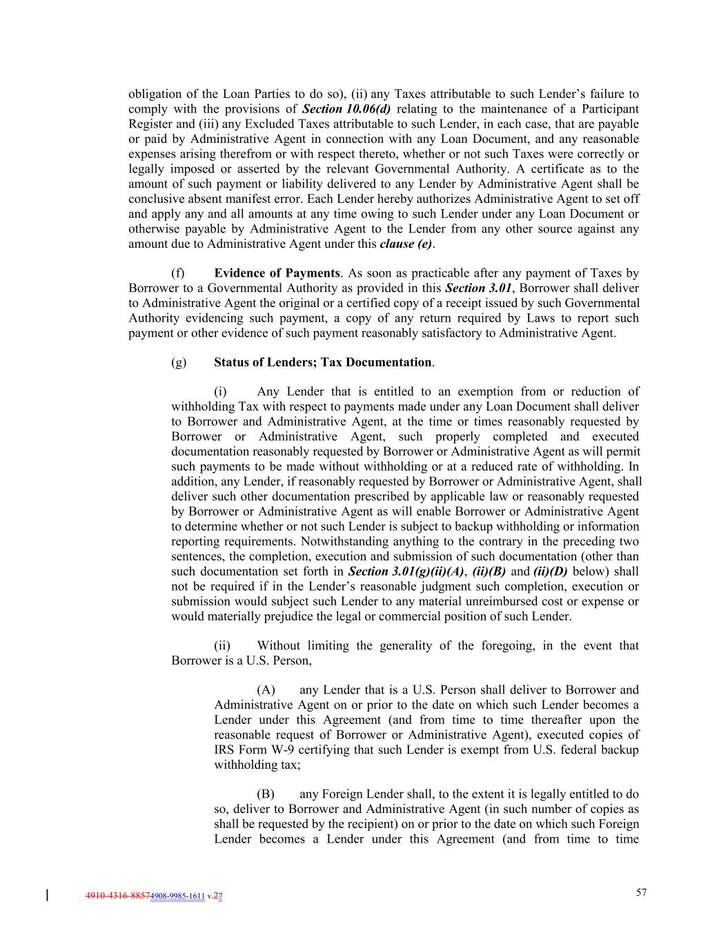 4910-4316-88574908-9985-1611 v.27 57 obligation of the Loan Parties to do so), (ii) any Taxes attributable to such Lender’s failure to comply with the provisions of Section 10.06(d) relating to the maintenance of a Participant Register and (iii) any Excluded Taxes attributable to such Lender, in each case, that are payable or paid by Administrative Agent in connection with any Loan Document, and any reasonable expenses arising therefrom or with respect thereto, whether or not such Taxes were correctly or legally imposed or asserted by the relevant Governmental Authority. A certificate as to the amount of such payment or liability delivered to any Lender by Administrative Agent shall be conclusive absent manifest error. Each Lender hereby authorizes Administrative Agent to set off and apply any and all amounts at any time owing to such Lender under any Loan Document or otherwise payable by Administrative Agent to the Lender from any other source against any amount due to Administrative Agent under this clause (e). (f) Evidence of Payments. As soon as practicable after any payment of Taxes by Borrower to a Governmental Authority as provided in this Section 3.01, Borrower shall deliver to Administrative Agent the original or a certified copy of a receipt issued by such Governmental Authority evidencing such payment, a copy of any return required by Laws to report such payment or other evidence of such payment reasonably satisfactory to Administrative Agent. (g) Status of Lenders; Tax Documentation. (i) Any Lender that is entitled to an exemption from or reduction of withholding Tax with respect to payments made under any Loan Document shall deliver to Borrower and Administrative Agent, at the time or times reasonably requested by Borrower or Administrative Agent, such properly completed and executed documentation reasonably requested by Borrower or Administrative Agent as will permit such payments to be made without withholding or at a reduced rate of withholding. In addition, any Lender, if reasonably requested by Borrower or Administrative Agent, shall deliver such other documentation prescribed by applicable law or reasonably requested by Borrower or Administrative Agent as will enable Borrower or Administrative Agent to determine whether or not such Lender is subject to backup withholding or information reporting requirements. Notwithstanding anything to the contrary in the preceding two sentences, the completion, execution and submission of such documentation (other than such documentation set forth in Section 3.01(g)(ii)(A), (ii)(B) and (ii)(D) below) shall not be required if in the Lender’s reasonable judgment such completion, execution or submission would subject such Lender to any material unreimbursed cost or expense or would materially prejudice the legal or commercial position of such Lender. (ii) Without limiting the generality of the foregoing, in the event that Borrower is a U.S. Person, (A) any Lender that is a U.S. Person shall deliver to Borrower and Administrative Agent on or prior to the date on which such Lender becomes a Lender under this Agreement (and from time to time thereafter upon the reasonable request of Borrower or Administrative Agent), executed copies of IRS Form W-9 certifying that such Lender is exempt from U.S. federal backup withholding tax; (B) any Foreign Lender shall, to the extent it is legally entitled to do so, deliver to Borrower and Administrative Agent (in such number of copies as shall be requested by the recipient) on or prior to the date on which such Foreign Lender becomes a Lender under this Agreement (and from time to time