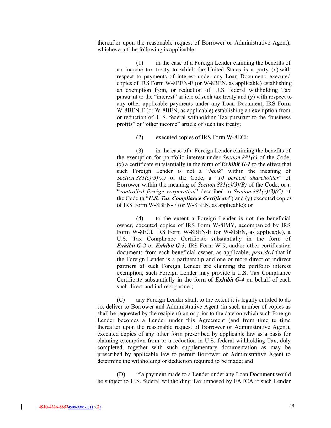4910-4316-88574908-9985-1611 v.27 58 thereafter upon the reasonable request of Borrower or Administrative Agent), whichever of the following is applicable: (1) in the case of a Foreign Lender claiming the benefits of an income tax treaty to which the United States is a party (x) with respect to payments of interest under any Loan Document, executed copies of IRS Form W-8BEN-E (or W-8BEN, as applicable) establishing an exemption from, or reduction of, U.S. federal withholding Tax pursuant to the “interest” article of such tax treaty and (y) with respect to any other applicable payments under any Loan Document, IRS Form W-8BEN-E (or W-8BEN, as applicable) establishing an exemption from, or reduction of, U.S. federal withholding Tax pursuant to the “business profits” or “other income” article of such tax treaty; (2) executed copies of IRS Form W-8ECI; (3) in the case of a Foreign Lender claiming the benefits of the exemption for portfolio interest under Section 881(c) of the Code, (x) a certificate substantially in the form of Exhibit G-1 to the effect that such Foreign Lender is not a “bank” within the meaning of Section 881(c)(3)(A) of the Code, a “10 percent shareholder” of Borrower within the meaning of Section 881(c)(3)(B) of the Code, or a “controlled foreign corporation” described in Section 881(c)(3)(C) of the Code (a “U.S. Tax Compliance Certificate”) and (y) executed copies of IRS Form W-8BEN-E (or W-8BEN, as applicable); or (4) to the extent a Foreign Lender is not the beneficial owner, executed copies of IRS Form W-8IMY, accompanied by IRS Form W-8ECI, IRS Form W-8BEN-E (or W-8BEN, as applicable), a U.S. Tax Compliance Certificate substantially in the form of Exhibit G-2 or Exhibit G-3, IRS Form W-9, and/or other certification documents from each beneficial owner, as applicable; provided that if the Foreign Lender is a partnership and one or more direct or indirect partners of such Foreign Lender are claiming the portfolio interest exemption, such Foreign Lender may provide a U.S. Tax Compliance Certificate substantially in the form of Exhibit G-4 on behalf of each such direct and indirect partner; (C) any Foreign Lender shall, to the extent it is legally entitled to do so, deliver to Borrower and Administrative Agent (in such number of copies as shall be requested by the recipient) on or prior to the date on which such Foreign Lender becomes a Lender under this Agreement (and from time to time thereafter upon the reasonable request of Borrower or Administrative Agent), executed copies of any other form prescribed by applicable law as a basis for claiming exemption from or a reduction in U.S. federal withholding Tax, duly completed, together with such supplementary documentation as may be prescribed by applicable law to permit Borrower or Administrative Agent to determine the withholding or deduction required to be made; and (D) if a payment made to a Lender under any Loan Document would be subject to U.S. federal withholding Tax imposed by FATCA if such Lender