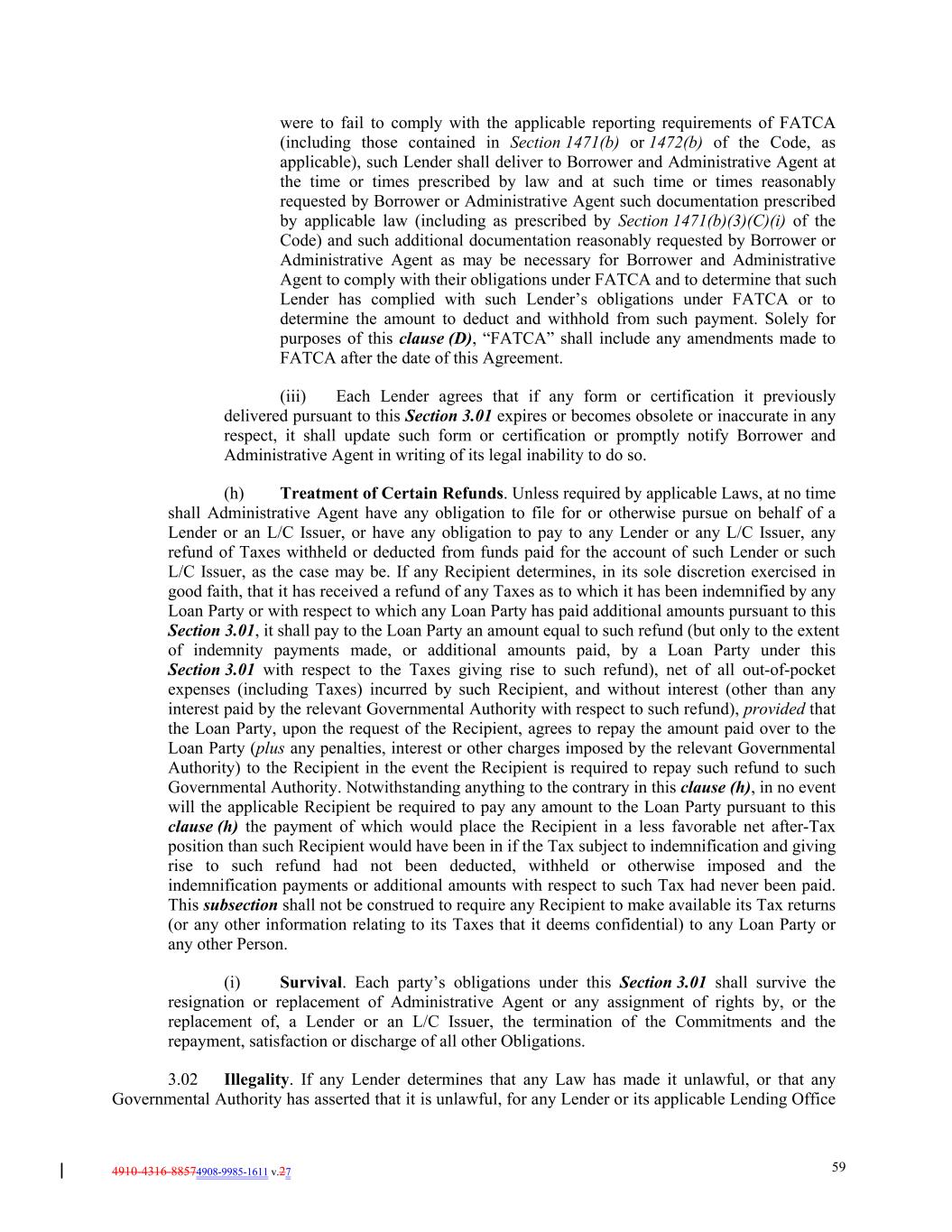 4910-4316-88574908-9985-1611 v.27 59 were to fail to comply with the applicable reporting requirements of FATCA (including those contained in Section 1471(b) or 1472(b) of the Code, as applicable), such Lender shall deliver to Borrower and Administrative Agent at the time or times prescribed by law and at such time or times reasonably requested by Borrower or Administrative Agent such documentation prescribed by applicable law (including as prescribed by Section 1471(b)(3)(C)(i) of the Code) and such additional documentation reasonably requested by Borrower or Administrative Agent as may be necessary for Borrower and Administrative Agent to comply with their obligations under FATCA and to determine that such Lender has complied with such Lender’s obligations under FATCA or to determine the amount to deduct and withhold from such payment. Solely for purposes of this clause (D), “FATCA” shall include any amendments made to FATCA after the date of this Agreement. (iii) Each Lender agrees that if any form or certification it previously delivered pursuant to this Section 3.01 expires or becomes obsolete or inaccurate in any respect, it shall update such form or certification or promptly notify Borrower and Administrative Agent in writing of its legal inability to do so. (h) Treatment of Certain Refunds. Unless required by applicable Laws, at no time shall Administrative Agent have any obligation to file for or otherwise pursue on behalf of a Lender or an L/C Issuer, or have any obligation to pay to any Lender or any L/C Issuer, any refund of Taxes withheld or deducted from funds paid for the account of such Lender or such L/C Issuer, as the case may be. If any Recipient determines, in its sole discretion exercised in good faith, that it has received a refund of any Taxes as to which it has been indemnified by any Loan Party or with respect to which any Loan Party has paid additional amounts pursuant to this Section 3.01, it shall pay to the Loan Party an amount equal to such refund (but only to the extent of indemnity payments made, or additional amounts paid, by a Loan Party under this Section 3.01 with respect to the Taxes giving rise to such refund), net of all out-of-pocket expenses (including Taxes) incurred by such Recipient, and without interest (other than any interest paid by the relevant Governmental Authority with respect to such refund), provided that the Loan Party, upon the request of the Recipient, agrees to repay the amount paid over to the Loan Party (plus any penalties, interest or other charges imposed by the relevant Governmental Authority) to the Recipient in the event the Recipient is required to repay such refund to such Governmental Authority. Notwithstanding anything to the contrary in this clause (h), in no event will the applicable Recipient be required to pay any amount to the Loan Party pursuant to this clause (h) the payment of which would place the Recipient in a less favorable net after-Tax position than such Recipient would have been in if the Tax subject to indemnification and giving rise to such refund had not been deducted, withheld or otherwise imposed and the indemnification payments or additional amounts with respect to such Tax had never been paid. This subsection shall not be construed to require any Recipient to make available its Tax returns (or any other information relating to its Taxes that it deems confidential) to any Loan Party or any other Person. (i) Survival. Each party’s obligations under this Section 3.01 shall survive the resignation or replacement of Administrative Agent or any assignment of rights by, or the replacement of, a Lender or an L/C Issuer, the termination of the Commitments and the repayment, satisfaction or discharge of all other Obligations. 3.02 Illegality. If any Lender determines that any Law has made it unlawful, or that any Governmental Authority has asserted that it is unlawful, for any Lender or its applicable Lending Office