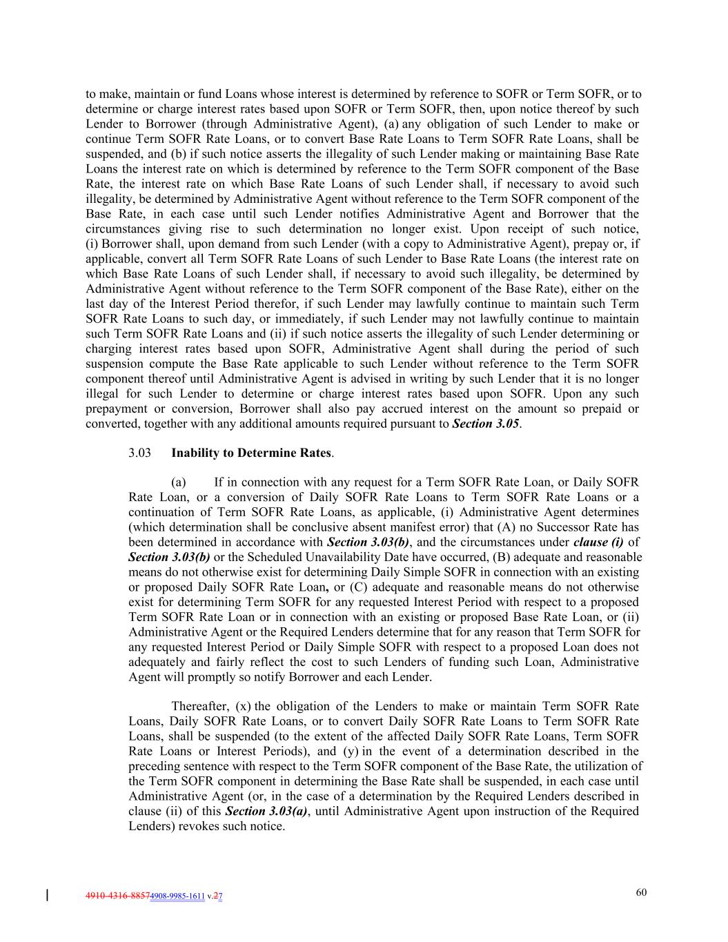 4910-4316-88574908-9985-1611 v.27 60 to make, maintain or fund Loans whose interest is determined by reference to SOFR or Term SOFR, or to determine or charge interest rates based upon SOFR or Term SOFR, then, upon notice thereof by such Lender to Borrower (through Administrative Agent), (a) any obligation of such Lender to make or continue Term SOFR Rate Loans, or to convert Base Rate Loans to Term SOFR Rate Loans, shall be suspended, and (b) if such notice asserts the illegality of such Lender making or maintaining Base Rate Loans the interest rate on which is determined by reference to the Term SOFR component of the Base Rate, the interest rate on which Base Rate Loans of such Lender shall, if necessary to avoid such illegality, be determined by Administrative Agent without reference to the Term SOFR component of the Base Rate, in each case until such Lender notifies Administrative Agent and Borrower that the circumstances giving rise to such determination no longer exist. Upon receipt of such notice, (i) Borrower shall, upon demand from such Lender (with a copy to Administrative Agent), prepay or, if applicable, convert all Term SOFR Rate Loans of such Lender to Base Rate Loans (the interest rate on which Base Rate Loans of such Lender shall, if necessary to avoid such illegality, be determined by Administrative Agent without reference to the Term SOFR component of the Base Rate), either on the last day of the Interest Period therefor, if such Lender may lawfully continue to maintain such Term SOFR Rate Loans to such day, or immediately, if such Lender may not lawfully continue to maintain such Term SOFR Rate Loans and (ii) if such notice asserts the illegality of such Lender determining or charging interest rates based upon SOFR, Administrative Agent shall during the period of such suspension compute the Base Rate applicable to such Lender without reference to the Term SOFR component thereof until Administrative Agent is advised in writing by such Lender that it is no longer illegal for such Lender to determine or charge interest rates based upon SOFR. Upon any such prepayment or conversion, Borrower shall also pay accrued interest on the amount so prepaid or converted, together with any additional amounts required pursuant to Section 3.05. 3.03 Inability to Determine Rates. (a) If in connection with any request for a Term SOFR Rate Loan, or Daily SOFR Rate Loan, or a conversion of Daily SOFR Rate Loans to Term SOFR Rate Loans or a continuation of Term SOFR Rate Loans, as applicable, (i) Administrative Agent determines (which determination shall be conclusive absent manifest error) that (A) no Successor Rate has been determined in accordance with Section 3.03(b), and the circumstances under clause (i) of Section 3.03(b) or the Scheduled Unavailability Date have occurred, (B) adequate and reasonable means do not otherwise exist for determining Daily Simple SOFR in connection with an existing or proposed Daily SOFR Rate Loan, or (C) adequate and reasonable means do not otherwise exist for determining Term SOFR for any requested Interest Period with respect to a proposed Term SOFR Rate Loan or in connection with an existing or proposed Base Rate Loan, or (ii) Administrative Agent or the Required Lenders determine that for any reason that Term SOFR for any requested Interest Period or Daily Simple SOFR with respect to a proposed Loan does not adequately and fairly reflect the cost to such Lenders of funding such Loan, Administrative Agent will promptly so notify Borrower and each Lender. Thereafter, (x) the obligation of the Lenders to make or maintain Term SOFR Rate Loans, Daily SOFR Rate Loans, or to convert Daily SOFR Rate Loans to Term SOFR Rate Loans, shall be suspended (to the extent of the affected Daily SOFR Rate Loans, Term SOFR Rate Loans or Interest Periods), and (y) in the event of a determination described in the preceding sentence with respect to the Term SOFR component of the Base Rate, the utilization of the Term SOFR component in determining the Base Rate shall be suspended, in each case until Administrative Agent (or, in the case of a determination by the Required Lenders described in clause (ii) of this Section 3.03(a), until Administrative Agent upon instruction of the Required Lenders) revokes such notice.
