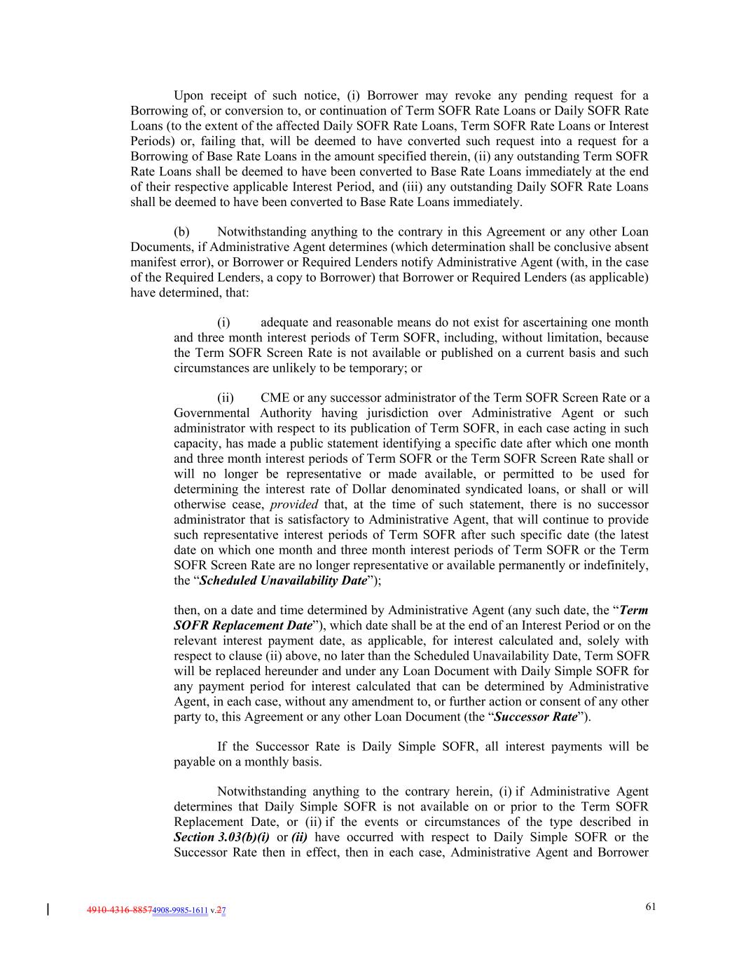4910-4316-88574908-9985-1611 v.27 61 Upon receipt of such notice, (i) Borrower may revoke any pending request for a Borrowing of, or conversion to, or continuation of Term SOFR Rate Loans or Daily SOFR Rate Loans (to the extent of the affected Daily SOFR Rate Loans, Term SOFR Rate Loans or Interest Periods) or, failing that, will be deemed to have converted such request into a request for a Borrowing of Base Rate Loans in the amount specified therein, (ii) any outstanding Term SOFR Rate Loans shall be deemed to have been converted to Base Rate Loans immediately at the end of their respective applicable Interest Period, and (iii) any outstanding Daily SOFR Rate Loans shall be deemed to have been converted to Base Rate Loans immediately. (b) Notwithstanding anything to the contrary in this Agreement or any other Loan Documents, if Administrative Agent determines (which determination shall be conclusive absent manifest error), or Borrower or Required Lenders notify Administrative Agent (with, in the case of the Required Lenders, a copy to Borrower) that Borrower or Required Lenders (as applicable) have determined, that: (i) adequate and reasonable means do not exist for ascertaining one month and three month interest periods of Term SOFR, including, without limitation, because the Term SOFR Screen Rate is not available or published on a current basis and such circumstances are unlikely to be temporary; or (ii) CME or any successor administrator of the Term SOFR Screen Rate or a Governmental Authority having jurisdiction over Administrative Agent or such administrator with respect to its publication of Term SOFR, in each case acting in such capacity, has made a public statement identifying a specific date after which one month and three month interest periods of Term SOFR or the Term SOFR Screen Rate shall or will no longer be representative or made available, or permitted to be used for determining the interest rate of Dollar denominated syndicated loans, or shall or will otherwise cease, provided that, at the time of such statement, there is no successor administrator that is satisfactory to Administrative Agent, that will continue to provide such representative interest periods of Term SOFR after such specific date (the latest date on which one month and three month interest periods of Term SOFR or the Term SOFR Screen Rate are no longer representative or available permanently or indefinitely, the “Scheduled Unavailability Date”); then, on a date and time determined by Administrative Agent (any such date, the “Term SOFR Replacement Date”), which date shall be at the end of an Interest Period or on the relevant interest payment date, as applicable, for interest calculated and, solely with respect to clause (ii) above, no later than the Scheduled Unavailability Date, Term SOFR will be replaced hereunder and under any Loan Document with Daily Simple SOFR for any payment period for interest calculated that can be determined by Administrative Agent, in each case, without any amendment to, or further action or consent of any other party to, this Agreement or any other Loan Document (the “Successor Rate”). If the Successor Rate is Daily Simple SOFR, all interest payments will be payable on a monthly basis. Notwithstanding anything to the contrary herein, (i) if Administrative Agent determines that Daily Simple SOFR is not available on or prior to the Term SOFR Replacement Date, or (ii) if the events or circumstances of the type described in Section 3.03(b)(i) or (ii) have occurred with respect to Daily Simple SOFR or the Successor Rate then in effect, then in each case, Administrative Agent and Borrower