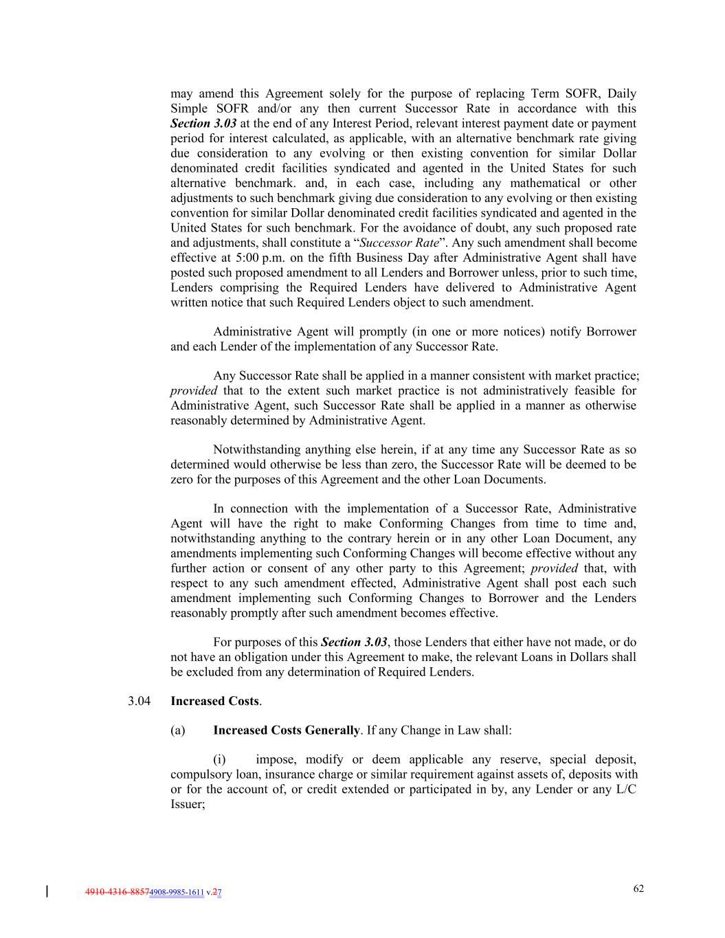 4910-4316-88574908-9985-1611 v.27 62 may amend this Agreement solely for the purpose of replacing Term SOFR, Daily Simple SOFR and/or any then current Successor Rate in accordance with this Section 3.03 at the end of any Interest Period, relevant interest payment date or payment period for interest calculated, as applicable, with an alternative benchmark rate giving due consideration to any evolving or then existing convention for similar Dollar denominated credit facilities syndicated and agented in the United States for such alternative benchmark. and, in each case, including any mathematical or other adjustments to such benchmark giving due consideration to any evolving or then existing convention for similar Dollar denominated credit facilities syndicated and agented in the United States for such benchmark. For the avoidance of doubt, any such proposed rate and adjustments, shall constitute a “Successor Rate”. Any such amendment shall become effective at 5:00 p.m. on the fifth Business Day after Administrative Agent shall have posted such proposed amendment to all Lenders and Borrower unless, prior to such time, Lenders comprising the Required Lenders have delivered to Administrative Agent written notice that such Required Lenders object to such amendment. Administrative Agent will promptly (in one or more notices) notify Borrower and each Lender of the implementation of any Successor Rate. Any Successor Rate shall be applied in a manner consistent with market practice; provided that to the extent such market practice is not administratively feasible for Administrative Agent, such Successor Rate shall be applied in a manner as otherwise reasonably determined by Administrative Agent. Notwithstanding anything else herein, if at any time any Successor Rate as so determined would otherwise be less than zero, the Successor Rate will be deemed to be zero for the purposes of this Agreement and the other Loan Documents. In connection with the implementation of a Successor Rate, Administrative Agent will have the right to make Conforming Changes from time to time and, notwithstanding anything to the contrary herein or in any other Loan Document, any amendments implementing such Conforming Changes will become effective without any further action or consent of any other party to this Agreement; provided that, with respect to any such amendment effected, Administrative Agent shall post each such amendment implementing such Conforming Changes to Borrower and the Lenders reasonably promptly after such amendment becomes effective. For purposes of this Section 3.03, those Lenders that either have not made, or do not have an obligation under this Agreement to make, the relevant Loans in Dollars shall be excluded from any determination of Required Lenders. 3.04 Increased Costs. (a) Increased Costs Generally. If any Change in Law shall: (i) impose, modify or deem applicable any reserve, special deposit, compulsory loan, insurance charge or similar requirement against assets of, deposits with or for the account of, or credit extended or participated in by, any Lender or any L/C Issuer;