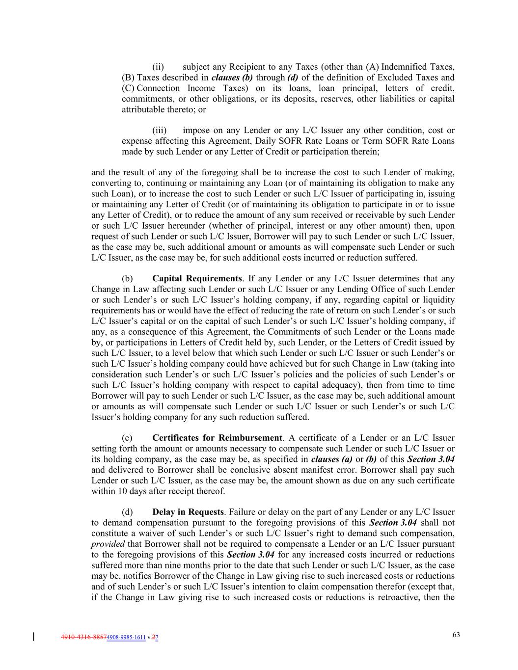 4910-4316-88574908-9985-1611 v.27 63 (ii) subject any Recipient to any Taxes (other than (A) Indemnified Taxes, (B) Taxes described in clauses (b) through (d) of the definition of Excluded Taxes and (C) Connection Income Taxes) on its loans, loan principal, letters of credit, commitments, or other obligations, or its deposits, reserves, other liabilities or capital attributable thereto; or (iii) impose on any Lender or any L/C Issuer any other condition, cost or expense affecting this Agreement, Daily SOFR Rate Loans or Term SOFR Rate Loans made by such Lender or any Letter of Credit or participation therein; and the result of any of the foregoing shall be to increase the cost to such Lender of making, converting to, continuing or maintaining any Loan (or of maintaining its obligation to make any such Loan), or to increase the cost to such Lender or such L/C Issuer of participating in, issuing or maintaining any Letter of Credit (or of maintaining its obligation to participate in or to issue any Letter of Credit), or to reduce the amount of any sum received or receivable by such Lender or such L/C Issuer hereunder (whether of principal, interest or any other amount) then, upon request of such Lender or such L/C Issuer, Borrower will pay to such Lender or such L/C Issuer, as the case may be, such additional amount or amounts as will compensate such Lender or such L/C Issuer, as the case may be, for such additional costs incurred or reduction suffered. (b) Capital Requirements. If any Lender or any L/C Issuer determines that any Change in Law affecting such Lender or such L/C Issuer or any Lending Office of such Lender or such Lender’s or such L/C Issuer’s holding company, if any, regarding capital or liquidity requirements has or would have the effect of reducing the rate of return on such Lender’s or such L/C Issuer’s capital or on the capital of such Lender’s or such L/C Issuer’s holding company, if any, as a consequence of this Agreement, the Commitments of such Lender or the Loans made by, or participations in Letters of Credit held by, such Lender, or the Letters of Credit issued by such L/C Issuer, to a level below that which such Lender or such L/C Issuer or such Lender’s or such L/C Issuer’s holding company could have achieved but for such Change in Law (taking into consideration such Lender’s or such L/C Issuer’s policies and the policies of such Lender’s or such L/C Issuer’s holding company with respect to capital adequacy), then from time to time Borrower will pay to such Lender or such L/C Issuer, as the case may be, such additional amount or amounts as will compensate such Lender or such L/C Issuer or such Lender’s or such L/C Issuer’s holding company for any such reduction suffered. (c) Certificates for Reimbursement. A certificate of a Lender or an L/C Issuer setting forth the amount or amounts necessary to compensate such Lender or such L/C Issuer or its holding company, as the case may be, as specified in clauses (a) or (b) of this Section 3.04 and delivered to Borrower shall be conclusive absent manifest error. Borrower shall pay such Lender or such L/C Issuer, as the case may be, the amount shown as due on any such certificate within 10 days after receipt thereof. (d) Delay in Requests. Failure or delay on the part of any Lender or any L/C Issuer to demand compensation pursuant to the foregoing provisions of this Section 3.04 shall not constitute a waiver of such Lender’s or such L/C Issuer’s right to demand such compensation, provided that Borrower shall not be required to compensate a Lender or an L/C Issuer pursuant to the foregoing provisions of this Section 3.04 for any increased costs incurred or reductions suffered more than nine months prior to the date that such Lender or such L/C Issuer, as the case may be, notifies Borrower of the Change in Law giving rise to such increased costs or reductions and of such Lender’s or such L/C Issuer’s intention to claim compensation therefor (except that, if the Change in Law giving rise to such increased costs or reductions is retroactive, then the