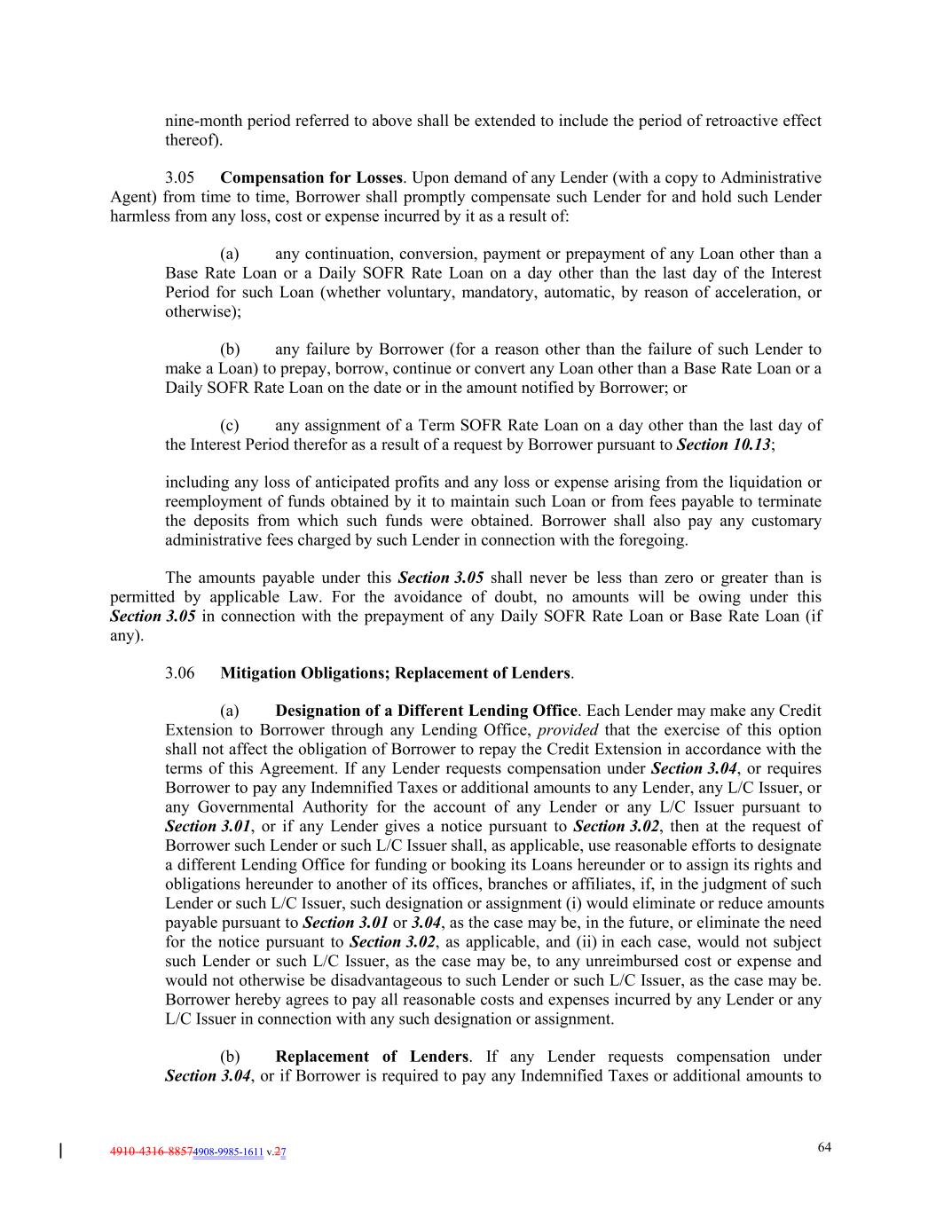 4910-4316-88574908-9985-1611 v.27 64 nine-month period referred to above shall be extended to include the period of retroactive effect thereof). 3.05 Compensation for Losses. Upon demand of any Lender (with a copy to Administrative Agent) from time to time, Borrower shall promptly compensate such Lender for and hold such Lender harmless from any loss, cost or expense incurred by it as a result of: (a) any continuation, conversion, payment or prepayment of any Loan other than a Base Rate Loan or a Daily SOFR Rate Loan on a day other than the last day of the Interest Period for such Loan (whether voluntary, mandatory, automatic, by reason of acceleration, or otherwise); (b) any failure by Borrower (for a reason other than the failure of such Lender to make a Loan) to prepay, borrow, continue or convert any Loan other than a Base Rate Loan or a Daily SOFR Rate Loan on the date or in the amount notified by Borrower; or (c) any assignment of a Term SOFR Rate Loan on a day other than the last day of the Interest Period therefor as a result of a request by Borrower pursuant to Section 10.13; including any loss of anticipated profits and any loss or expense arising from the liquidation or reemployment of funds obtained by it to maintain such Loan or from fees payable to terminate the deposits from which such funds were obtained. Borrower shall also pay any customary administrative fees charged by such Lender in connection with the foregoing. The amounts payable under this Section 3.05 shall never be less than zero or greater than is permitted by applicable Law. For the avoidance of doubt, no amounts will be owing under this Section 3.05 in connection with the prepayment of any Daily SOFR Rate Loan or Base Rate Loan (if any). 3.06 Mitigation Obligations; Replacement of Lenders. (a) Designation of a Different Lending Office. Each Lender may make any Credit Extension to Borrower through any Lending Office, provided that the exercise of this option shall not affect the obligation of Borrower to repay the Credit Extension in accordance with the terms of this Agreement. If any Lender requests compensation under Section 3.04, or requires Borrower to pay any Indemnified Taxes or additional amounts to any Lender, any L/C Issuer, or any Governmental Authority for the account of any Lender or any L/C Issuer pursuant to Section 3.01, or if any Lender gives a notice pursuant to Section 3.02, then at the request of Borrower such Lender or such L/C Issuer shall, as applicable, use reasonable efforts to designate a different Lending Office for funding or booking its Loans hereunder or to assign its rights and obligations hereunder to another of its offices, branches or affiliates, if, in the judgment of such Lender or such L/C Issuer, such designation or assignment (i) would eliminate or reduce amounts payable pursuant to Section 3.01 or 3.04, as the case may be, in the future, or eliminate the need for the notice pursuant to Section 3.02, as applicable, and (ii) in each case, would not subject such Lender or such L/C Issuer, as the case may be, to any unreimbursed cost or expense and would not otherwise be disadvantageous to such Lender or such L/C Issuer, as the case may be. Borrower hereby agrees to pay all reasonable costs and expenses incurred by any Lender or any L/C Issuer in connection with any such designation or assignment. (b) Replacement of Lenders. If any Lender requests compensation under Section 3.04, or if Borrower is required to pay any Indemnified Taxes or additional amounts to