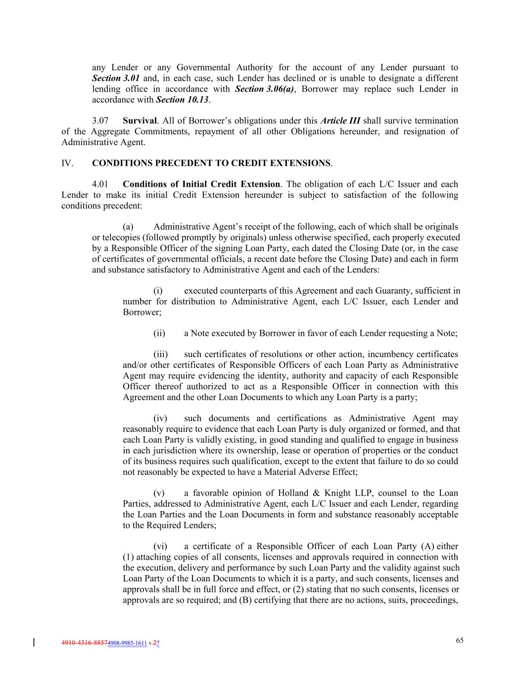4910-4316-88574908-9985-1611 v.27 65 any Lender or any Governmental Authority for the account of any Lender pursuant to Section 3.01 and, in each case, such Lender has declined or is unable to designate a different lending office in accordance with Section 3.06(a), Borrower may replace such Lender in accordance with Section 10.13. 3.07 Survival. All of Borrower’s obligations under this Article III shall survive termination of the Aggregate Commitments, repayment of all other Obligations hereunder, and resignation of Administrative Agent. IV. CONDITIONS PRECEDENT TO CREDIT EXTENSIONS. 4.01 Conditions of Initial Credit Extension. The obligation of each L/C Issuer and each Lender to make its initial Credit Extension hereunder is subject to satisfaction of the following conditions precedent: (a) Administrative Agent’s receipt of the following, each of which shall be originals or telecopies (followed promptly by originals) unless otherwise specified, each properly executed by a Responsible Officer of the signing Loan Party, each dated the Closing Date (or, in the case of certificates of governmental officials, a recent date before the Closing Date) and each in form and substance satisfactory to Administrative Agent and each of the Lenders: (i) executed counterparts of this Agreement and each Guaranty, sufficient in number for distribution to Administrative Agent, each L/C Issuer, each Lender and Borrower; (ii) a Note executed by Borrower in favor of each Lender requesting a Note; (iii) such certificates of resolutions or other action, incumbency certificates and/or other certificates of Responsible Officers of each Loan Party as Administrative Agent may require evidencing the identity, authority and capacity of each Responsible Officer thereof authorized to act as a Responsible Officer in connection with this Agreement and the other Loan Documents to which any Loan Party is a party; (iv) such documents and certifications as Administrative Agent may reasonably require to evidence that each Loan Party is duly organized or formed, and that each Loan Party is validly existing, in good standing and qualified to engage in business in each jurisdiction where its ownership, lease or operation of properties or the conduct of its business requires such qualification, except to the extent that failure to do so could not reasonably be expected to have a Material Adverse Effect; (v) a favorable opinion of Holland & Knight LLP, counsel to the Loan Parties, addressed to Administrative Agent, each L/C Issuer and each Lender, regarding the Loan Parties and the Loan Documents in form and substance reasonably acceptable to the Required Lenders; (vi) a certificate of a Responsible Officer of each Loan Party (A) either (1) attaching copies of all consents, licenses and approvals required in connection with the execution, delivery and performance by such Loan Party and the validity against such Loan Party of the Loan Documents to which it is a party, and such consents, licenses and approvals shall be in full force and effect, or (2) stating that no such consents, licenses or approvals are so required; and (B) certifying that there are no actions, suits, proceedings,