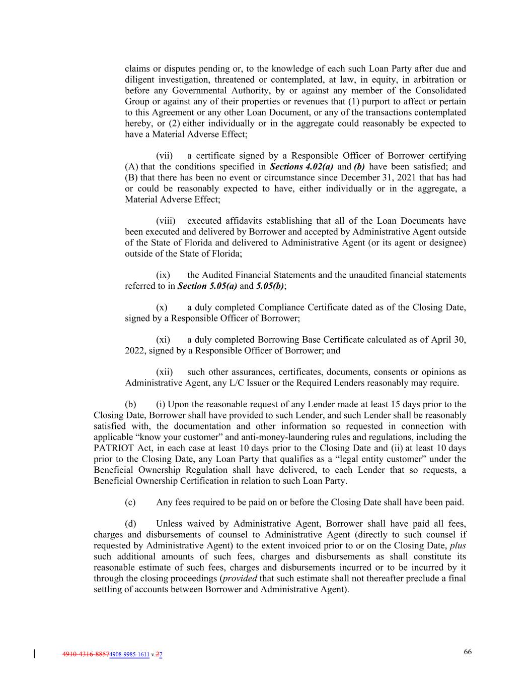 4910-4316-88574908-9985-1611 v.27 66 claims or disputes pending or, to the knowledge of each such Loan Party after due and diligent investigation, threatened or contemplated, at law, in equity, in arbitration or before any Governmental Authority, by or against any member of the Consolidated Group or against any of their properties or revenues that (1) purport to affect or pertain to this Agreement or any other Loan Document, or any of the transactions contemplated hereby, or (2) either individually or in the aggregate could reasonably be expected to have a Material Adverse Effect; (vii) a certificate signed by a Responsible Officer of Borrower certifying (A) that the conditions specified in Sections 4.02(a) and (b) have been satisfied; and (B) that there has been no event or circumstance since December 31, 2021 that has had or could be reasonably expected to have, either individually or in the aggregate, a Material Adverse Effect; (viii) executed affidavits establishing that all of the Loan Documents have been executed and delivered by Borrower and accepted by Administrative Agent outside of the State of Florida and delivered to Administrative Agent (or its agent or designee) outside of the State of Florida; (ix) the Audited Financial Statements and the unaudited financial statements referred to in Section 5.05(a) and 5.05(b); (x) a duly completed Compliance Certificate dated as of the Closing Date, signed by a Responsible Officer of Borrower; (xi) a duly completed Borrowing Base Certificate calculated as of April 30, 2022, signed by a Responsible Officer of Borrower; and (xii) such other assurances, certificates, documents, consents or opinions as Administrative Agent, any L/C Issuer or the Required Lenders reasonably may require. (b) (i) Upon the reasonable request of any Lender made at least 15 days prior to the Closing Date, Borrower shall have provided to such Lender, and such Lender shall be reasonably satisfied with, the documentation and other information so requested in connection with applicable “know your customer” and anti-money-laundering rules and regulations, including the PATRIOT Act, in each case at least 10 days prior to the Closing Date and (ii) at least 10 days prior to the Closing Date, any Loan Party that qualifies as a “legal entity customer” under the Beneficial Ownership Regulation shall have delivered, to each Lender that so requests, a Beneficial Ownership Certification in relation to such Loan Party. (c) Any fees required to be paid on or before the Closing Date shall have been paid. (d) Unless waived by Administrative Agent, Borrower shall have paid all fees, charges and disbursements of counsel to Administrative Agent (directly to such counsel if requested by Administrative Agent) to the extent invoiced prior to or on the Closing Date, plus such additional amounts of such fees, charges and disbursements as shall constitute its reasonable estimate of such fees, charges and disbursements incurred or to be incurred by it through the closing proceedings (provided that such estimate shall not thereafter preclude a final settling of accounts between Borrower and Administrative Agent).