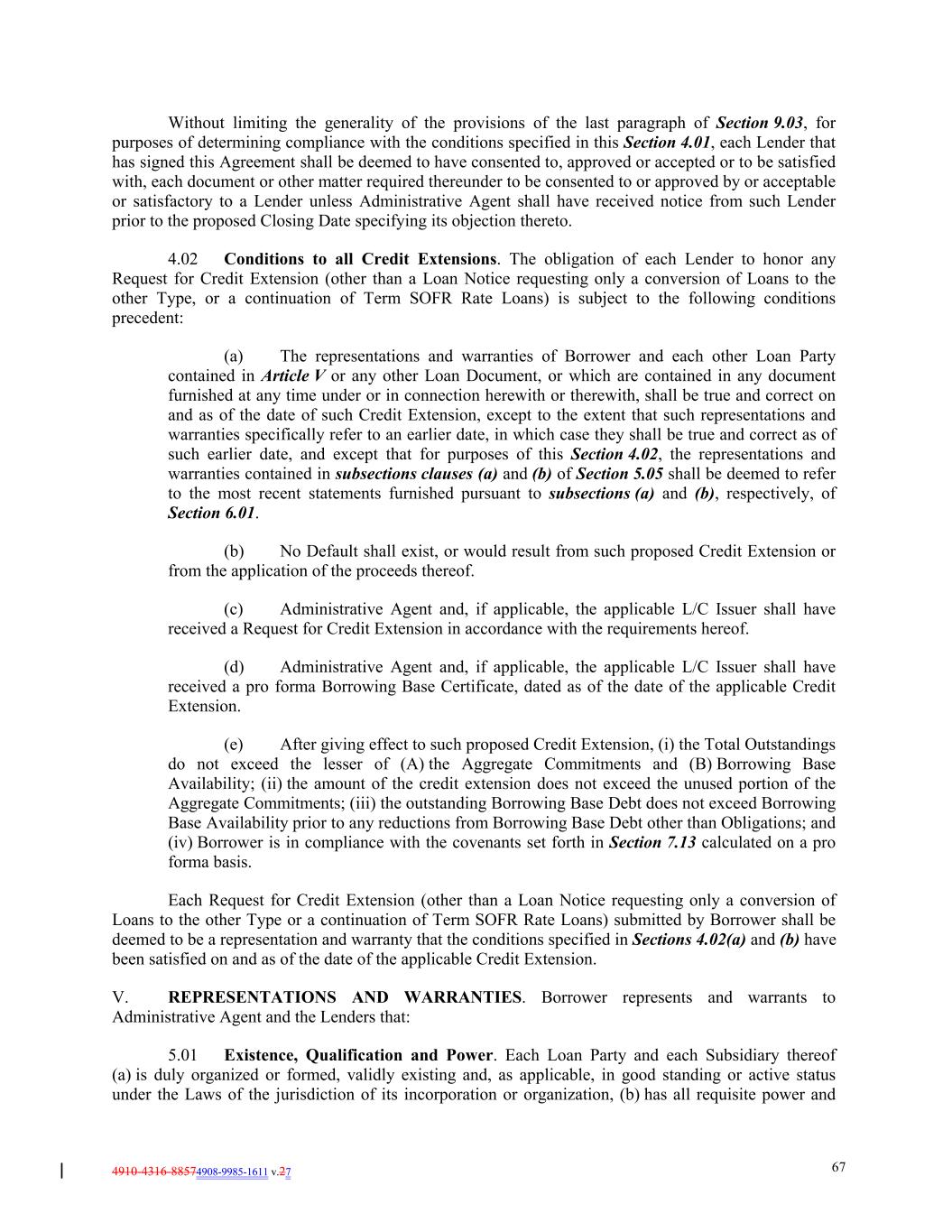 4910-4316-88574908-9985-1611 v.27 67 Without limiting the generality of the provisions of the last paragraph of Section 9.03, for purposes of determining compliance with the conditions specified in this Section 4.01, each Lender that has signed this Agreement shall be deemed to have consented to, approved or accepted or to be satisfied with, each document or other matter required thereunder to be consented to or approved by or acceptable or satisfactory to a Lender unless Administrative Agent shall have received notice from such Lender prior to the proposed Closing Date specifying its objection thereto. 4.02 Conditions to all Credit Extensions. The obligation of each Lender to honor any Request for Credit Extension (other than a Loan Notice requesting only a conversion of Loans to the other Type, or a continuation of Term SOFR Rate Loans) is subject to the following conditions precedent: (a) The representations and warranties of Borrower and each other Loan Party contained in Article V or any other Loan Document, or which are contained in any document furnished at any time under or in connection herewith or therewith, shall be true and correct on and as of the date of such Credit Extension, except to the extent that such representations and warranties specifically refer to an earlier date, in which case they shall be true and correct as of such earlier date, and except that for purposes of this Section 4.02, the representations and warranties contained in subsections clauses (a) and (b) of Section 5.05 shall be deemed to refer to the most recent statements furnished pursuant to subsections (a) and (b), respectively, of Section 6.01. (b) No Default shall exist, or would result from such proposed Credit Extension or from the application of the proceeds thereof. (c) Administrative Agent and, if applicable, the applicable L/C Issuer shall have received a Request for Credit Extension in accordance with the requirements hereof. (d) Administrative Agent and, if applicable, the applicable L/C Issuer shall have received a pro forma Borrowing Base Certificate, dated as of the date of the applicable Credit Extension. (e) After giving effect to such proposed Credit Extension, (i) the Total Outstandings do not exceed the lesser of (A) the Aggregate Commitments and (B) Borrowing Base Availability; (ii) the amount of the credit extension does not exceed the unused portion of the Aggregate Commitments; (iii) the outstanding Borrowing Base Debt does not exceed Borrowing Base Availability prior to any reductions from Borrowing Base Debt other than Obligations; and (iv) Borrower is in compliance with the covenants set forth in Section 7.13 calculated on a pro forma basis. Each Request for Credit Extension (other than a Loan Notice requesting only a conversion of Loans to the other Type or a continuation of Term SOFR Rate Loans) submitted by Borrower shall be deemed to be a representation and warranty that the conditions specified in Sections 4.02(a) and (b) have been satisfied on and as of the date of the applicable Credit Extension. V. REPRESENTATIONS AND WARRANTIES. Borrower represents and warrants to Administrative Agent and the Lenders that: 5.01 Existence, Qualification and Power. Each Loan Party and each Subsidiary thereof (a) is duly organized or formed, validly existing and, as applicable, in good standing or active status under the Laws of the jurisdiction of its incorporation or organization, (b) has all requisite power and