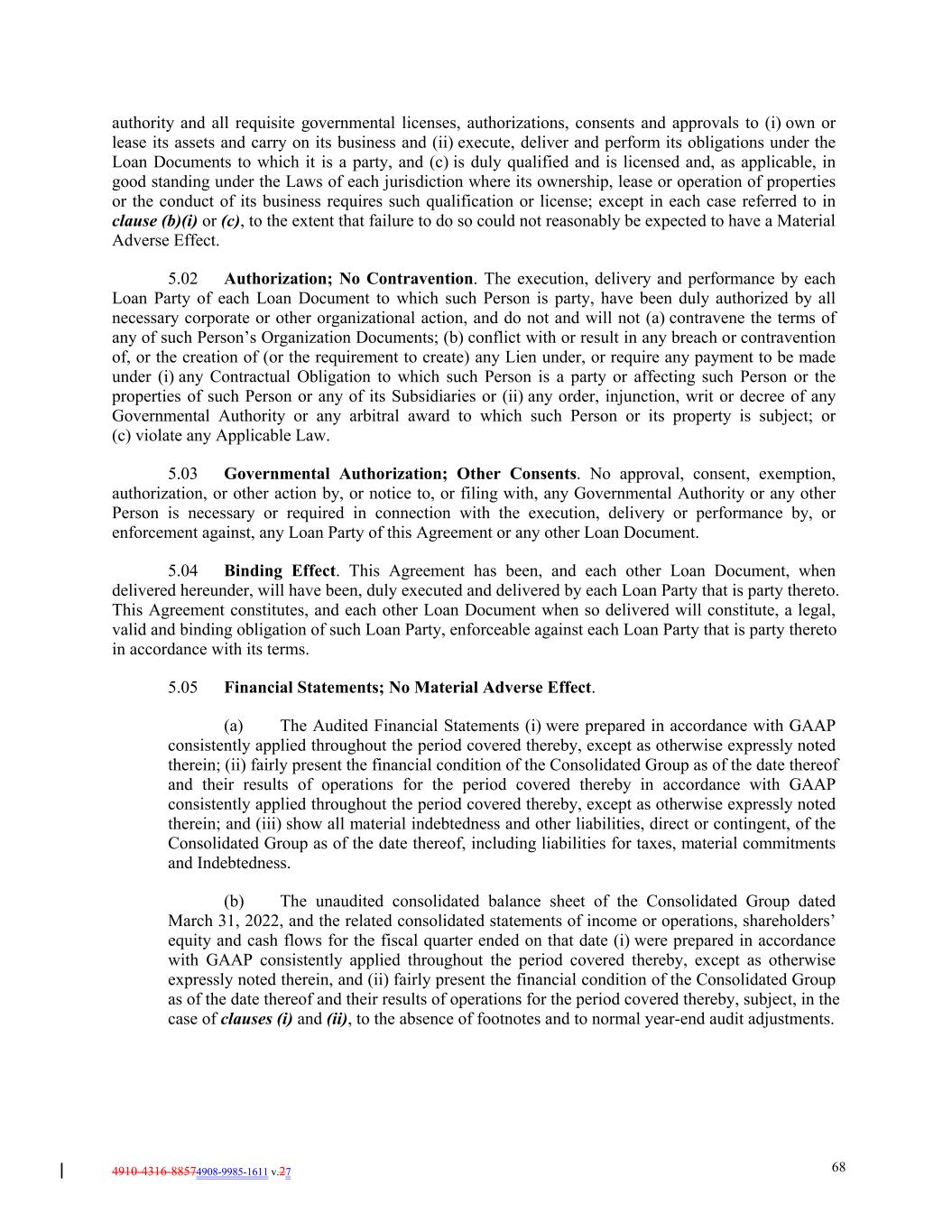 4910-4316-88574908-9985-1611 v.27 68 authority and all requisite governmental licenses, authorizations, consents and approvals to (i) own or lease its assets and carry on its business and (ii) execute, deliver and perform its obligations under the Loan Documents to which it is a party, and (c) is duly qualified and is licensed and, as applicable, in good standing under the Laws of each jurisdiction where its ownership, lease or operation of properties or the conduct of its business requires such qualification or license; except in each case referred to in clause (b)(i) or (c), to the extent that failure to do so could not reasonably be expected to have a Material Adverse Effect. 5.02 Authorization; No Contravention. The execution, delivery and performance by each Loan Party of each Loan Document to which such Person is party, have been duly authorized by all necessary corporate or other organizational action, and do not and will not (a) contravene the terms of any of such Person’s Organization Documents; (b) conflict with or result in any breach or contravention of, or the creation of (or the requirement to create) any Lien under, or require any payment to be made under (i) any Contractual Obligation to which such Person is a party or affecting such Person or the properties of such Person or any of its Subsidiaries or (ii) any order, injunction, writ or decree of any Governmental Authority or any arbitral award to which such Person or its property is subject; or (c) violate any Applicable Law. 5.03 Governmental Authorization; Other Consents. No approval, consent, exemption, authorization, or other action by, or notice to, or filing with, any Governmental Authority or any other Person is necessary or required in connection with the execution, delivery or performance by, or enforcement against, any Loan Party of this Agreement or any other Loan Document. 5.04 Binding Effect. This Agreement has been, and each other Loan Document, when delivered hereunder, will have been, duly executed and delivered by each Loan Party that is party thereto. This Agreement constitutes, and each other Loan Document when so delivered will constitute, a legal, valid and binding obligation of such Loan Party, enforceable against each Loan Party that is party thereto in accordance with its terms. 5.05 Financial Statements; No Material Adverse Effect. (a) The Audited Financial Statements (i) were prepared in accordance with GAAP consistently applied throughout the period covered thereby, except as otherwise expressly noted therein; (ii) fairly present the financial condition of the Consolidated Group as of the date thereof and their results of operations for the period covered thereby in accordance with GAAP consistently applied throughout the period covered thereby, except as otherwise expressly noted therein; and (iii) show all material indebtedness and other liabilities, direct or contingent, of the Consolidated Group as of the date thereof, including liabilities for taxes, material commitments and Indebtedness. (b) The unaudited consolidated balance sheet of the Consolidated Group dated March 31, 2022, and the related consolidated statements of income or operations, shareholders’ equity and cash flows for the fiscal quarter ended on that date (i) were prepared in accordance with GAAP consistently applied throughout the period covered thereby, except as otherwise expressly noted therein, and (ii) fairly present the financial condition of the Consolidated Group as of the date thereof and their results of operations for the period covered thereby, subject, in the case of clauses (i) and (ii), to the absence of footnotes and to normal year-end audit adjustments.