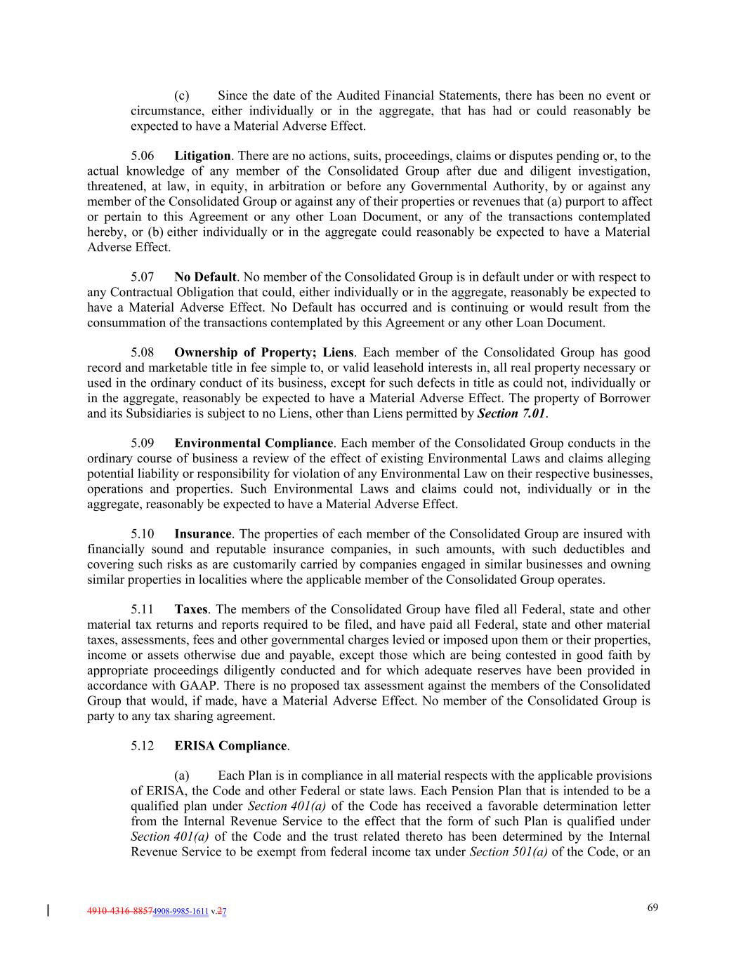 4910-4316-88574908-9985-1611 v.27 69 (c) Since the date of the Audited Financial Statements, there has been no event or circumstance, either individually or in the aggregate, that has had or could reasonably be expected to have a Material Adverse Effect. 5.06 Litigation. There are no actions, suits, proceedings, claims or disputes pending or, to the actual knowledge of any member of the Consolidated Group after due and diligent investigation, threatened, at law, in equity, in arbitration or before any Governmental Authority, by or against any member of the Consolidated Group or against any of their properties or revenues that (a) purport to affect or pertain to this Agreement or any other Loan Document, or any of the transactions contemplated hereby, or (b) either individually or in the aggregate could reasonably be expected to have a Material Adverse Effect. 5.07 No Default. No member of the Consolidated Group is in default under or with respect to any Contractual Obligation that could, either individually or in the aggregate, reasonably be expected to have a Material Adverse Effect. No Default has occurred and is continuing or would result from the consummation of the transactions contemplated by this Agreement or any other Loan Document. 5.08 Ownership of Property; Liens. Each member of the Consolidated Group has good record and marketable title in fee simple to, or valid leasehold interests in, all real property necessary or used in the ordinary conduct of its business, except for such defects in title as could not, individually or in the aggregate, reasonably be expected to have a Material Adverse Effect. The property of Borrower and its Subsidiaries is subject to no Liens, other than Liens permitted by Section 7.01. 5.09 Environmental Compliance. Each member of the Consolidated Group conducts in the ordinary course of business a review of the effect of existing Environmental Laws and claims alleging potential liability or responsibility for violation of any Environmental Law on their respective businesses, operations and properties. Such Environmental Laws and claims could not, individually or in the aggregate, reasonably be expected to have a Material Adverse Effect. 5.10 Insurance. The properties of each member of the Consolidated Group are insured with financially sound and reputable insurance companies, in such amounts, with such deductibles and covering such risks as are customarily carried by companies engaged in similar businesses and owning similar properties in localities where the applicable member of the Consolidated Group operates. 5.11 Taxes. The members of the Consolidated Group have filed all Federal, state and other material tax returns and reports required to be filed, and have paid all Federal, state and other material taxes, assessments, fees and other governmental charges levied or imposed upon them or their properties, income or assets otherwise due and payable, except those which are being contested in good faith by appropriate proceedings diligently conducted and for which adequate reserves have been provided in accordance with GAAP. There is no proposed tax assessment against the members of the Consolidated Group that would, if made, have a Material Adverse Effect. No member of the Consolidated Group is party to any tax sharing agreement. 5.12 ERISA Compliance. (a) Each Plan is in compliance in all material respects with the applicable provisions of ERISA, the Code and other Federal or state laws. Each Pension Plan that is intended to be a qualified plan under Section 401(a) of the Code has received a favorable determination letter from the Internal Revenue Service to the effect that the form of such Plan is qualified under Section 401(a) of the Code and the trust related thereto has been determined by the Internal Revenue Service to be exempt from federal income tax under Section 501(a) of the Code, or an