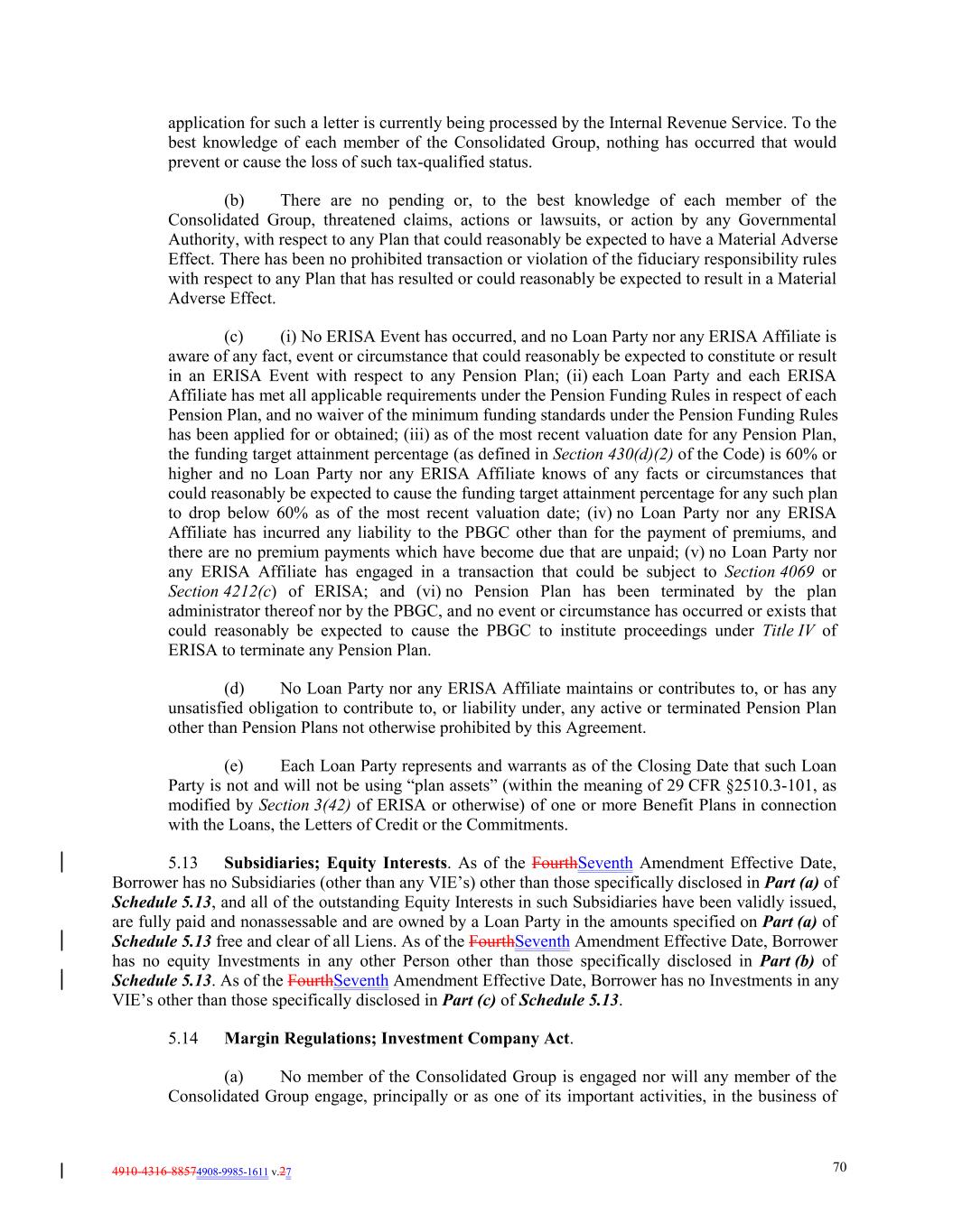 4910-4316-88574908-9985-1611 v.27 70 application for such a letter is currently being processed by the Internal Revenue Service. To the best knowledge of each member of the Consolidated Group, nothing has occurred that would prevent or cause the loss of such tax-qualified status. (b) There are no pending or, to the best knowledge of each member of the Consolidated Group, threatened claims, actions or lawsuits, or action by any Governmental Authority, with respect to any Plan that could reasonably be expected to have a Material Adverse Effect. There has been no prohibited transaction or violation of the fiduciary responsibility rules with respect to any Plan that has resulted or could reasonably be expected to result in a Material Adverse Effect. (c) (i) No ERISA Event has occurred, and no Loan Party nor any ERISA Affiliate is aware of any fact, event or circumstance that could reasonably be expected to constitute or result in an ERISA Event with respect to any Pension Plan; (ii) each Loan Party and each ERISA Affiliate has met all applicable requirements under the Pension Funding Rules in respect of each Pension Plan, and no waiver of the minimum funding standards under the Pension Funding Rules has been applied for or obtained; (iii) as of the most recent valuation date for any Pension Plan, the funding target attainment percentage (as defined in Section 430(d)(2) of the Code) is 60% or higher and no Loan Party nor any ERISA Affiliate knows of any facts or circumstances that could reasonably be expected to cause the funding target attainment percentage for any such plan to drop below 60% as of the most recent valuation date; (iv) no Loan Party nor any ERISA Affiliate has incurred any liability to the PBGC other than for the payment of premiums, and there are no premium payments which have become due that are unpaid; (v) no Loan Party nor any ERISA Affiliate has engaged in a transaction that could be subject to Section 4069 or Section 4212(c) of ERISA; and (vi) no Pension Plan has been terminated by the plan administrator thereof nor by the PBGC, and no event or circumstance has occurred or exists that could reasonably be expected to cause the PBGC to institute proceedings under Title IV of ERISA to terminate any Pension Plan. (d) No Loan Party nor any ERISA Affiliate maintains or contributes to, or has any unsatisfied obligation to contribute to, or liability under, any active or terminated Pension Plan other than Pension Plans not otherwise prohibited by this Agreement. (e) Each Loan Party represents and warrants as of the Closing Date that such Loan Party is not and will not be using “plan assets” (within the meaning of 29 CFR §2510.3-101, as modified by Section 3(42) of ERISA or otherwise) of one or more Benefit Plans in connection with the Loans, the Letters of Credit or the Commitments. 5.13 Subsidiaries; Equity Interests. As of the FourthSeventh Amendment Effective Date, Borrower has no Subsidiaries (other than any VIE’s) other than those specifically disclosed in Part (a) of Schedule 5.13, and all of the outstanding Equity Interests in such Subsidiaries have been validly issued, are fully paid and nonassessable and are owned by a Loan Party in the amounts specified on Part (a) of Schedule 5.13 free and clear of all Liens. As of the FourthSeventh Amendment Effective Date, Borrower has no equity Investments in any other Person other than those specifically disclosed in Part (b) of Schedule 5.13. As of the FourthSeventh Amendment Effective Date, Borrower has no Investments in any VIE’s other than those specifically disclosed in Part (c) of Schedule 5.13. 5.14 Margin Regulations; Investment Company Act. (a) No member of the Consolidated Group is engaged nor will any member of the Consolidated Group engage, principally or as one of its important activities, in the business of