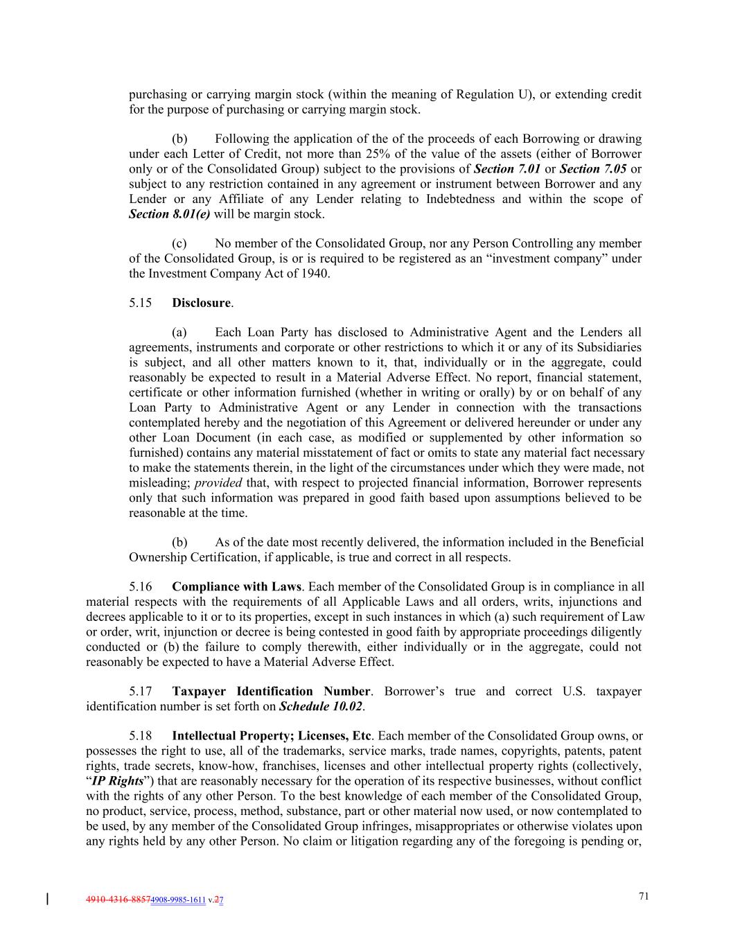4910-4316-88574908-9985-1611 v.27 71 purchasing or carrying margin stock (within the meaning of Regulation U), or extending credit for the purpose of purchasing or carrying margin stock. (b) Following the application of the of the proceeds of each Borrowing or drawing under each Letter of Credit, not more than 25% of the value of the assets (either of Borrower only or of the Consolidated Group) subject to the provisions of Section 7.01 or Section 7.05 or subject to any restriction contained in any agreement or instrument between Borrower and any Lender or any Affiliate of any Lender relating to Indebtedness and within the scope of Section 8.01(e) will be margin stock. (c) No member of the Consolidated Group, nor any Person Controlling any member of the Consolidated Group, is or is required to be registered as an “investment company” under the Investment Company Act of 1940. 5.15 Disclosure. (a) Each Loan Party has disclosed to Administrative Agent and the Lenders all agreements, instruments and corporate or other restrictions to which it or any of its Subsidiaries is subject, and all other matters known to it, that, individually or in the aggregate, could reasonably be expected to result in a Material Adverse Effect. No report, financial statement, certificate or other information furnished (whether in writing or orally) by or on behalf of any Loan Party to Administrative Agent or any Lender in connection with the transactions contemplated hereby and the negotiation of this Agreement or delivered hereunder or under any other Loan Document (in each case, as modified or supplemented by other information so furnished) contains any material misstatement of fact or omits to state any material fact necessary to make the statements therein, in the light of the circumstances under which they were made, not misleading; provided that, with respect to projected financial information, Borrower represents only that such information was prepared in good faith based upon assumptions believed to be reasonable at the time. (b) As of the date most recently delivered, the information included in the Beneficial Ownership Certification, if applicable, is true and correct in all respects. 5.16 Compliance with Laws. Each member of the Consolidated Group is in compliance in all material respects with the requirements of all Applicable Laws and all orders, writs, injunctions and decrees applicable to it or to its properties, except in such instances in which (a) such requirement of Law or order, writ, injunction or decree is being contested in good faith by appropriate proceedings diligently conducted or (b) the failure to comply therewith, either individually or in the aggregate, could not reasonably be expected to have a Material Adverse Effect. 5.17 Taxpayer Identification Number. Borrower’s true and correct U.S. taxpayer identification number is set forth on Schedule 10.02. 5.18 Intellectual Property; Licenses, Etc. Each member of the Consolidated Group owns, or possesses the right to use, all of the trademarks, service marks, trade names, copyrights, patents, patent rights, trade secrets, know-how, franchises, licenses and other intellectual property rights (collectively, “IP Rights”) that are reasonably necessary for the operation of its respective businesses, without conflict with the rights of any other Person. To the best knowledge of each member of the Consolidated Group, no product, service, process, method, substance, part or other material now used, or now contemplated to be used, by any member of the Consolidated Group infringes, misappropriates or otherwise violates upon any rights held by any other Person. No claim or litigation regarding any of the foregoing is pending or,