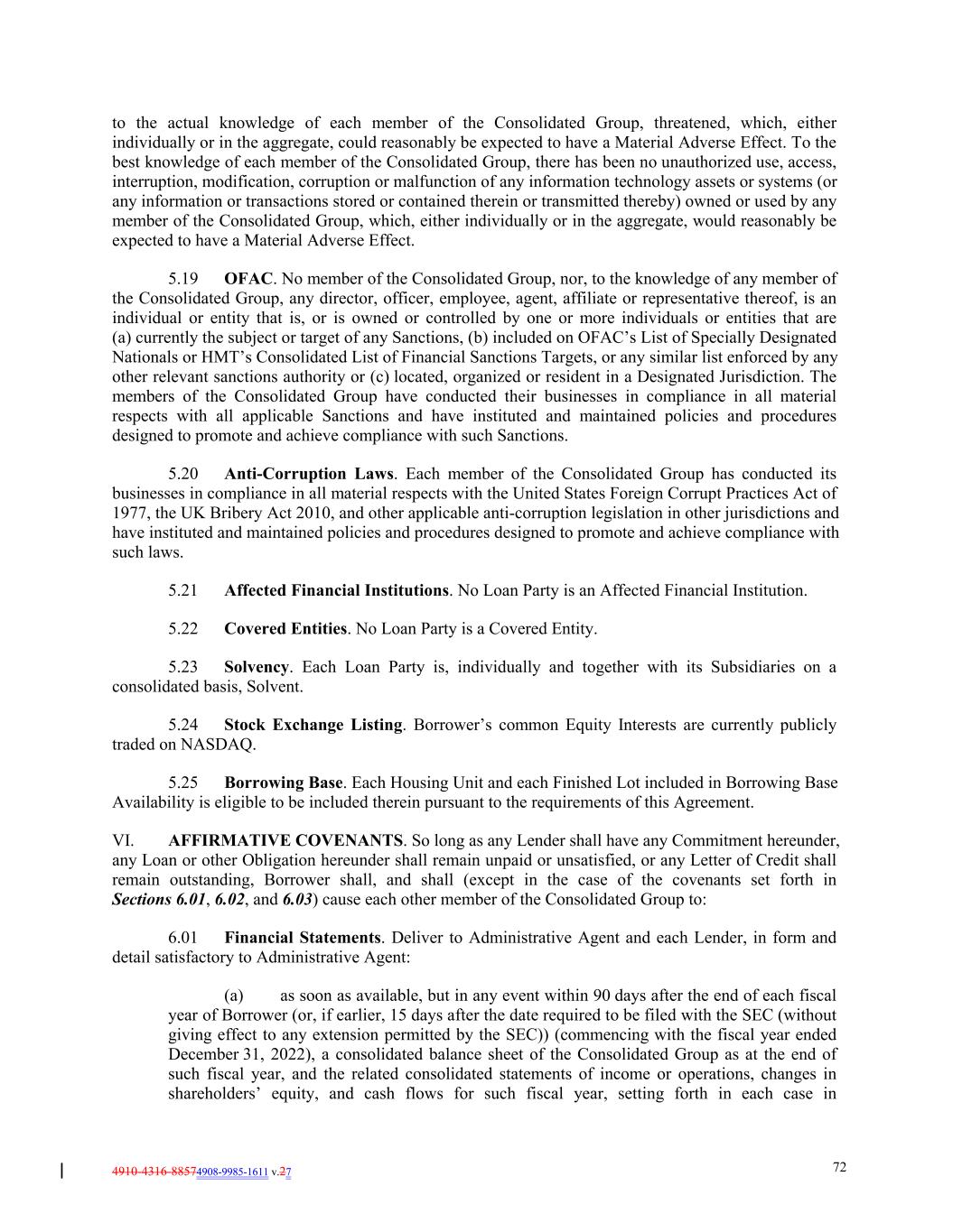 4910-4316-88574908-9985-1611 v.27 72 to the actual knowledge of each member of the Consolidated Group, threatened, which, either individually or in the aggregate, could reasonably be expected to have a Material Adverse Effect. To the best knowledge of each member of the Consolidated Group, there has been no unauthorized use, access, interruption, modification, corruption or malfunction of any information technology assets or systems (or any information or transactions stored or contained therein or transmitted thereby) owned or used by any member of the Consolidated Group, which, either individually or in the aggregate, would reasonably be expected to have a Material Adverse Effect. 5.19 OFAC. No member of the Consolidated Group, nor, to the knowledge of any member of the Consolidated Group, any director, officer, employee, agent, affiliate or representative thereof, is an individual or entity that is, or is owned or controlled by one or more individuals or entities that are (a) currently the subject or target of any Sanctions, (b) included on OFAC’s List of Specially Designated Nationals or HMT’s Consolidated List of Financial Sanctions Targets, or any similar list enforced by any other relevant sanctions authority or (c) located, organized or resident in a Designated Jurisdiction. The members of the Consolidated Group have conducted their businesses in compliance in all material respects with all applicable Sanctions and have instituted and maintained policies and procedures designed to promote and achieve compliance with such Sanctions. 5.20 Anti-Corruption Laws. Each member of the Consolidated Group has conducted its businesses in compliance in all material respects with the United States Foreign Corrupt Practices Act of 1977, the UK Bribery Act 2010, and other applicable anti-corruption legislation in other jurisdictions and have instituted and maintained policies and procedures designed to promote and achieve compliance with such laws. 5.21 Affected Financial Institutions. No Loan Party is an Affected Financial Institution. 5.22 Covered Entities. No Loan Party is a Covered Entity. 5.23 Solvency. Each Loan Party is, individually and together with its Subsidiaries on a consolidated basis, Solvent. 5.24 Stock Exchange Listing. Borrower’s common Equity Interests are currently publicly traded on NASDAQ. 5.25 Borrowing Base. Each Housing Unit and each Finished Lot included in Borrowing Base Availability is eligible to be included therein pursuant to the requirements of this Agreement. VI. AFFIRMATIVE COVENANTS. So long as any Lender shall have any Commitment hereunder, any Loan or other Obligation hereunder shall remain unpaid or unsatisfied, or any Letter of Credit shall remain outstanding, Borrower shall, and shall (except in the case of the covenants set forth in Sections 6.01, 6.02, and 6.03) cause each other member of the Consolidated Group to: 6.01 Financial Statements. Deliver to Administrative Agent and each Lender, in form and detail satisfactory to Administrative Agent: (a) as soon as available, but in any event within 90 days after the end of each fiscal year of Borrower (or, if earlier, 15 days after the date required to be filed with the SEC (without giving effect to any extension permitted by the SEC)) (commencing with the fiscal year ended December 31, 2022), a consolidated balance sheet of the Consolidated Group as at the end of such fiscal year, and the related consolidated statements of income or operations, changes in shareholders’ equity, and cash flows for such fiscal year, setting forth in each case in