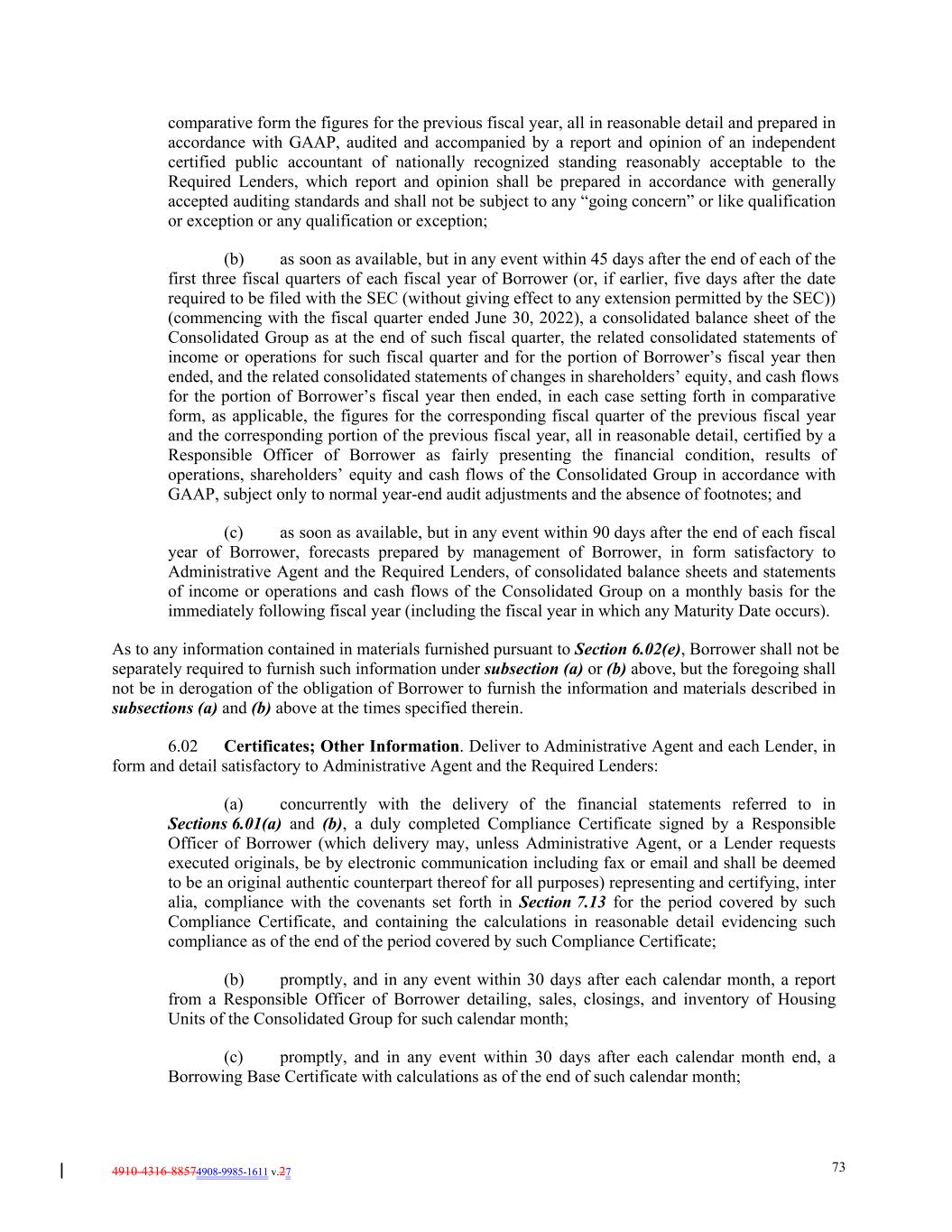 4910-4316-88574908-9985-1611 v.27 73 comparative form the figures for the previous fiscal year, all in reasonable detail and prepared in accordance with GAAP, audited and accompanied by a report and opinion of an independent certified public accountant of nationally recognized standing reasonably acceptable to the Required Lenders, which report and opinion shall be prepared in accordance with generally accepted auditing standards and shall not be subject to any “going concern” or like qualification or exception or any qualification or exception; (b) as soon as available, but in any event within 45 days after the end of each of the first three fiscal quarters of each fiscal year of Borrower (or, if earlier, five days after the date required to be filed with the SEC (without giving effect to any extension permitted by the SEC)) (commencing with the fiscal quarter ended June 30, 2022), a consolidated balance sheet of the Consolidated Group as at the end of such fiscal quarter, the related consolidated statements of income or operations for such fiscal quarter and for the portion of Borrower’s fiscal year then ended, and the related consolidated statements of changes in shareholders’ equity, and cash flows for the portion of Borrower’s fiscal year then ended, in each case setting forth in comparative form, as applicable, the figures for the corresponding fiscal quarter of the previous fiscal year and the corresponding portion of the previous fiscal year, all in reasonable detail, certified by a Responsible Officer of Borrower as fairly presenting the financial condition, results of operations, shareholders’ equity and cash flows of the Consolidated Group in accordance with GAAP, subject only to normal year-end audit adjustments and the absence of footnotes; and (c) as soon as available, but in any event within 90 days after the end of each fiscal year of Borrower, forecasts prepared by management of Borrower, in form satisfactory to Administrative Agent and the Required Lenders, of consolidated balance sheets and statements of income or operations and cash flows of the Consolidated Group on a monthly basis for the immediately following fiscal year (including the fiscal year in which any Maturity Date occurs). As to any information contained in materials furnished pursuant to Section 6.02(e), Borrower shall not be separately required to furnish such information under subsection (a) or (b) above, but the foregoing shall not be in derogation of the obligation of Borrower to furnish the information and materials described in subsections (a) and (b) above at the times specified therein. 6.02 Certificates; Other Information. Deliver to Administrative Agent and each Lender, in form and detail satisfactory to Administrative Agent and the Required Lenders: (a) concurrently with the delivery of the financial statements referred to in Sections 6.01(a) and (b), a duly completed Compliance Certificate signed by a Responsible Officer of Borrower (which delivery may, unless Administrative Agent, or a Lender requests executed originals, be by electronic communication including fax or email and shall be deemed to be an original authentic counterpart thereof for all purposes) representing and certifying, inter alia, compliance with the covenants set forth in Section 7.13 for the period covered by such Compliance Certificate, and containing the calculations in reasonable detail evidencing such compliance as of the end of the period covered by such Compliance Certificate; (b) promptly, and in any event within 30 days after each calendar month, a report from a Responsible Officer of Borrower detailing, sales, closings, and inventory of Housing Units of the Consolidated Group for such calendar month; (c) promptly, and in any event within 30 days after each calendar month end, a Borrowing Base Certificate with calculations as of the end of such calendar month;