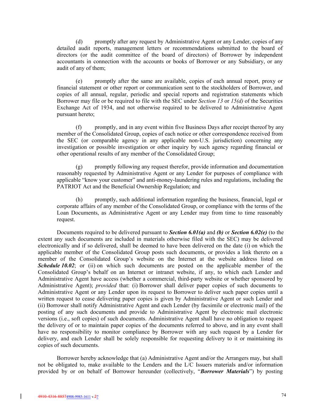 4910-4316-88574908-9985-1611 v.27 74 (d) promptly after any request by Administrative Agent or any Lender, copies of any detailed audit reports, management letters or recommendations submitted to the board of directors (or the audit committee of the board of directors) of Borrower by independent accountants in connection with the accounts or books of Borrower or any Subsidiary, or any audit of any of them; (e) promptly after the same are available, copies of each annual report, proxy or financial statement or other report or communication sent to the stockholders of Borrower, and copies of all annual, regular, periodic and special reports and registration statements which Borrower may file or be required to file with the SEC under Section 13 or 15(d) of the Securities Exchange Act of 1934, and not otherwise required to be delivered to Administrative Agent pursuant hereto; (f) promptly, and in any event within five Business Days after receipt thereof by any member of the Consolidated Group, copies of each notice or other correspondence received from the SEC (or comparable agency in any applicable non-U.S. jurisdiction) concerning any investigation or possible investigation or other inquiry by such agency regarding financial or other operational results of any member of the Consolidated Group; (g) promptly following any request therefor, provide information and documentation reasonably requested by Administrative Agent or any Lender for purposes of compliance with applicable “know your customer” and anti-money-laundering rules and regulations, including the PATRIOT Act and the Beneficial Ownership Regulation; and (h) promptly, such additional information regarding the business, financial, legal or corporate affairs of any member of the Consolidated Group, or compliance with the terms of the Loan Documents, as Administrative Agent or any Lender may from time to time reasonably request. Documents required to be delivered pursuant to Section 6.01(a) and (b) or Section 6.02(e) (to the extent any such documents are included in materials otherwise filed with the SEC) may be delivered electronically and if so delivered, shall be deemed to have been delivered on the date (i) on which the applicable member of the Consolidated Group posts such documents, or provides a link thereto on a member of the Consolidated Group’s website on the Internet at the website address listed on Schedule 10.02; or (ii) on which such documents are posted on the applicable member of the Consolidated Group’s behalf on an Internet or intranet website, if any, to which each Lender and Administrative Agent have access (whether a commercial, third-party website or whether sponsored by Administrative Agent); provided that: (i) Borrower shall deliver paper copies of such documents to Administrative Agent or any Lender upon its request to Borrower to deliver such paper copies until a written request to cease delivering paper copies is given by Administrative Agent or such Lender and (ii) Borrower shall notify Administrative Agent and each Lender (by facsimile or electronic mail) of the posting of any such documents and provide to Administrative Agent by electronic mail electronic versions (i.e., soft copies) of such documents. Administrative Agent shall have no obligation to request the delivery of or to maintain paper copies of the documents referred to above, and in any event shall have no responsibility to monitor compliance by Borrower with any such request by a Lender for delivery, and each Lender shall be solely responsible for requesting delivery to it or maintaining its copies of such documents. Borrower hereby acknowledge that (a) Administrative Agent and/or the Arrangers may, but shall not be obligated to, make available to the Lenders and the L/C Issuers materials and/or information provided by or on behalf of Borrower hereunder (collectively, “Borrower Materials”) by posting