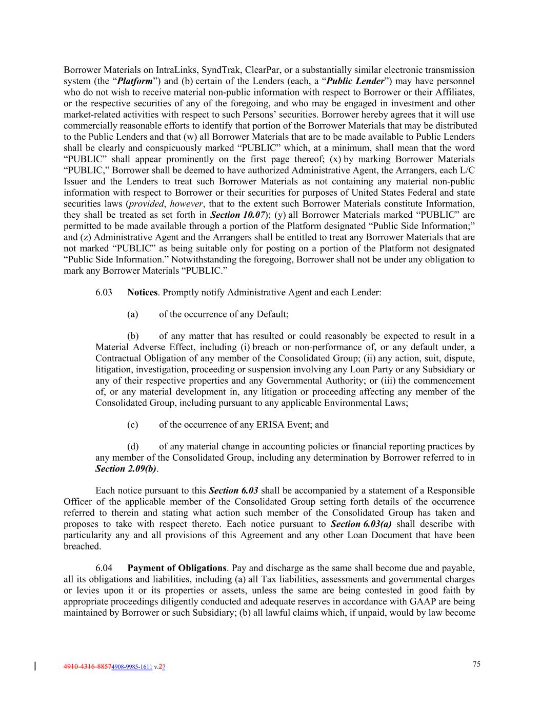 4910-4316-88574908-9985-1611 v.27 75 Borrower Materials on IntraLinks, SyndTrak, ClearPar, or a substantially similar electronic transmission system (the “Platform”) and (b) certain of the Lenders (each, a “Public Lender”) may have personnel who do not wish to receive material non-public information with respect to Borrower or their Affiliates, or the respective securities of any of the foregoing, and who may be engaged in investment and other market-related activities with respect to such Persons’ securities. Borrower hereby agrees that it will use commercially reasonable efforts to identify that portion of the Borrower Materials that may be distributed to the Public Lenders and that (w) all Borrower Materials that are to be made available to Public Lenders shall be clearly and conspicuously marked “PUBLIC” which, at a minimum, shall mean that the word “PUBLIC” shall appear prominently on the first page thereof; (x) by marking Borrower Materials “PUBLIC,” Borrower shall be deemed to have authorized Administrative Agent, the Arrangers, each L/C Issuer and the Lenders to treat such Borrower Materials as not containing any material non-public information with respect to Borrower or their securities for purposes of United States Federal and state securities laws (provided, however, that to the extent such Borrower Materials constitute Information, they shall be treated as set forth in Section 10.07); (y) all Borrower Materials marked “PUBLIC” are permitted to be made available through a portion of the Platform designated “Public Side Information;” and (z) Administrative Agent and the Arrangers shall be entitled to treat any Borrower Materials that are not marked “PUBLIC” as being suitable only for posting on a portion of the Platform not designated “Public Side Information.” Notwithstanding the foregoing, Borrower shall not be under any obligation to mark any Borrower Materials “PUBLIC.” 6.03 Notices. Promptly notify Administrative Agent and each Lender: (a) of the occurrence of any Default; (b) of any matter that has resulted or could reasonably be expected to result in a Material Adverse Effect, including (i) breach or non-performance of, or any default under, a Contractual Obligation of any member of the Consolidated Group; (ii) any action, suit, dispute, litigation, investigation, proceeding or suspension involving any Loan Party or any Subsidiary or any of their respective properties and any Governmental Authority; or (iii) the commencement of, or any material development in, any litigation or proceeding affecting any member of the Consolidated Group, including pursuant to any applicable Environmental Laws; (c) of the occurrence of any ERISA Event; and (d) of any material change in accounting policies or financial reporting practices by any member of the Consolidated Group, including any determination by Borrower referred to in Section 2.09(b). Each notice pursuant to this Section 6.03 shall be accompanied by a statement of a Responsible Officer of the applicable member of the Consolidated Group setting forth details of the occurrence referred to therein and stating what action such member of the Consolidated Group has taken and proposes to take with respect thereto. Each notice pursuant to Section 6.03(a) shall describe with particularity any and all provisions of this Agreement and any other Loan Document that have been breached. 6.04 Payment of Obligations. Pay and discharge as the same shall become due and payable, all its obligations and liabilities, including (a) all Tax liabilities, assessments and governmental charges or levies upon it or its properties or assets, unless the same are being contested in good faith by appropriate proceedings diligently conducted and adequate reserves in accordance with GAAP are being maintained by Borrower or such Subsidiary; (b) all lawful claims which, if unpaid, would by law become