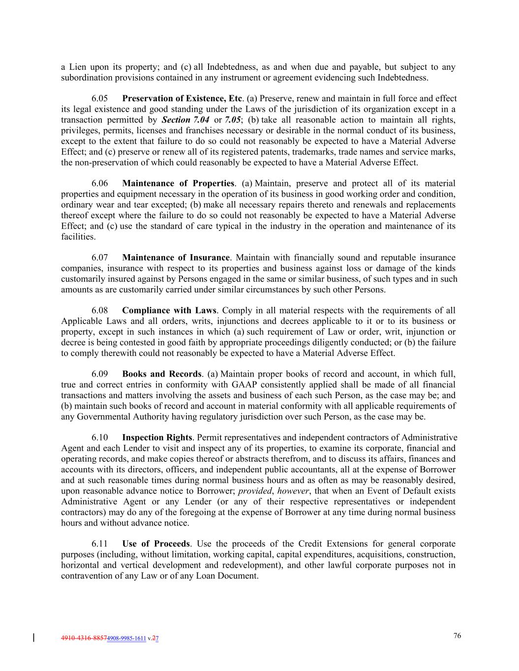 4910-4316-88574908-9985-1611 v.27 76 a Lien upon its property; and (c) all Indebtedness, as and when due and payable, but subject to any subordination provisions contained in any instrument or agreement evidencing such Indebtedness. 6.05 Preservation of Existence, Etc. (a) Preserve, renew and maintain in full force and effect its legal existence and good standing under the Laws of the jurisdiction of its organization except in a transaction permitted by Section 7.04 or 7.05; (b) take all reasonable action to maintain all rights, privileges, permits, licenses and franchises necessary or desirable in the normal conduct of its business, except to the extent that failure to do so could not reasonably be expected to have a Material Adverse Effect; and (c) preserve or renew all of its registered patents, trademarks, trade names and service marks, the non-preservation of which could reasonably be expected to have a Material Adverse Effect. 6.06 Maintenance of Properties. (a) Maintain, preserve and protect all of its material properties and equipment necessary in the operation of its business in good working order and condition, ordinary wear and tear excepted; (b) make all necessary repairs thereto and renewals and replacements thereof except where the failure to do so could not reasonably be expected to have a Material Adverse Effect; and (c) use the standard of care typical in the industry in the operation and maintenance of its facilities. 6.07 Maintenance of Insurance. Maintain with financially sound and reputable insurance companies, insurance with respect to its properties and business against loss or damage of the kinds customarily insured against by Persons engaged in the same or similar business, of such types and in such amounts as are customarily carried under similar circumstances by such other Persons. 6.08 Compliance with Laws. Comply in all material respects with the requirements of all Applicable Laws and all orders, writs, injunctions and decrees applicable to it or to its business or property, except in such instances in which (a) such requirement of Law or order, writ, injunction or decree is being contested in good faith by appropriate proceedings diligently conducted; or (b) the failure to comply therewith could not reasonably be expected to have a Material Adverse Effect. 6.09 Books and Records. (a) Maintain proper books of record and account, in which full, true and correct entries in conformity with GAAP consistently applied shall be made of all financial transactions and matters involving the assets and business of each such Person, as the case may be; and (b) maintain such books of record and account in material conformity with all applicable requirements of any Governmental Authority having regulatory jurisdiction over such Person, as the case may be. 6.10 Inspection Rights. Permit representatives and independent contractors of Administrative Agent and each Lender to visit and inspect any of its properties, to examine its corporate, financial and operating records, and make copies thereof or abstracts therefrom, and to discuss its affairs, finances and accounts with its directors, officers, and independent public accountants, all at the expense of Borrower and at such reasonable times during normal business hours and as often as may be reasonably desired, upon reasonable advance notice to Borrower; provided, however, that when an Event of Default exists Administrative Agent or any Lender (or any of their respective representatives or independent contractors) may do any of the foregoing at the expense of Borrower at any time during normal business hours and without advance notice. 6.11 Use of Proceeds. Use the proceeds of the Credit Extensions for general corporate purposes (including, without limitation, working capital, capital expenditures, acquisitions, construction, horizontal and vertical development and redevelopment), and other lawful corporate purposes not in contravention of any Law or of any Loan Document.