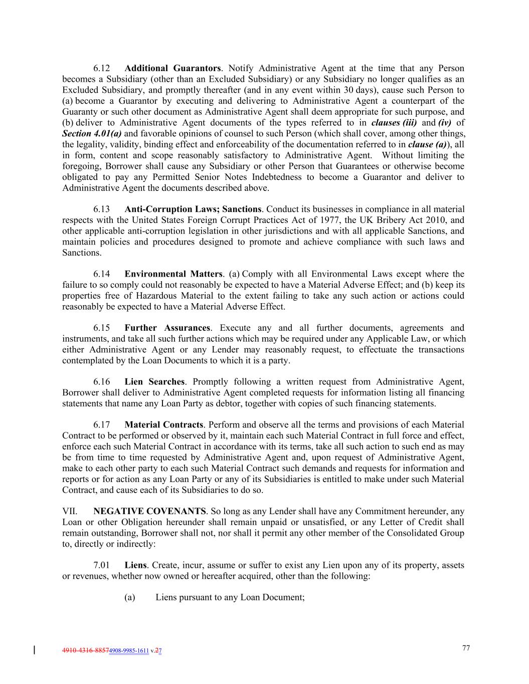 4910-4316-88574908-9985-1611 v.27 77 6.12 Additional Guarantors. Notify Administrative Agent at the time that any Person becomes a Subsidiary (other than an Excluded Subsidiary) or any Subsidiary no longer qualifies as an Excluded Subsidiary, and promptly thereafter (and in any event within 30 days), cause such Person to (a) become a Guarantor by executing and delivering to Administrative Agent a counterpart of the Guaranty or such other document as Administrative Agent shall deem appropriate for such purpose, and (b) deliver to Administrative Agent documents of the types referred to in clauses (iii) and (iv) of Section 4.01(a) and favorable opinions of counsel to such Person (which shall cover, among other things, the legality, validity, binding effect and enforceability of the documentation referred to in clause (a)), all in form, content and scope reasonably satisfactory to Administrative Agent. Without limiting the foregoing, Borrower shall cause any Subsidiary or other Person that Guarantees or otherwise become obligated to pay any Permitted Senior Notes Indebtedness to become a Guarantor and deliver to Administrative Agent the documents described above. 6.13 Anti-Corruption Laws; Sanctions. Conduct its businesses in compliance in all material respects with the United States Foreign Corrupt Practices Act of 1977, the UK Bribery Act 2010, and other applicable anti-corruption legislation in other jurisdictions and with all applicable Sanctions, and maintain policies and procedures designed to promote and achieve compliance with such laws and Sanctions. 6.14 Environmental Matters. (a) Comply with all Environmental Laws except where the failure to so comply could not reasonably be expected to have a Material Adverse Effect; and (b) keep its properties free of Hazardous Material to the extent failing to take any such action or actions could reasonably be expected to have a Material Adverse Effect. 6.15 Further Assurances. Execute any and all further documents, agreements and instruments, and take all such further actions which may be required under any Applicable Law, or which either Administrative Agent or any Lender may reasonably request, to effectuate the transactions contemplated by the Loan Documents to which it is a party. 6.16 Lien Searches. Promptly following a written request from Administrative Agent, Borrower shall deliver to Administrative Agent completed requests for information listing all financing statements that name any Loan Party as debtor, together with copies of such financing statements. 6.17 Material Contracts. Perform and observe all the terms and provisions of each Material Contract to be performed or observed by it, maintain each such Material Contract in full force and effect, enforce each such Material Contract in accordance with its terms, take all such action to such end as may be from time to time requested by Administrative Agent and, upon request of Administrative Agent, make to each other party to each such Material Contract such demands and requests for information and reports or for action as any Loan Party or any of its Subsidiaries is entitled to make under such Material Contract, and cause each of its Subsidiaries to do so. VII. NEGATIVE COVENANTS. So long as any Lender shall have any Commitment hereunder, any Loan or other Obligation hereunder shall remain unpaid or unsatisfied, or any Letter of Credit shall remain outstanding, Borrower shall not, nor shall it permit any other member of the Consolidated Group to, directly or indirectly: 7.01 Liens. Create, incur, assume or suffer to exist any Lien upon any of its property, assets or revenues, whether now owned or hereafter acquired, other than the following: (a) Liens pursuant to any Loan Document;