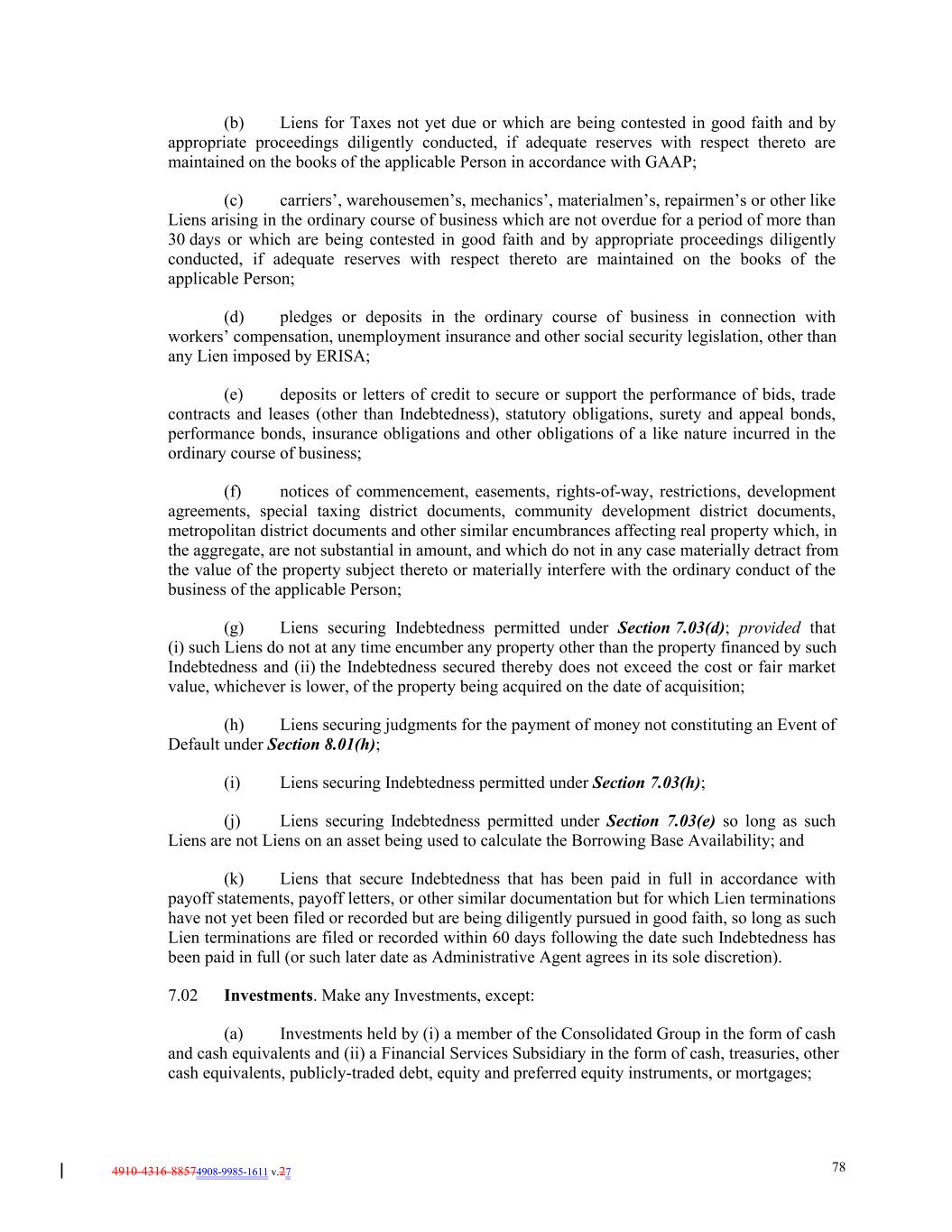 4910-4316-88574908-9985-1611 v.27 78 (b) Liens for Taxes not yet due or which are being contested in good faith and by appropriate proceedings diligently conducted, if adequate reserves with respect thereto are maintained on the books of the applicable Person in accordance with GAAP; (c) carriers’, warehousemen’s, mechanics’, materialmen’s, repairmen’s or other like Liens arising in the ordinary course of business which are not overdue for a period of more than 30 days or which are being contested in good faith and by appropriate proceedings diligently conducted, if adequate reserves with respect thereto are maintained on the books of the applicable Person; (d) pledges or deposits in the ordinary course of business in connection with workers’ compensation, unemployment insurance and other social security legislation, other than any Lien imposed by ERISA; (e) deposits or letters of credit to secure or support the performance of bids, trade contracts and leases (other than Indebtedness), statutory obligations, surety and appeal bonds, performance bonds, insurance obligations and other obligations of a like nature incurred in the ordinary course of business; (f) notices of commencement, easements, rights-of-way, restrictions, development agreements, special taxing district documents, community development district documents, metropolitan district documents and other similar encumbrances affecting real property which, in the aggregate, are not substantial in amount, and which do not in any case materially detract from the value of the property subject thereto or materially interfere with the ordinary conduct of the business of the applicable Person; (g) Liens securing Indebtedness permitted under Section 7.03(d); provided that (i) such Liens do not at any time encumber any property other than the property financed by such Indebtedness and (ii) the Indebtedness secured thereby does not exceed the cost or fair market value, whichever is lower, of the property being acquired on the date of acquisition; (h) Liens securing judgments for the payment of money not constituting an Event of Default under Section 8.01(h); (i) Liens securing Indebtedness permitted under Section 7.03(h); (j) Liens securing Indebtedness permitted under Section 7.03(e) so long as such Liens are not Liens on an asset being used to calculate the Borrowing Base Availability; and (k) Liens that secure Indebtedness that has been paid in full in accordance with payoff statements, payoff letters, or other similar documentation but for which Lien terminations have not yet been filed or recorded but are being diligently pursued in good faith, so long as such Lien terminations are filed or recorded within 60 days following the date such Indebtedness has been paid in full (or such later date as Administrative Agent agrees in its sole discretion). 7.02 Investments. Make any Investments, except: (a) Investments held by (i) a member of the Consolidated Group in the form of cash and cash equivalents and (ii) a Financial Services Subsidiary in the form of cash, treasuries, other cash equivalents, publicly-traded debt, equity and preferred equity instruments, or mortgages;