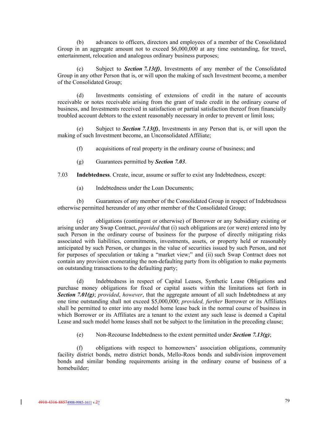 4910-4316-88574908-9985-1611 v.27 79 (b) advances to officers, directors and employees of a member of the Consolidated Group in an aggregate amount not to exceed $6,000,000 at any time outstanding, for travel, entertainment, relocation and analogous ordinary business purposes; (c) Subject to Section 7.13(f), Investments of any member of the Consolidated Group in any other Person that is, or will upon the making of such Investment become, a member of the Consolidated Group; (d) Investments consisting of extensions of credit in the nature of accounts receivable or notes receivable arising from the grant of trade credit in the ordinary course of business, and Investments received in satisfaction or partial satisfaction thereof from financially troubled account debtors to the extent reasonably necessary in order to prevent or limit loss; (e) Subject to Section 7.13(f), Investments in any Person that is, or will upon the making of such Investment become, an Unconsolidated Affiliate; (f) acquisitions of real property in the ordinary course of business; and (g) Guarantees permitted by Section 7.03. 7.03 Indebtedness. Create, incur, assume or suffer to exist any Indebtedness, except: (a) Indebtedness under the Loan Documents; (b) Guarantees of any member of the Consolidated Group in respect of Indebtedness otherwise permitted hereunder of any other member of the Consolidated Group; (c) obligations (contingent or otherwise) of Borrower or any Subsidiary existing or arising under any Swap Contract, provided that (i) such obligations are (or were) entered into by such Person in the ordinary course of business for the purpose of directly mitigating risks associated with liabilities, commitments, investments, assets, or property held or reasonably anticipated by such Person, or changes in the value of securities issued by such Person, and not for purposes of speculation or taking a “market view;” and (ii) such Swap Contract does not contain any provision exonerating the non-defaulting party from its obligation to make payments on outstanding transactions to the defaulting party; (d) Indebtedness in respect of Capital Leases, Synthetic Lease Obligations and purchase money obligations for fixed or capital assets within the limitations set forth in Section 7.01(g); provided, however, that the aggregate amount of all such Indebtedness at any one time outstanding shall not exceed $5,000,000; provided, further Borrower or its Affiliates shall be permitted to enter into any model home lease back in the normal course of business in which Borrower or its Affiliates are a tenant to the extent any such lease is deemed a Capital Lease and such model home leases shall not be subject to the limitation in the preceding clause; (e) Non-Recourse Indebtedness to the extent permitted under Section 7.13(g); (f) obligations with respect to homeowners’ association obligations, community facility district bonds, metro district bonds, Mello-Roos bonds and subdivision improvement bonds and similar bonding requirements arising in the ordinary course of business of a homebuilder;