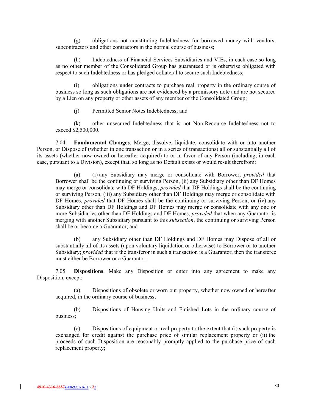4910-4316-88574908-9985-1611 v.27 80 (g) obligations not constituting Indebtedness for borrowed money with vendors, subcontractors and other contractors in the normal course of business; (h) Indebtedness of Financial Services Subsidiaries and VIEs, in each case so long as no other member of the Consolidated Group has guaranteed or is otherwise obligated with respect to such Indebtedness or has pledged collateral to secure such Indebtedness; (i) obligations under contracts to purchase real property in the ordinary course of business so long as such obligations are not evidenced by a promissory note and are not secured by a Lien on any property or other assets of any member of the Consolidated Group; (j) Permitted Senior Notes Indebtedness; and (k) other unsecured Indebtedness that is not Non-Recourse Indebtedness not to exceed $2,500,000. 7.04 Fundamental Changes. Merge, dissolve, liquidate, consolidate with or into another Person, or Dispose of (whether in one transaction or in a series of transactions) all or substantially all of its assets (whether now owned or hereafter acquired) to or in favor of any Person (including, in each case, pursuant to a Division), except that, so long as no Default exists or would result therefrom: (a) (i) any Subsidiary may merge or consolidate with Borrower, provided that Borrower shall be the continuing or surviving Person, (ii) any Subsidiary other than DF Homes may merge or consolidate with DF Holdings, provided that DF Holdings shall be the continuing or surviving Person, (iii) any Subsidiary other than DF Holdings may merge or consolidate with DF Homes, provided that DF Homes shall be the continuing or surviving Person, or (iv) any Subsidiary other than DF Holdings and DF Homes may merge or consolidate with any one or more Subsidiaries other than DF Holdings and DF Homes, provided that when any Guarantor is merging with another Subsidiary pursuant to this subsection, the continuing or surviving Person shall be or become a Guarantor; and (b) any Subsidiary other than DF Holdings and DF Homes may Dispose of all or substantially all of its assets (upon voluntary liquidation or otherwise) to Borrower or to another Subsidiary; provided that if the transferor in such a transaction is a Guarantor, then the transferee must either be Borrower or a Guarantor. 7.05 Dispositions. Make any Disposition or enter into any agreement to make any Disposition, except: (a) Dispositions of obsolete or worn out property, whether now owned or hereafter acquired, in the ordinary course of business; (b) Dispositions of Housing Units and Finished Lots in the ordinary course of business; (c) Dispositions of equipment or real property to the extent that (i) such property is exchanged for credit against the purchase price of similar replacement property or (ii) the proceeds of such Disposition are reasonably promptly applied to the purchase price of such replacement property;