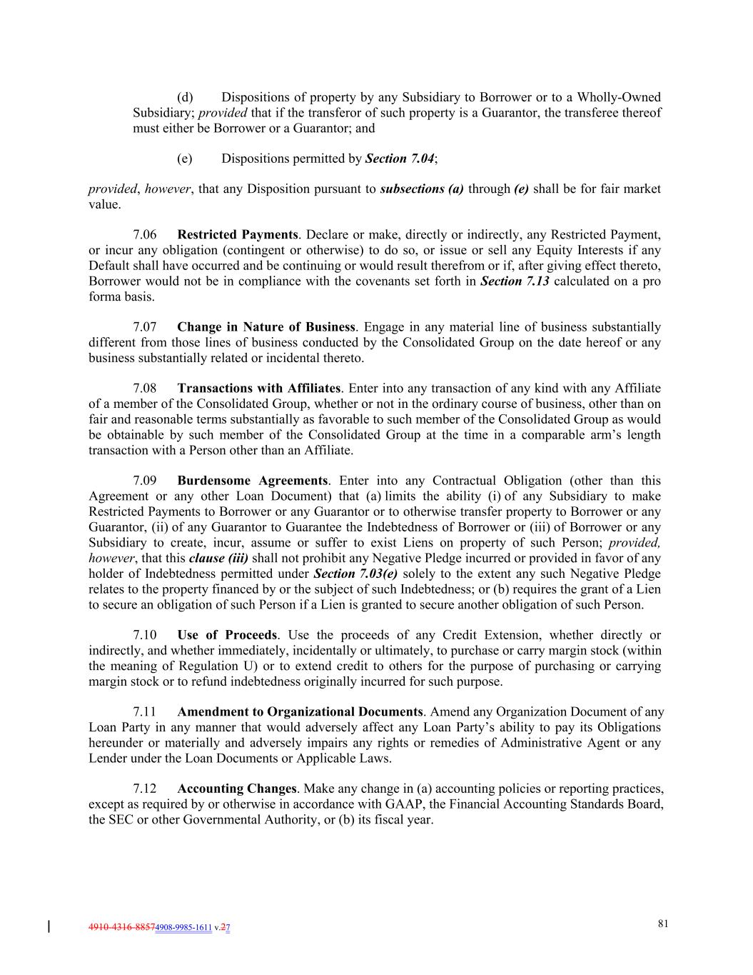 4910-4316-88574908-9985-1611 v.27 81 (d) Dispositions of property by any Subsidiary to Borrower or to a Wholly-Owned Subsidiary; provided that if the transferor of such property is a Guarantor, the transferee thereof must either be Borrower or a Guarantor; and (e) Dispositions permitted by Section 7.04; provided, however, that any Disposition pursuant to subsections (a) through (e) shall be for fair market value. 7.06 Restricted Payments. Declare or make, directly or indirectly, any Restricted Payment, or incur any obligation (contingent or otherwise) to do so, or issue or sell any Equity Interests if any Default shall have occurred and be continuing or would result therefrom or if, after giving effect thereto, Borrower would not be in compliance with the covenants set forth in Section 7.13 calculated on a pro forma basis. 7.07 Change in Nature of Business. Engage in any material line of business substantially different from those lines of business conducted by the Consolidated Group on the date hereof or any business substantially related or incidental thereto. 7.08 Transactions with Affiliates. Enter into any transaction of any kind with any Affiliate of a member of the Consolidated Group, whether or not in the ordinary course of business, other than on fair and reasonable terms substantially as favorable to such member of the Consolidated Group as would be obtainable by such member of the Consolidated Group at the time in a comparable arm’s length transaction with a Person other than an Affiliate. 7.09 Burdensome Agreements. Enter into any Contractual Obligation (other than this Agreement or any other Loan Document) that (a) limits the ability (i) of any Subsidiary to make Restricted Payments to Borrower or any Guarantor or to otherwise transfer property to Borrower or any Guarantor, (ii) of any Guarantor to Guarantee the Indebtedness of Borrower or (iii) of Borrower or any Subsidiary to create, incur, assume or suffer to exist Liens on property of such Person; provided, however, that this clause (iii) shall not prohibit any Negative Pledge incurred or provided in favor of any holder of Indebtedness permitted under Section 7.03(e) solely to the extent any such Negative Pledge relates to the property financed by or the subject of such Indebtedness; or (b) requires the grant of a Lien to secure an obligation of such Person if a Lien is granted to secure another obligation of such Person. 7.10 Use of Proceeds. Use the proceeds of any Credit Extension, whether directly or indirectly, and whether immediately, incidentally or ultimately, to purchase or carry margin stock (within the meaning of Regulation U) or to extend credit to others for the purpose of purchasing or carrying margin stock or to refund indebtedness originally incurred for such purpose. 7.11 Amendment to Organizational Documents. Amend any Organization Document of any Loan Party in any manner that would adversely affect any Loan Party’s ability to pay its Obligations hereunder or materially and adversely impairs any rights or remedies of Administrative Agent or any Lender under the Loan Documents or Applicable Laws. 7.12 Accounting Changes. Make any change in (a) accounting policies or reporting practices, except as required by or otherwise in accordance with GAAP, the Financial Accounting Standards Board, the SEC or other Governmental Authority, or (b) its fiscal year.