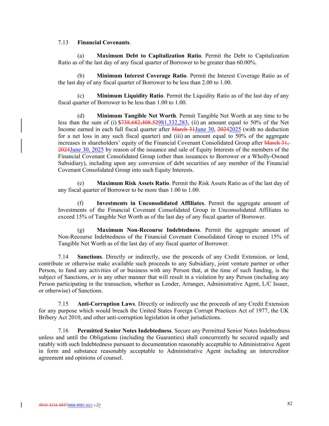 4910-4316-88574908-9985-1611 v.27 82 7.13 Financial Covenants. (a) Maximum Debt to Capitalization Ratio. Permit the Debt to Capitalization Ratio as of the last day of any fiscal quarter of Borrower to be greater than 60.00%. (b) Minimum Interest Coverage Ratio. Permit the Interest Coverage Ratio as of the last day of any fiscal quarter of Borrower to be less than 2.00 to 1.00. (c) Minimum Liquidity Ratio. Permit the Liquidity Ratio as of the last day of any fiscal quarter of Borrower to be less than 1.00 to 1.00. (d) Minimum Tangible Net Worth. Permit Tangible Net Worth at any time to be less than the sum of (i) $738,682,408.52981,332,283, (ii) an amount equal to 50% of the Net Income earned in each full fiscal quarter after March 31June 30, 20242025 (with no deduction for a net loss in any such fiscal quarter) and (iii) an amount equal to 50% of the aggregate increases in shareholders’ equity of the Financial Covenant Consolidated Group after March 31, 2024June 30, 2025 by reason of the issuance and sale of Equity Interests of the members of the Financial Covenant Consolidated Group (other than issuances to Borrower or a Wholly-Owned Subsidiary), including upon any conversion of debt securities of any member of the Financial Covenant Consolidated Group into such Equity Interests. (e) Maximum Risk Assets Ratio. Permit the Risk Assets Ratio as of the last day of any fiscal quarter of Borrower to be more than 1.00 to 1.00. (f) Investments in Unconsolidated Affiliates. Permit the aggregate amount of Investments of the Financial Covenant Consolidated Group in Unconsolidated Affiliates to exceed 15% of Tangible Net Worth as of the last day of any fiscal quarter of Borrower. (g) Maximum Non-Recourse Indebtedness. Permit the aggregate amount of Non-Recourse Indebtedness of the Financial Covenant Consolidated Group to exceed 15% of Tangible Net Worth as of the last day of any fiscal quarter of Borrower. 7.14 Sanctions. Directly or indirectly, use the proceeds of any Credit Extension, or lend, contribute or otherwise make available such proceeds to any Subsidiary, joint venture partner or other Person, to fund any activities of or business with any Person that, at the time of such funding, is the subject of Sanctions, or in any other manner that will result in a violation by any Person (including any Person participating in the transaction, whether as Lender, Arranger, Administrative Agent, L/C Issuer, or otherwise) of Sanctions. 7.15 Anti-Corruption Laws. Directly or indirectly use the proceeds of any Credit Extension for any purpose which would breach the United States Foreign Corrupt Practices Act of 1977, the UK Bribery Act 2010, and other anti-corruption legislation in other jurisdictions. 7.16 Permitted Senior Notes Indebtedness. Secure any Permitted Senior Notes Indebtedness unless and until the Obligations (including the Guaranties) shall concurrently be secured equally and ratably with such Indebtedness pursuant to documentation reasonably acceptable to Administrative Agent in form and substance reasonably acceptable to Administrative Agent including an intercreditor agreement and opinions of counsel.
