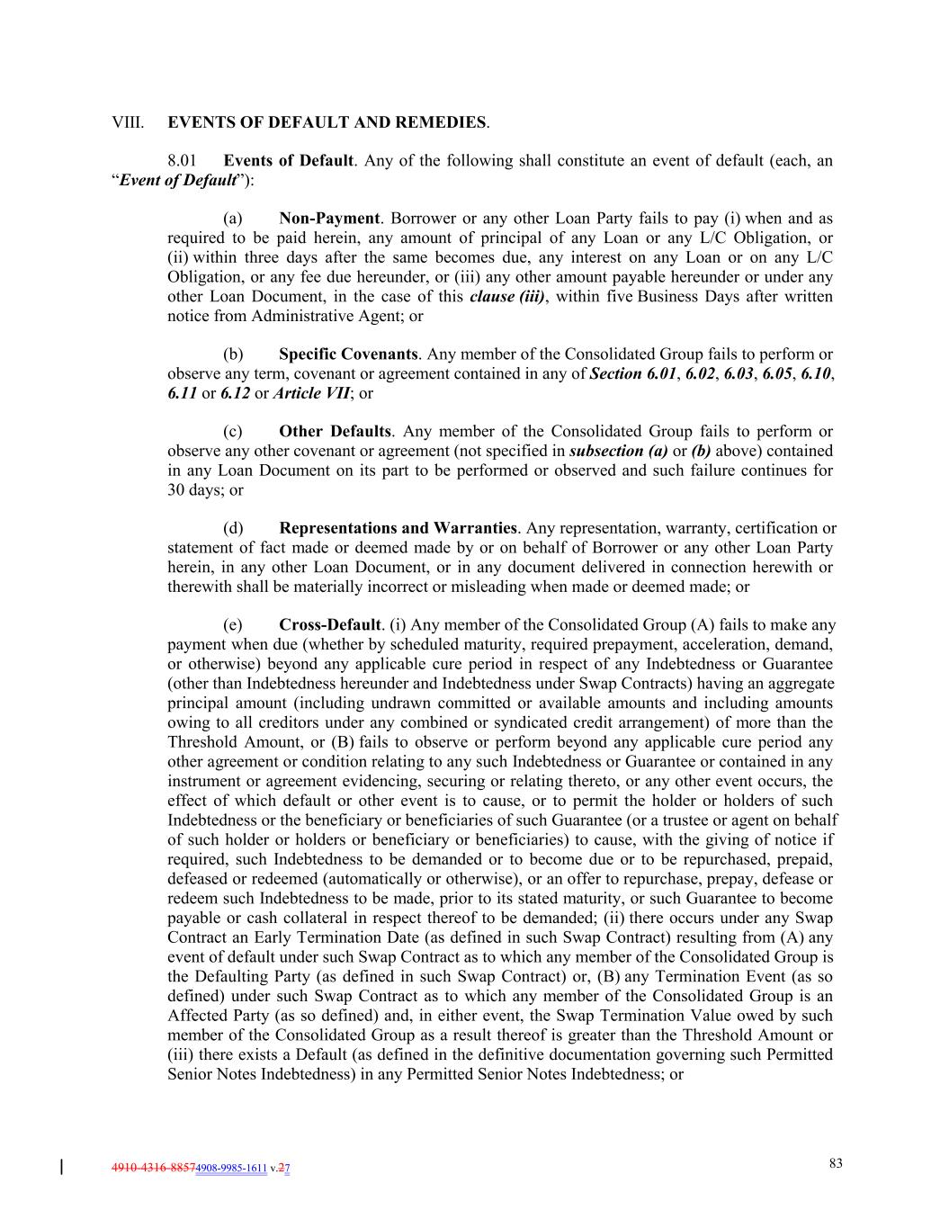 4910-4316-88574908-9985-1611 v.27 83 VIII. EVENTS OF DEFAULT AND REMEDIES. 8.01 Events of Default. Any of the following shall constitute an event of default (each, an “Event of Default”): (a) Non-Payment. Borrower or any other Loan Party fails to pay (i) when and as required to be paid herein, any amount of principal of any Loan or any L/C Obligation, or (ii) within three days after the same becomes due, any interest on any Loan or on any L/C Obligation, or any fee due hereunder, or (iii) any other amount payable hereunder or under any other Loan Document, in the case of this clause (iii), within five Business Days after written notice from Administrative Agent; or (b) Specific Covenants. Any member of the Consolidated Group fails to perform or observe any term, covenant or agreement contained in any of Section 6.01, 6.02, 6.03, 6.05, 6.10, 6.11 or 6.12 or Article VII; or (c) Other Defaults. Any member of the Consolidated Group fails to perform or observe any other covenant or agreement (not specified in subsection (a) or (b) above) contained in any Loan Document on its part to be performed or observed and such failure continues for 30 days; or (d) Representations and Warranties. Any representation, warranty, certification or statement of fact made or deemed made by or on behalf of Borrower or any other Loan Party herein, in any other Loan Document, or in any document delivered in connection herewith or therewith shall be materially incorrect or misleading when made or deemed made; or (e) Cross-Default. (i) Any member of the Consolidated Group (A) fails to make any payment when due (whether by scheduled maturity, required prepayment, acceleration, demand, or otherwise) beyond any applicable cure period in respect of any Indebtedness or Guarantee (other than Indebtedness hereunder and Indebtedness under Swap Contracts) having an aggregate principal amount (including undrawn committed or available amounts and including amounts owing to all creditors under any combined or syndicated credit arrangement) of more than the Threshold Amount, or (B) fails to observe or perform beyond any applicable cure period any other agreement or condition relating to any such Indebtedness or Guarantee or contained in any instrument or agreement evidencing, securing or relating thereto, or any other event occurs, the effect of which default or other event is to cause, or to permit the holder or holders of such Indebtedness or the beneficiary or beneficiaries of such Guarantee (or a trustee or agent on behalf of such holder or holders or beneficiary or beneficiaries) to cause, with the giving of notice if required, such Indebtedness to be demanded or to become due or to be repurchased, prepaid, defeased or redeemed (automatically or otherwise), or an offer to repurchase, prepay, defease or redeem such Indebtedness to be made, prior to its stated maturity, or such Guarantee to become payable or cash collateral in respect thereof to be demanded; (ii) there occurs under any Swap Contract an Early Termination Date (as defined in such Swap Contract) resulting from (A) any event of default under such Swap Contract as to which any member of the Consolidated Group is the Defaulting Party (as defined in such Swap Contract) or, (B) any Termination Event (as so defined) under such Swap Contract as to which any member of the Consolidated Group is an Affected Party (as so defined) and, in either event, the Swap Termination Value owed by such member of the Consolidated Group as a result thereof is greater than the Threshold Amount or (iii) there exists a Default (as defined in the definitive documentation governing such Permitted Senior Notes Indebtedness) in any Permitted Senior Notes Indebtedness; or