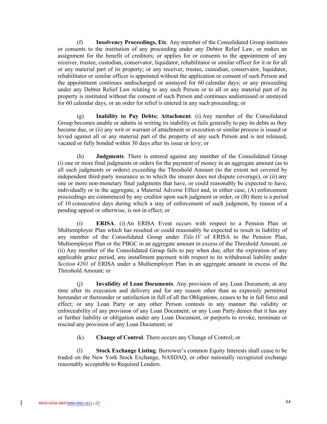 4910-4316-88574908-9985-1611 v.27 84 (f) Insolvency Proceedings, Etc. Any member of the Consolidated Group institutes or consents to the institution of any proceeding under any Debtor Relief Law, or makes an assignment for the benefit of creditors; or applies for or consents to the appointment of any receiver, trustee, custodian, conservator, liquidator, rehabilitator or similar officer for it or for all or any material part of its property; or any receiver, trustee, custodian, conservator, liquidator, rehabilitator or similar officer is appointed without the application or consent of such Person and the appointment continues undischarged or unstayed for 60 calendar days; or any proceeding under any Debtor Relief Law relating to any such Person or to all or any material part of its property is instituted without the consent of such Person and continues undismissed or unstayed for 60 calendar days, or an order for relief is entered in any such proceeding; or (g) Inability to Pay Debts; Attachment. (i) Any member of the Consolidated Group becomes unable or admits in writing its inability or fails generally to pay its debts as they become due, or (ii) any writ or warrant of attachment or execution or similar process is issued or levied against all or any material part of the property of any such Person and is not released, vacated or fully bonded within 30 days after its issue or levy; or (h) Judgments. There is entered against any member of the Consolidated Group (i) one or more final judgments or orders for the payment of money in an aggregate amount (as to all such judgments or orders) exceeding the Threshold Amount (to the extent not covered by independent third-party insurance as to which the insurer does not dispute coverage), or (ii) any one or more non-monetary final judgments that have, or could reasonably be expected to have, individually or in the aggregate, a Material Adverse Effect and, in either case, (A) enforcement proceedings are commenced by any creditor upon such judgment or order, or (B) there is a period of 10 consecutive days during which a stay of enforcement of such judgment, by reason of a pending appeal or otherwise, is not in effect; or (i) ERISA. (i) An ERISA Event occurs with respect to a Pension Plan or Multiemployer Plan which has resulted or could reasonably be expected to result in liability of any member of the Consolidated Group under Title IV of ERISA to the Pension Plan, Multiemployer Plan or the PBGC in an aggregate amount in excess of the Threshold Amount, or (ii) Any member of the Consolidated Group fails to pay when due, after the expiration of any applicable grace period, any installment payment with respect to its withdrawal liability under Section 4201 of ERISA under a Multiemployer Plan in an aggregate amount in excess of the Threshold Amount; or (j) Invalidity of Loan Documents. Any provision of any Loan Document, at any time after its execution and delivery and for any reason other than as expressly permitted hereunder or thereunder or satisfaction in full of all the Obligations, ceases to be in full force and effect; or any Loan Party or any other Person contests in any manner the validity or enforceability of any provision of any Loan Document; or any Loan Party denies that it has any or further liability or obligation under any Loan Document, or purports to revoke, terminate or rescind any provision of any Loan Document; or (k) Change of Control. There occurs any Change of Control; or (l) Stock Exchange Listing. Borrower’s common Equity Interests shall cease to be traded on the New York Stock Exchange, NASDAQ, or other nationally recognized exchange reasonably acceptable to Required Lenders.