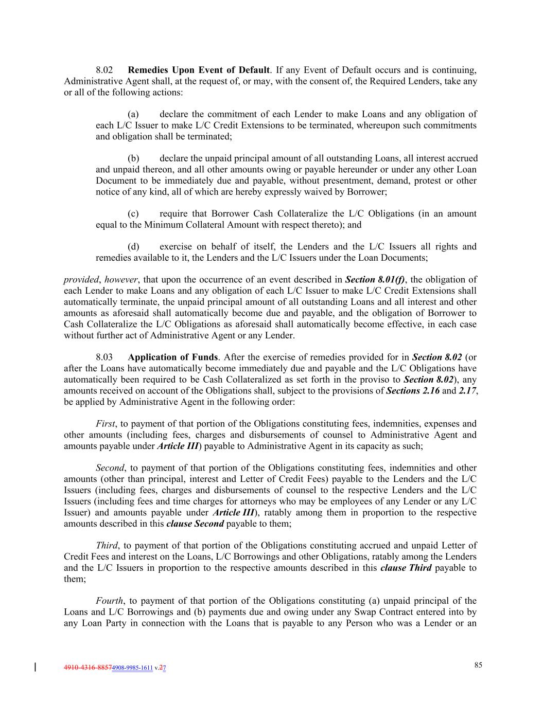 4910-4316-88574908-9985-1611 v.27 85 8.02 Remedies Upon Event of Default. If any Event of Default occurs and is continuing, Administrative Agent shall, at the request of, or may, with the consent of, the Required Lenders, take any or all of the following actions: (a) declare the commitment of each Lender to make Loans and any obligation of each L/C Issuer to make L/C Credit Extensions to be terminated, whereupon such commitments and obligation shall be terminated; (b) declare the unpaid principal amount of all outstanding Loans, all interest accrued and unpaid thereon, and all other amounts owing or payable hereunder or under any other Loan Document to be immediately due and payable, without presentment, demand, protest or other notice of any kind, all of which are hereby expressly waived by Borrower; (c) require that Borrower Cash Collateralize the L/C Obligations (in an amount equal to the Minimum Collateral Amount with respect thereto); and (d) exercise on behalf of itself, the Lenders and the L/C Issuers all rights and remedies available to it, the Lenders and the L/C Issuers under the Loan Documents; provided, however, that upon the occurrence of an event described in Section 8.01(f), the obligation of each Lender to make Loans and any obligation of each L/C Issuer to make L/C Credit Extensions shall automatically terminate, the unpaid principal amount of all outstanding Loans and all interest and other amounts as aforesaid shall automatically become due and payable, and the obligation of Borrower to Cash Collateralize the L/C Obligations as aforesaid shall automatically become effective, in each case without further act of Administrative Agent or any Lender. 8.03 Application of Funds. After the exercise of remedies provided for in Section 8.02 (or after the Loans have automatically become immediately due and payable and the L/C Obligations have automatically been required to be Cash Collateralized as set forth in the proviso to Section 8.02), any amounts received on account of the Obligations shall, subject to the provisions of Sections 2.16 and 2.17, be applied by Administrative Agent in the following order: First, to payment of that portion of the Obligations constituting fees, indemnities, expenses and other amounts (including fees, charges and disbursements of counsel to Administrative Agent and amounts payable under Article III) payable to Administrative Agent in its capacity as such; Second, to payment of that portion of the Obligations constituting fees, indemnities and other amounts (other than principal, interest and Letter of Credit Fees) payable to the Lenders and the L/C Issuers (including fees, charges and disbursements of counsel to the respective Lenders and the L/C Issuers (including fees and time charges for attorneys who may be employees of any Lender or any L/C Issuer) and amounts payable under Article III), ratably among them in proportion to the respective amounts described in this clause Second payable to them; Third, to payment of that portion of the Obligations constituting accrued and unpaid Letter of Credit Fees and interest on the Loans, L/C Borrowings and other Obligations, ratably among the Lenders and the L/C Issuers in proportion to the respective amounts described in this clause Third payable to them; Fourth, to payment of that portion of the Obligations constituting (a) unpaid principal of the Loans and L/C Borrowings and (b) payments due and owing under any Swap Contract entered into by any Loan Party in connection with the Loans that is payable to any Person who was a Lender or an