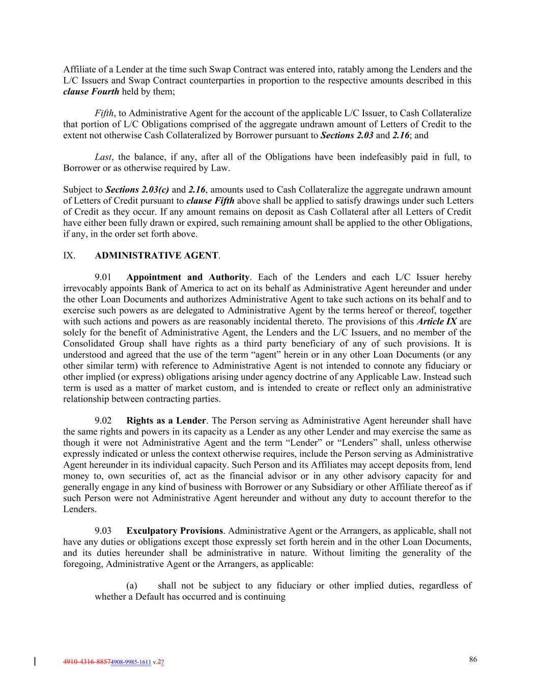 4910-4316-88574908-9985-1611 v.27 86 Affiliate of a Lender at the time such Swap Contract was entered into, ratably among the Lenders and the L/C Issuers and Swap Contract counterparties in proportion to the respective amounts described in this clause Fourth held by them; Fifth, to Administrative Agent for the account of the applicable L/C Issuer, to Cash Collateralize that portion of L/C Obligations comprised of the aggregate undrawn amount of Letters of Credit to the extent not otherwise Cash Collateralized by Borrower pursuant to Sections 2.03 and 2.16; and Last, the balance, if any, after all of the Obligations have been indefeasibly paid in full, to Borrower or as otherwise required by Law. Subject to Sections 2.03(c) and 2.16, amounts used to Cash Collateralize the aggregate undrawn amount of Letters of Credit pursuant to clause Fifth above shall be applied to satisfy drawings under such Letters of Credit as they occur. If any amount remains on deposit as Cash Collateral after all Letters of Credit have either been fully drawn or expired, such remaining amount shall be applied to the other Obligations, if any, in the order set forth above. IX. ADMINISTRATIVE AGENT. 9.01 Appointment and Authority. Each of the Lenders and each L/C Issuer hereby irrevocably appoints Bank of America to act on its behalf as Administrative Agent hereunder and under the other Loan Documents and authorizes Administrative Agent to take such actions on its behalf and to exercise such powers as are delegated to Administrative Agent by the terms hereof or thereof, together with such actions and powers as are reasonably incidental thereto. The provisions of this Article IX are solely for the benefit of Administrative Agent, the Lenders and the L/C Issuers, and no member of the Consolidated Group shall have rights as a third party beneficiary of any of such provisions. It is understood and agreed that the use of the term “agent” herein or in any other Loan Documents (or any other similar term) with reference to Administrative Agent is not intended to connote any fiduciary or other implied (or express) obligations arising under agency doctrine of any Applicable Law. Instead such term is used as a matter of market custom, and is intended to create or reflect only an administrative relationship between contracting parties. 9.02 Rights as a Lender. The Person serving as Administrative Agent hereunder shall have the same rights and powers in its capacity as a Lender as any other Lender and may exercise the same as though it were not Administrative Agent and the term “Lender” or “Lenders” shall, unless otherwise expressly indicated or unless the context otherwise requires, include the Person serving as Administrative Agent hereunder in its individual capacity. Such Person and its Affiliates may accept deposits from, lend money to, own securities of, act as the financial advisor or in any other advisory capacity for and generally engage in any kind of business with Borrower or any Subsidiary or other Affiliate thereof as if such Person were not Administrative Agent hereunder and without any duty to account therefor to the Lenders. 9.03 Exculpatory Provisions. Administrative Agent or the Arrangers, as applicable, shall not have any duties or obligations except those expressly set forth herein and in the other Loan Documents, and its duties hereunder shall be administrative in nature. Without limiting the generality of the foregoing, Administrative Agent or the Arrangers, as applicable: (a) shall not be subject to any fiduciary or other implied duties, regardless of whether a Default has occurred and is continuing