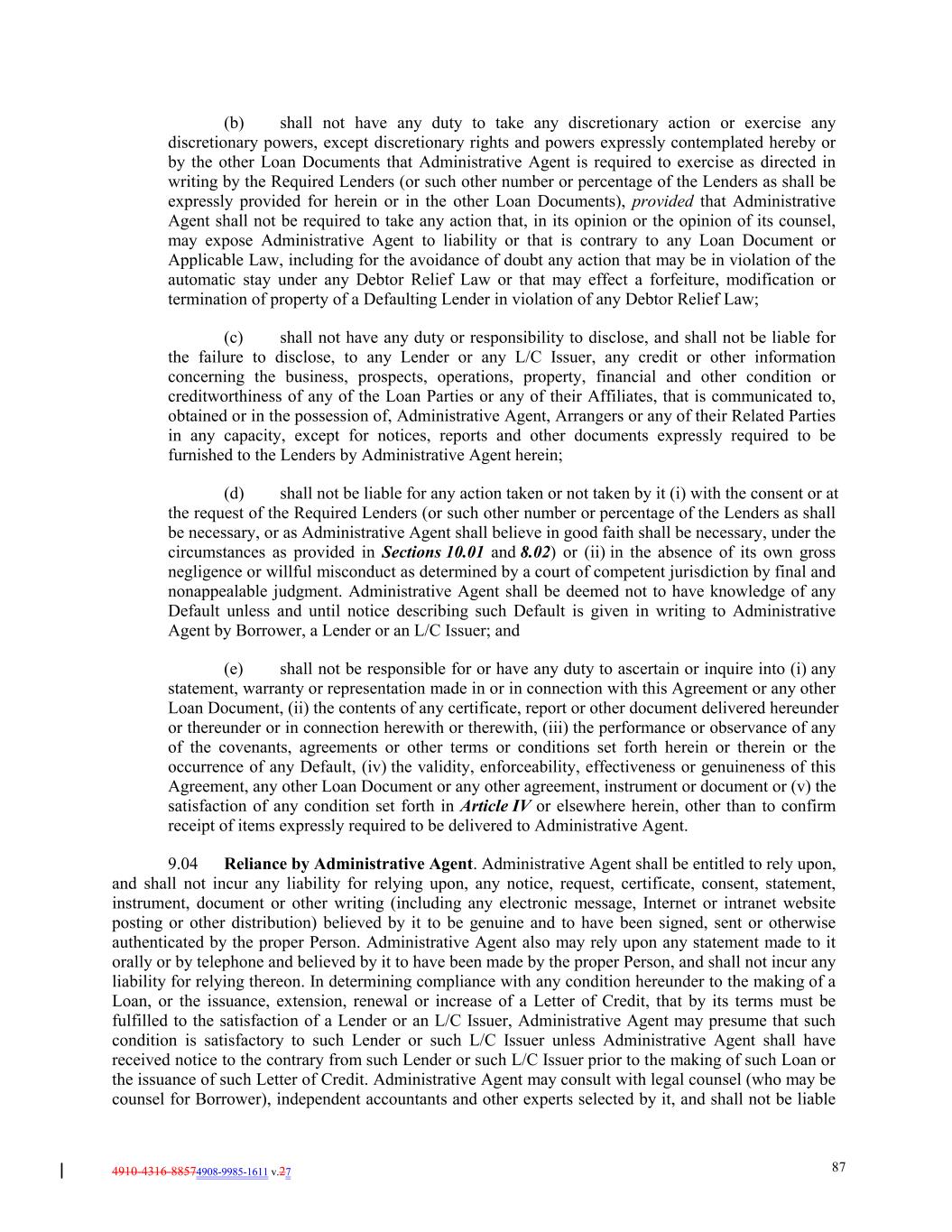 4910-4316-88574908-9985-1611 v.27 87 (b) shall not have any duty to take any discretionary action or exercise any discretionary powers, except discretionary rights and powers expressly contemplated hereby or by the other Loan Documents that Administrative Agent is required to exercise as directed in writing by the Required Lenders (or such other number or percentage of the Lenders as shall be expressly provided for herein or in the other Loan Documents), provided that Administrative Agent shall not be required to take any action that, in its opinion or the opinion of its counsel, may expose Administrative Agent to liability or that is contrary to any Loan Document or Applicable Law, including for the avoidance of doubt any action that may be in violation of the automatic stay under any Debtor Relief Law or that may effect a forfeiture, modification or termination of property of a Defaulting Lender in violation of any Debtor Relief Law; (c) shall not have any duty or responsibility to disclose, and shall not be liable for the failure to disclose, to any Lender or any L/C Issuer, any credit or other information concerning the business, prospects, operations, property, financial and other condition or creditworthiness of any of the Loan Parties or any of their Affiliates, that is communicated to, obtained or in the possession of, Administrative Agent, Arrangers or any of their Related Parties in any capacity, except for notices, reports and other documents expressly required to be furnished to the Lenders by Administrative Agent herein; (d) shall not be liable for any action taken or not taken by it (i) with the consent or at the request of the Required Lenders (or such other number or percentage of the Lenders as shall be necessary, or as Administrative Agent shall believe in good faith shall be necessary, under the circumstances as provided in Sections 10.01 and 8.02) or (ii) in the absence of its own gross negligence or willful misconduct as determined by a court of competent jurisdiction by final and nonappealable judgment. Administrative Agent shall be deemed not to have knowledge of any Default unless and until notice describing such Default is given in writing to Administrative Agent by Borrower, a Lender or an L/C Issuer; and (e) shall not be responsible for or have any duty to ascertain or inquire into (i) any statement, warranty or representation made in or in connection with this Agreement or any other Loan Document, (ii) the contents of any certificate, report or other document delivered hereunder or thereunder or in connection herewith or therewith, (iii) the performance or observance of any of the covenants, agreements or other terms or conditions set forth herein or therein or the occurrence of any Default, (iv) the validity, enforceability, effectiveness or genuineness of this Agreement, any other Loan Document or any other agreement, instrument or document or (v) the satisfaction of any condition set forth in Article IV or elsewhere herein, other than to confirm receipt of items expressly required to be delivered to Administrative Agent. 9.04 Reliance by Administrative Agent. Administrative Agent shall be entitled to rely upon, and shall not incur any liability for relying upon, any notice, request, certificate, consent, statement, instrument, document or other writing (including any electronic message, Internet or intranet website posting or other distribution) believed by it to be genuine and to have been signed, sent or otherwise authenticated by the proper Person. Administrative Agent also may rely upon any statement made to it orally or by telephone and believed by it to have been made by the proper Person, and shall not incur any liability for relying thereon. In determining compliance with any condition hereunder to the making of a Loan, or the issuance, extension, renewal or increase of a Letter of Credit, that by its terms must be fulfilled to the satisfaction of a Lender or an L/C Issuer, Administrative Agent may presume that such condition is satisfactory to such Lender or such L/C Issuer unless Administrative Agent shall have received notice to the contrary from such Lender or such L/C Issuer prior to the making of such Loan or the issuance of such Letter of Credit. Administrative Agent may consult with legal counsel (who may be counsel for Borrower), independent accountants and other experts selected by it, and shall not be liable