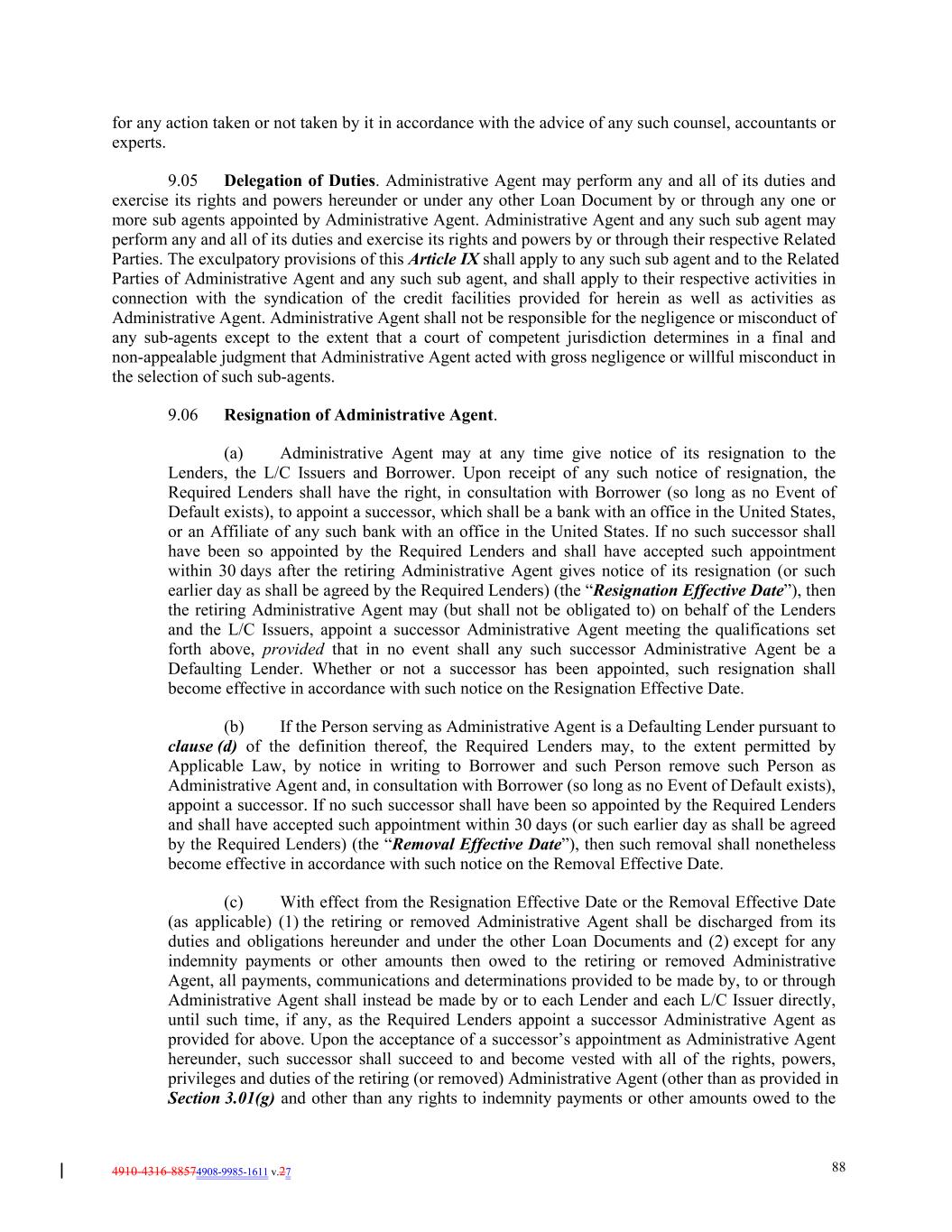 4910-4316-88574908-9985-1611 v.27 88 for any action taken or not taken by it in accordance with the advice of any such counsel, accountants or experts. 9.05 Delegation of Duties. Administrative Agent may perform any and all of its duties and exercise its rights and powers hereunder or under any other Loan Document by or through any one or more sub agents appointed by Administrative Agent. Administrative Agent and any such sub agent may perform any and all of its duties and exercise its rights and powers by or through their respective Related Parties. The exculpatory provisions of this Article IX shall apply to any such sub agent and to the Related Parties of Administrative Agent and any such sub agent, and shall apply to their respective activities in connection with the syndication of the credit facilities provided for herein as well as activities as Administrative Agent. Administrative Agent shall not be responsible for the negligence or misconduct of any sub-agents except to the extent that a court of competent jurisdiction determines in a final and non-appealable judgment that Administrative Agent acted with gross negligence or willful misconduct in the selection of such sub-agents. 9.06 Resignation of Administrative Agent. (a) Administrative Agent may at any time give notice of its resignation to the Lenders, the L/C Issuers and Borrower. Upon receipt of any such notice of resignation, the Required Lenders shall have the right, in consultation with Borrower (so long as no Event of Default exists), to appoint a successor, which shall be a bank with an office in the United States, or an Affiliate of any such bank with an office in the United States. If no such successor shall have been so appointed by the Required Lenders and shall have accepted such appointment within 30 days after the retiring Administrative Agent gives notice of its resignation (or such earlier day as shall be agreed by the Required Lenders) (the “Resignation Effective Date”), then the retiring Administrative Agent may (but shall not be obligated to) on behalf of the Lenders and the L/C Issuers, appoint a successor Administrative Agent meeting the qualifications set forth above, provided that in no event shall any such successor Administrative Agent be a Defaulting Lender. Whether or not a successor has been appointed, such resignation shall become effective in accordance with such notice on the Resignation Effective Date. (b) If the Person serving as Administrative Agent is a Defaulting Lender pursuant to clause (d) of the definition thereof, the Required Lenders may, to the extent permitted by Applicable Law, by notice in writing to Borrower and such Person remove such Person as Administrative Agent and, in consultation with Borrower (so long as no Event of Default exists), appoint a successor. If no such successor shall have been so appointed by the Required Lenders and shall have accepted such appointment within 30 days (or such earlier day as shall be agreed by the Required Lenders) (the “Removal Effective Date”), then such removal shall nonetheless become effective in accordance with such notice on the Removal Effective Date. (c) With effect from the Resignation Effective Date or the Removal Effective Date (as applicable) (1) the retiring or removed Administrative Agent shall be discharged from its duties and obligations hereunder and under the other Loan Documents and (2) except for any indemnity payments or other amounts then owed to the retiring or removed Administrative Agent, all payments, communications and determinations provided to be made by, to or through Administrative Agent shall instead be made by or to each Lender and each L/C Issuer directly, until such time, if any, as the Required Lenders appoint a successor Administrative Agent as provided for above. Upon the acceptance of a successor’s appointment as Administrative Agent hereunder, such successor shall succeed to and become vested with all of the rights, powers, privileges and duties of the retiring (or removed) Administrative Agent (other than as provided in Section 3.01(g) and other than any rights to indemnity payments or other amounts owed to the