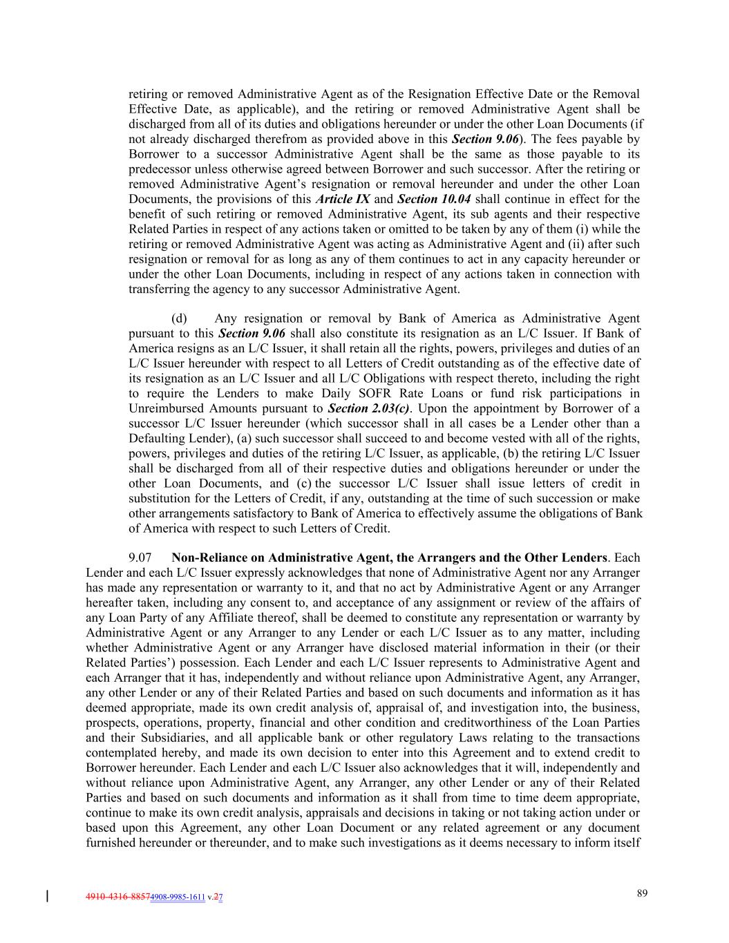 4910-4316-88574908-9985-1611 v.27 89 retiring or removed Administrative Agent as of the Resignation Effective Date or the Removal Effective Date, as applicable), and the retiring or removed Administrative Agent shall be discharged from all of its duties and obligations hereunder or under the other Loan Documents (if not already discharged therefrom as provided above in this Section 9.06). The fees payable by Borrower to a successor Administrative Agent shall be the same as those payable to its predecessor unless otherwise agreed between Borrower and such successor. After the retiring or removed Administrative Agent’s resignation or removal hereunder and under the other Loan Documents, the provisions of this Article IX and Section 10.04 shall continue in effect for the benefit of such retiring or removed Administrative Agent, its sub agents and their respective Related Parties in respect of any actions taken or omitted to be taken by any of them (i) while the retiring or removed Administrative Agent was acting as Administrative Agent and (ii) after such resignation or removal for as long as any of them continues to act in any capacity hereunder or under the other Loan Documents, including in respect of any actions taken in connection with transferring the agency to any successor Administrative Agent. (d) Any resignation or removal by Bank of America as Administrative Agent pursuant to this Section 9.06 shall also constitute its resignation as an L/C Issuer. If Bank of America resigns as an L/C Issuer, it shall retain all the rights, powers, privileges and duties of an L/C Issuer hereunder with respect to all Letters of Credit outstanding as of the effective date of its resignation as an L/C Issuer and all L/C Obligations with respect thereto, including the right to require the Lenders to make Daily SOFR Rate Loans or fund risk participations in Unreimbursed Amounts pursuant to Section 2.03(c). Upon the appointment by Borrower of a successor L/C Issuer hereunder (which successor shall in all cases be a Lender other than a Defaulting Lender), (a) such successor shall succeed to and become vested with all of the rights, powers, privileges and duties of the retiring L/C Issuer, as applicable, (b) the retiring L/C Issuer shall be discharged from all of their respective duties and obligations hereunder or under the other Loan Documents, and (c) the successor L/C Issuer shall issue letters of credit in substitution for the Letters of Credit, if any, outstanding at the time of such succession or make other arrangements satisfactory to Bank of America to effectively assume the obligations of Bank of America with respect to such Letters of Credit. 9.07 Non-Reliance on Administrative Agent, the Arrangers and the Other Lenders. Each Lender and each L/C Issuer expressly acknowledges that none of Administrative Agent nor any Arranger has made any representation or warranty to it, and that no act by Administrative Agent or any Arranger hereafter taken, including any consent to, and acceptance of any assignment or review of the affairs of any Loan Party of any Affiliate thereof, shall be deemed to constitute any representation or warranty by Administrative Agent or any Arranger to any Lender or each L/C Issuer as to any matter, including whether Administrative Agent or any Arranger have disclosed material information in their (or their Related Parties’) possession. Each Lender and each L/C Issuer represents to Administrative Agent and each Arranger that it has, independently and without reliance upon Administrative Agent, any Arranger, any other Lender or any of their Related Parties and based on such documents and information as it has deemed appropriate, made its own credit analysis of, appraisal of, and investigation into, the business, prospects, operations, property, financial and other condition and creditworthiness of the Loan Parties and their Subsidiaries, and all applicable bank or other regulatory Laws relating to the transactions contemplated hereby, and made its own decision to enter into this Agreement and to extend credit to Borrower hereunder. Each Lender and each L/C Issuer also acknowledges that it will, independently and without reliance upon Administrative Agent, any Arranger, any other Lender or any of their Related Parties and based on such documents and information as it shall from time to time deem appropriate, continue to make its own credit analysis, appraisals and decisions in taking or not taking action under or based upon this Agreement, any other Loan Document or any related agreement or any document furnished hereunder or thereunder, and to make such investigations as it deems necessary to inform itself